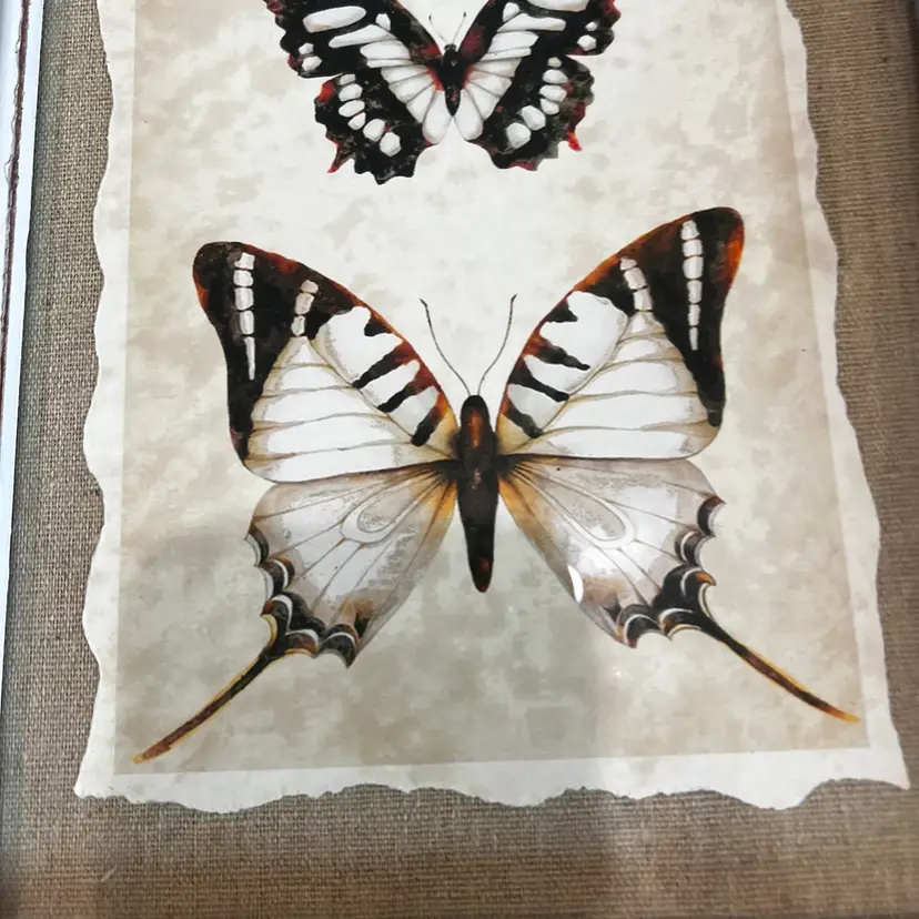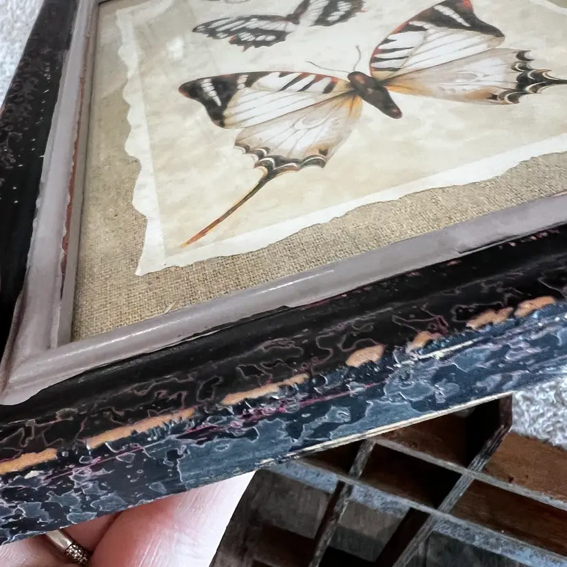 Butterflies are not real. It is paper approximately 9 1/2 x 11 it does have glass with distressed frame.