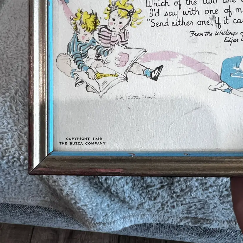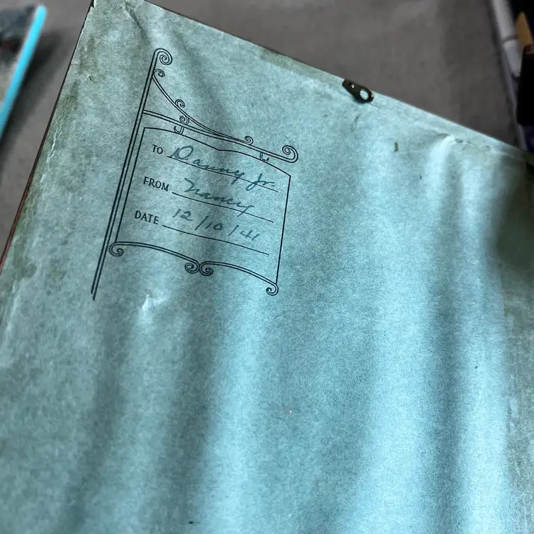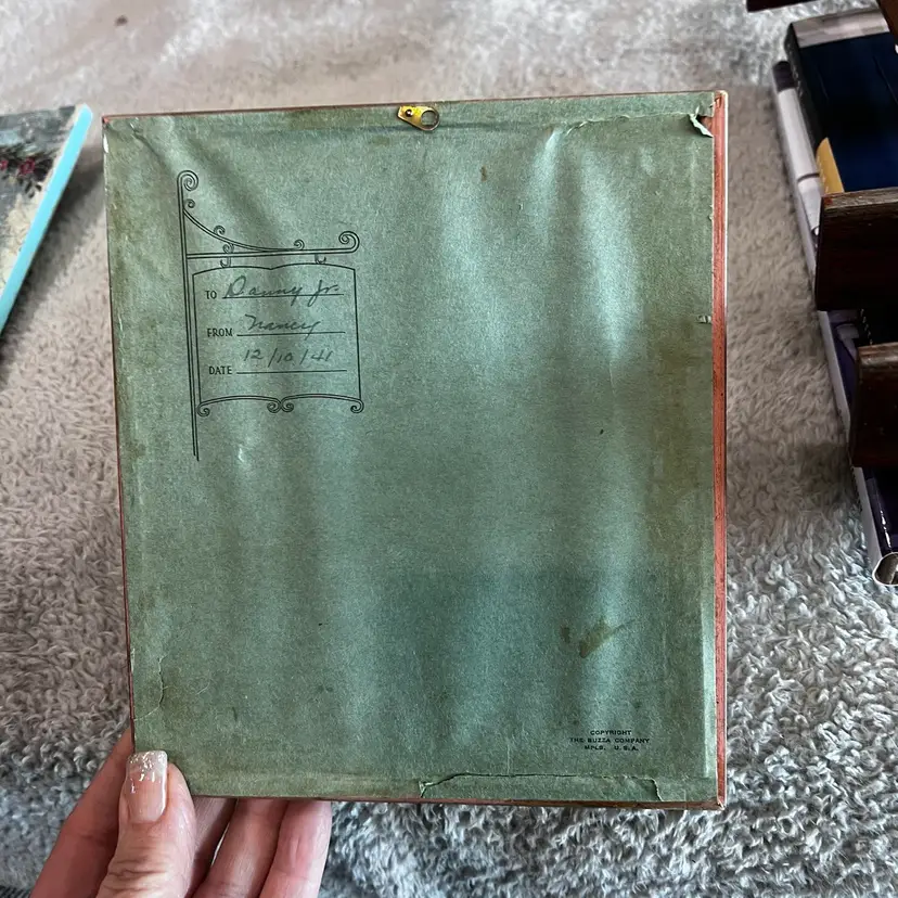 There is no glass there never was glass from 1938. It does have a dedication on the back some damage on the back approximately 6 1/2 x 7 and a.
