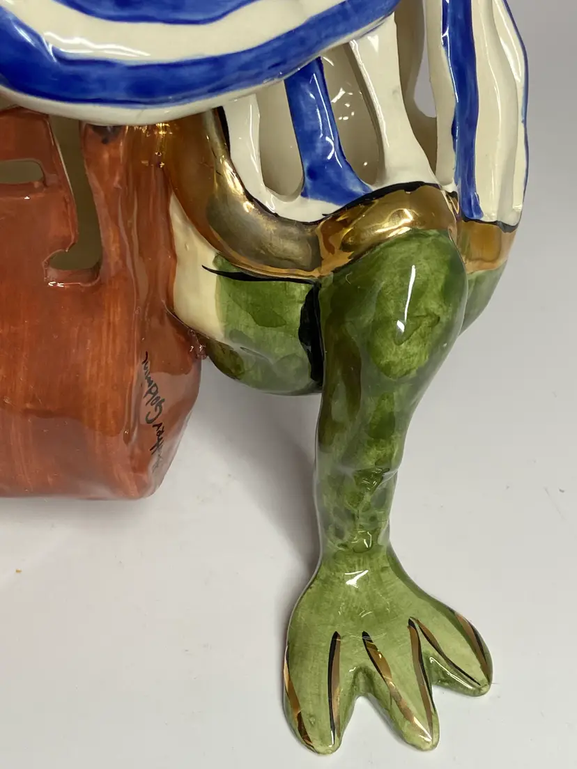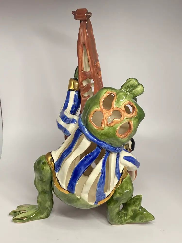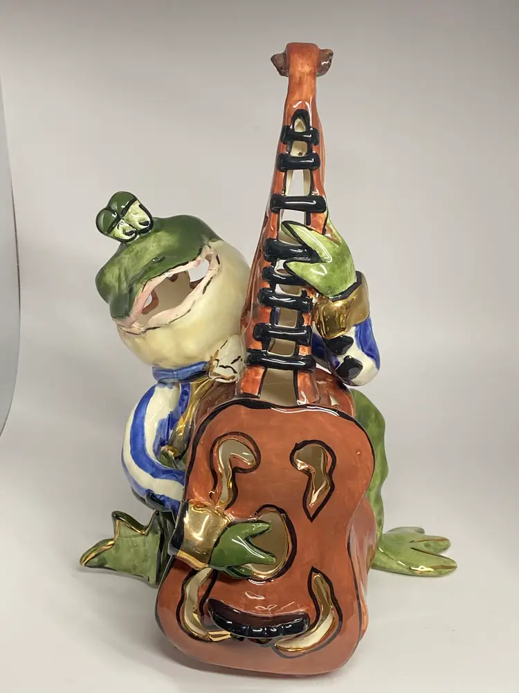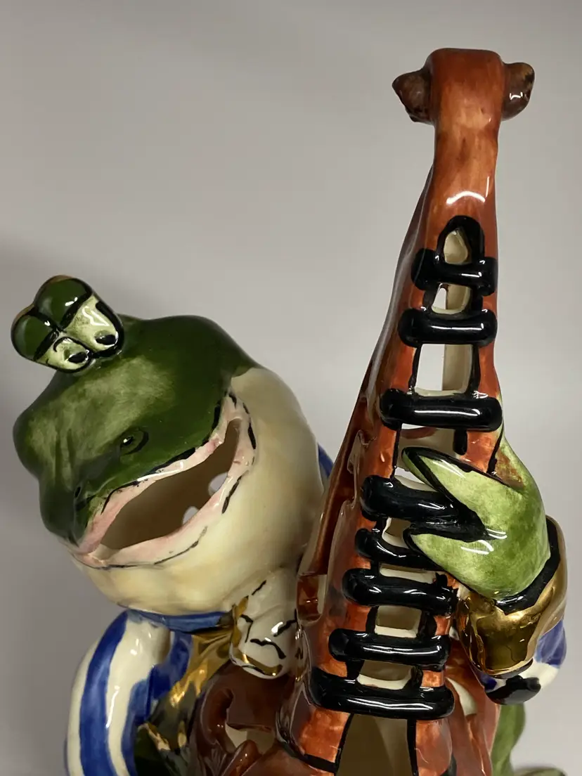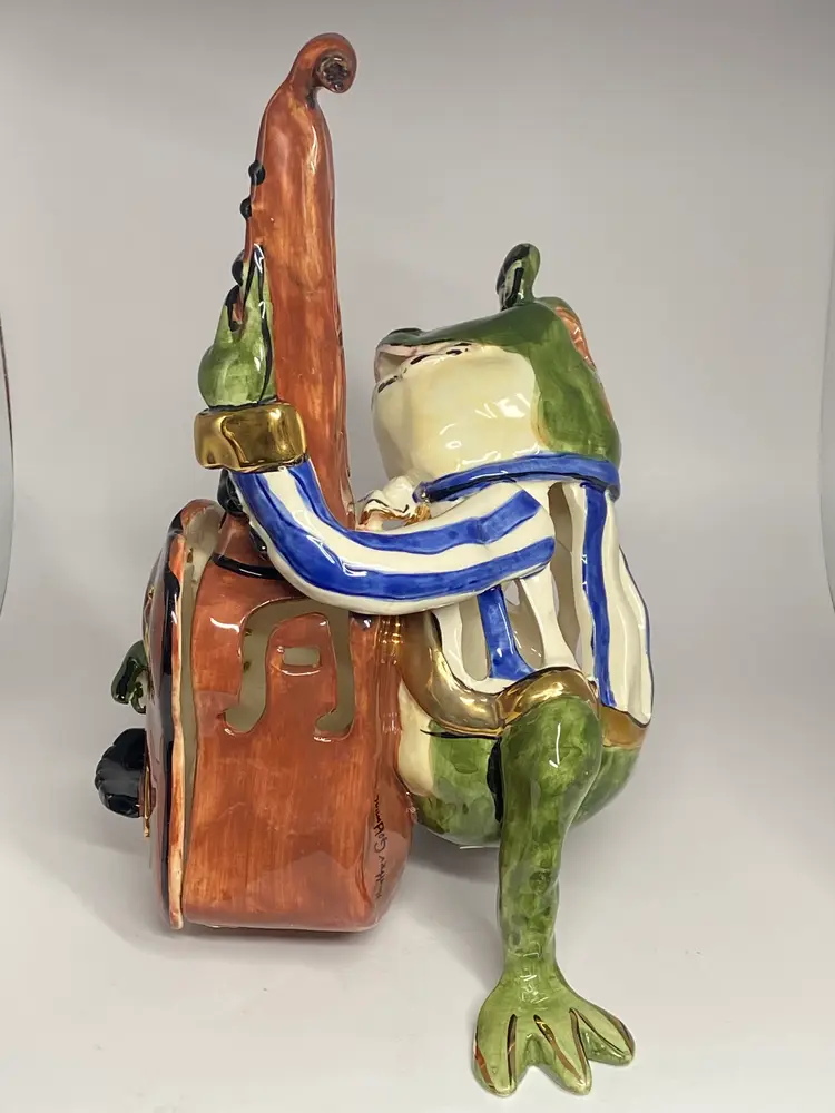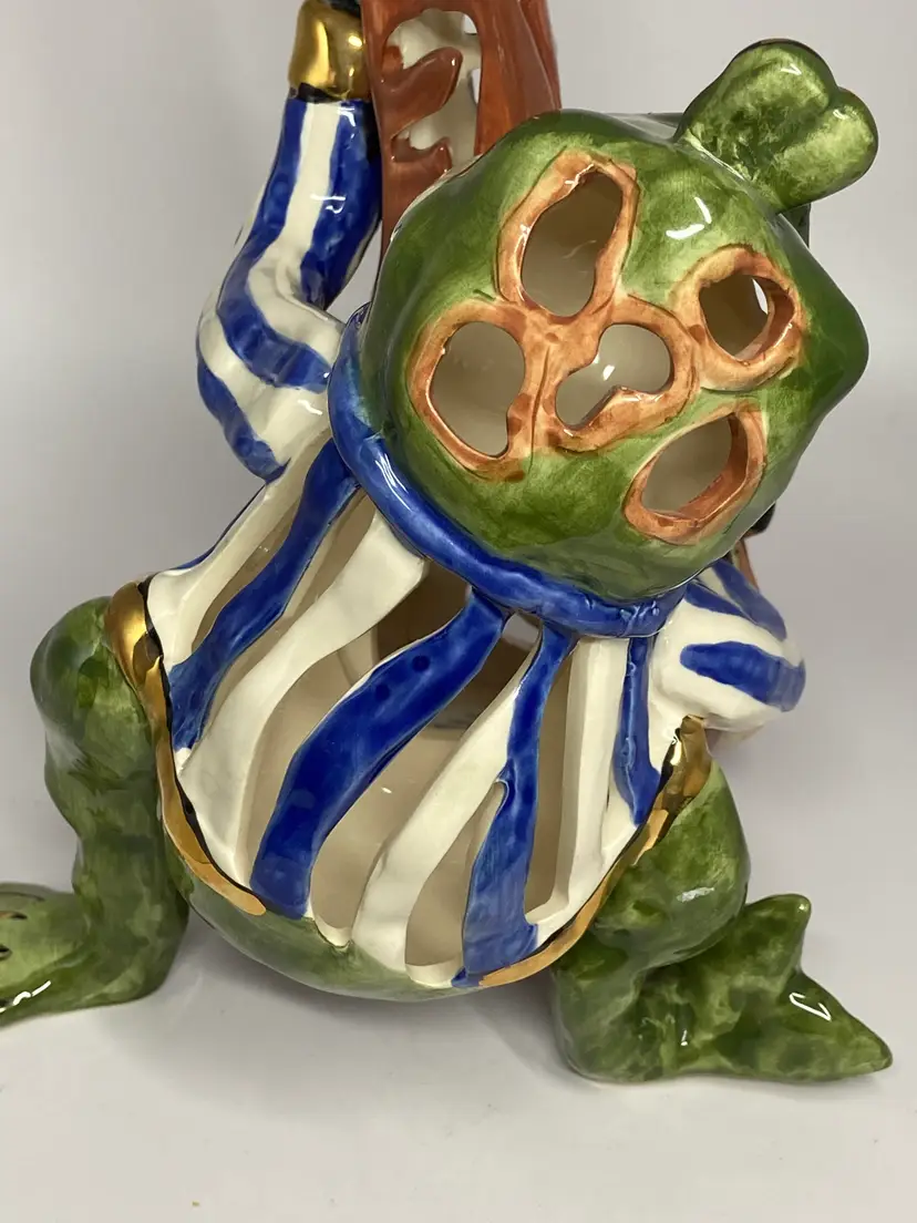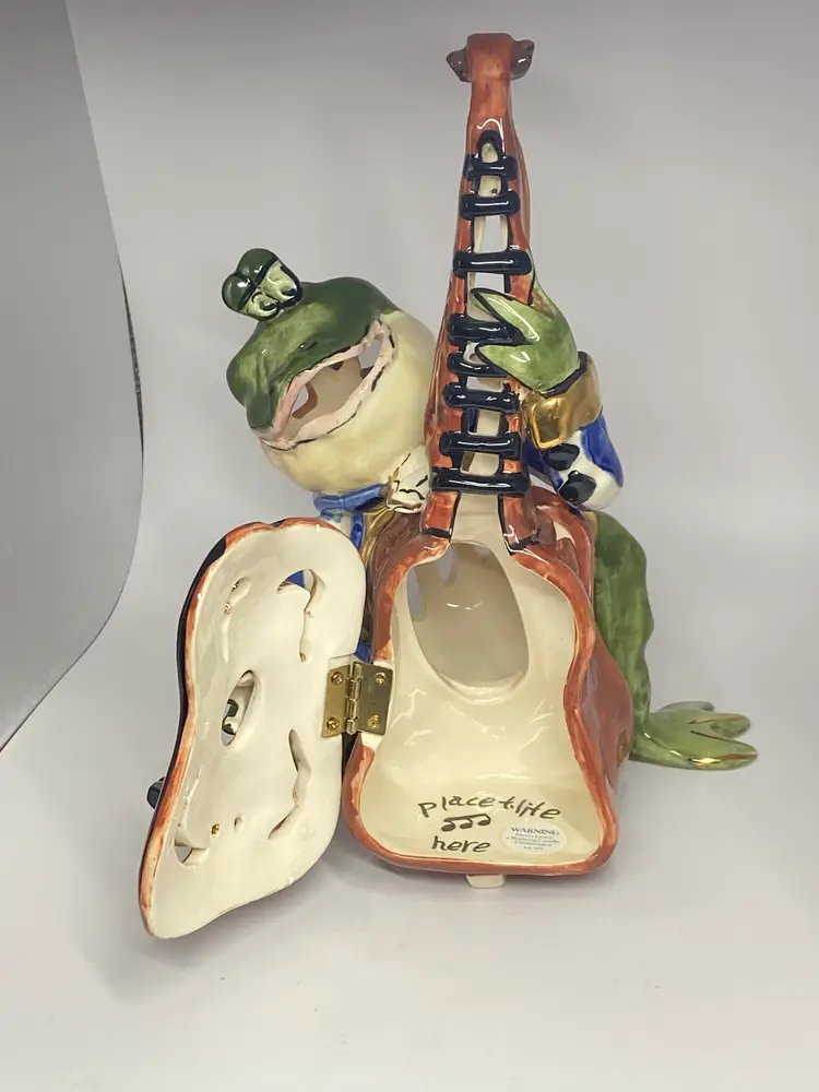 The Blue Sky Clayworks Jazz Frog Playing a Bass Tea Light Holder is a 9" tall ceramic candle holder featuring a whimsical design of a frog playing a bass. This multicolor piece is perfect for any room and all occasions, adding a fun and unique touch to your decor. Made in the 2000s, this medium-sized collectible item weighs 1.4 lbs and would make a great addition to any collection of decorative items.