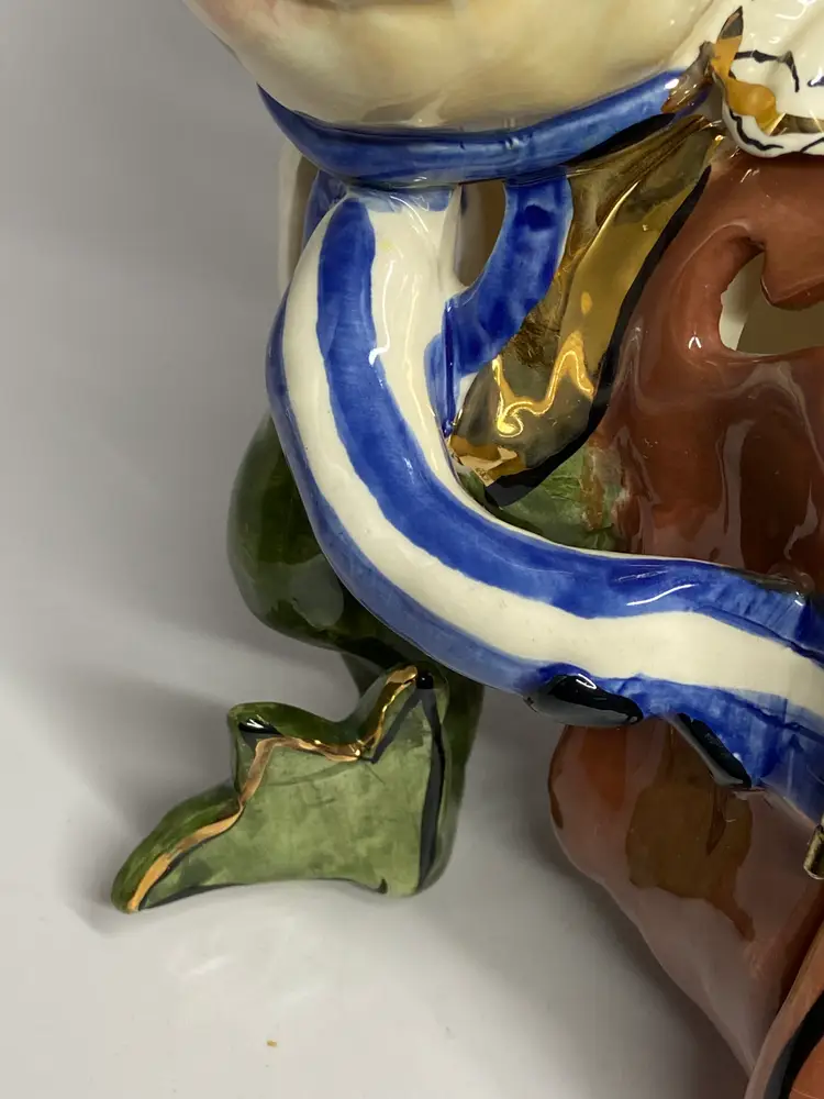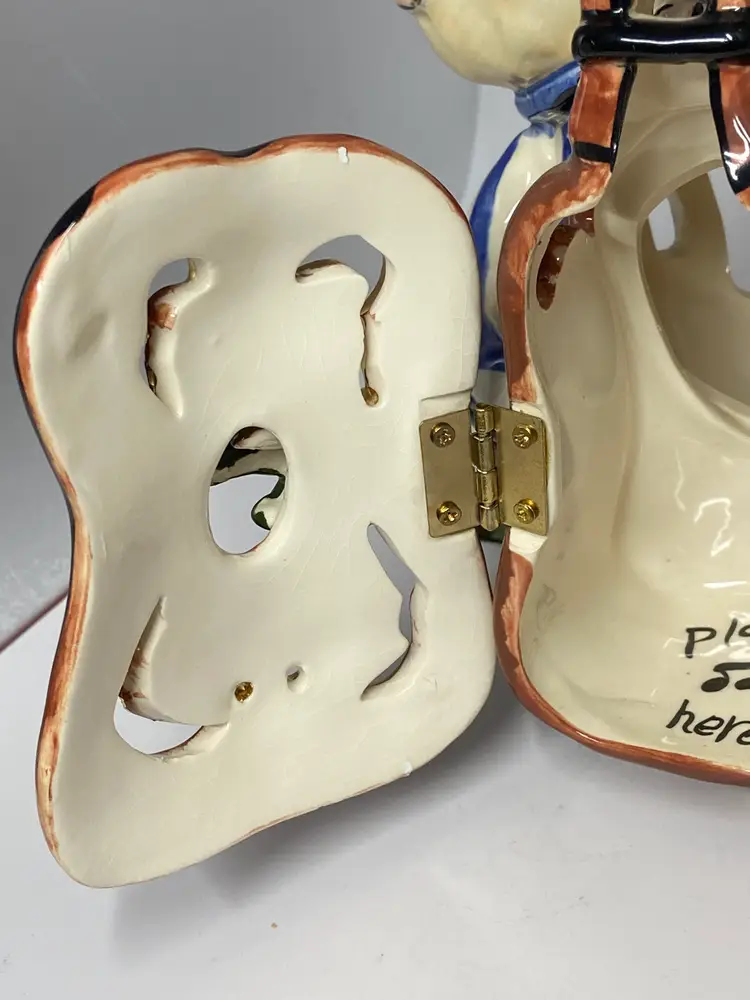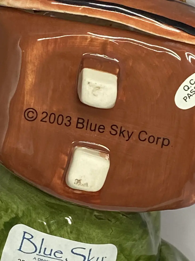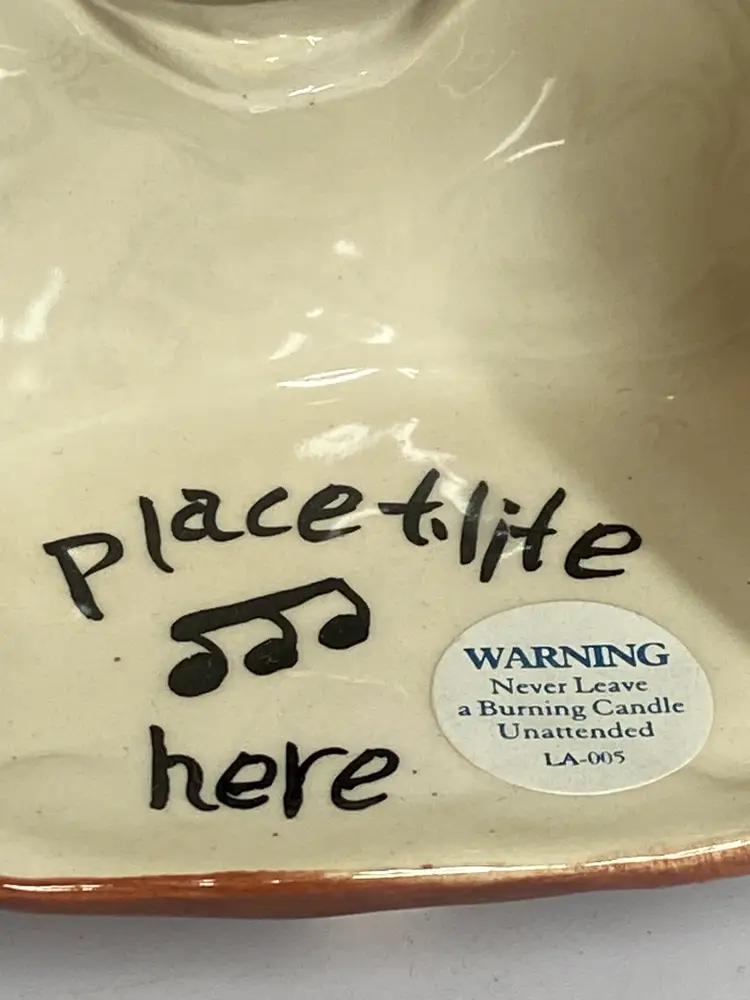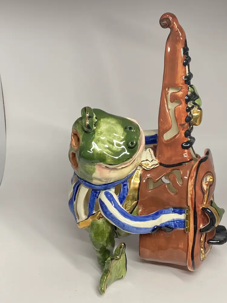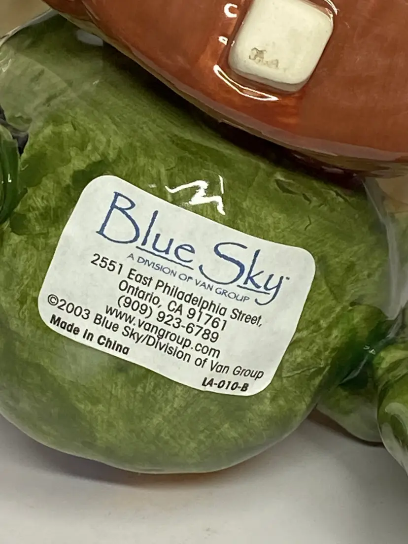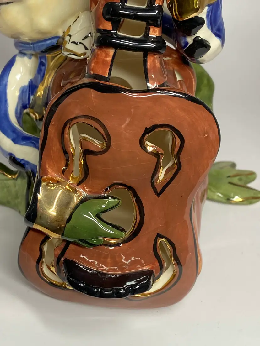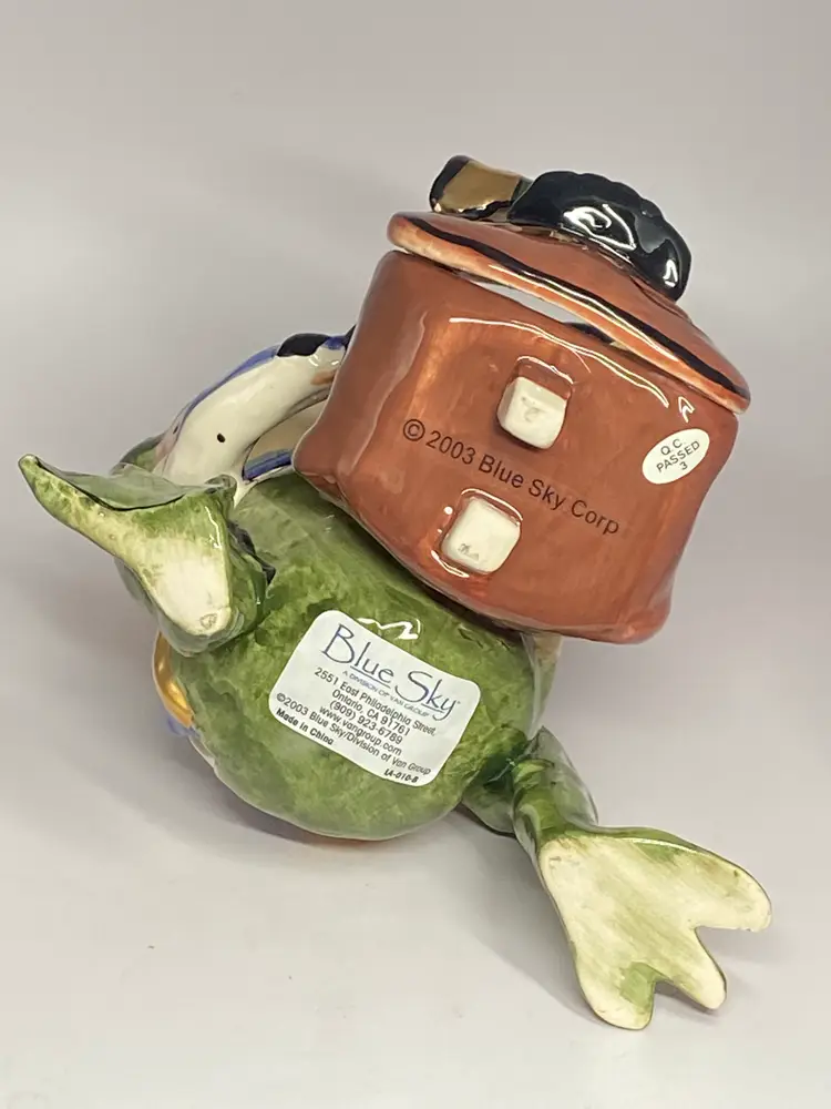 The Blue Sky Clayworks Jazz Frog Playing a Bass Tea Light Holder is a 9" tall ceramic candle holder featuring a whimsical design of a frog playing a bass. This multicolor piece is perfect for any room and all occasions, adding a fun and unique touch to your decor. Made in the 2000s, this medium-sized collectible item weighs 1.4 lbs and would make a great addition to any collection of decorative items.