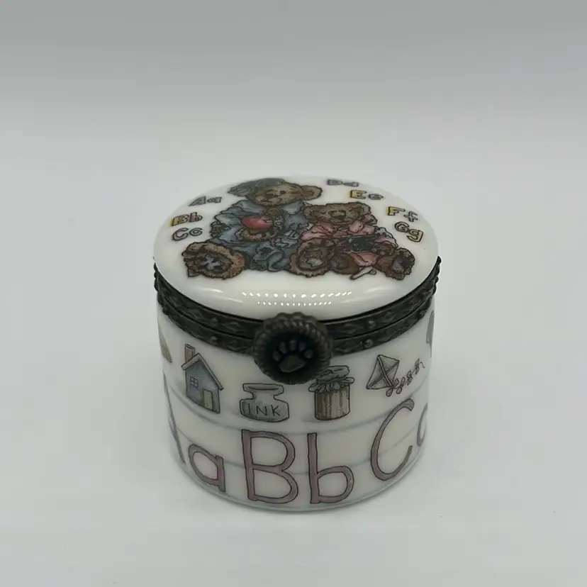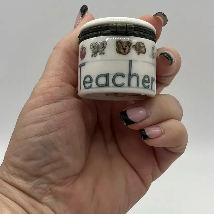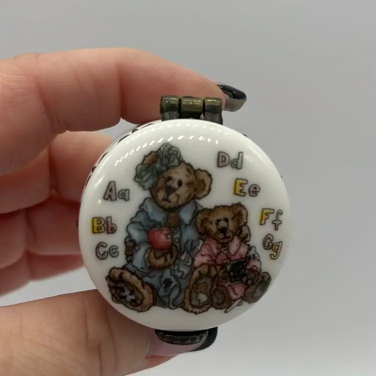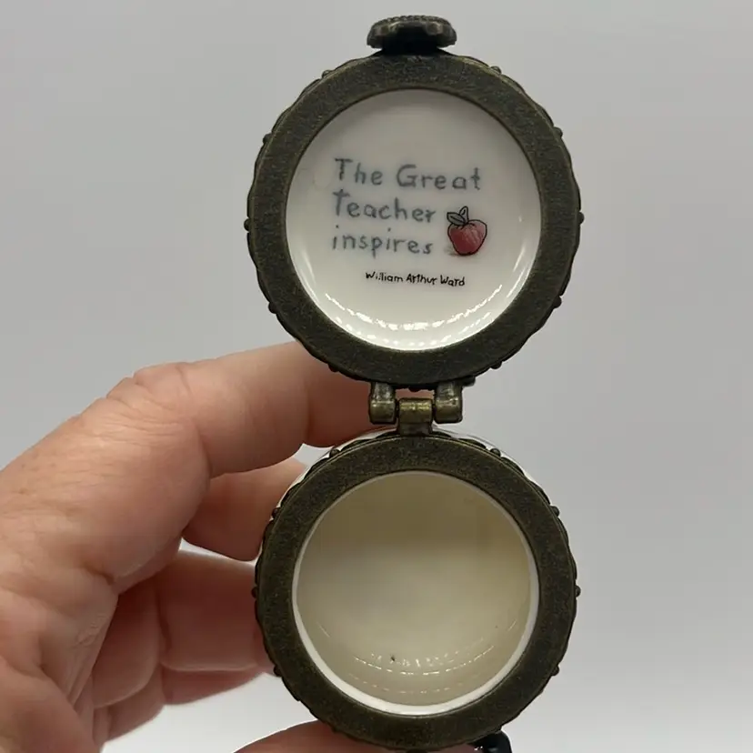 Boyd’s Bears trinket, perfect little gift for a Teacher! Inside has The Great Teacher Inspires.Made in China. No chips or cracks and the clasp is strong! Approx: 1.5” d x 1”h