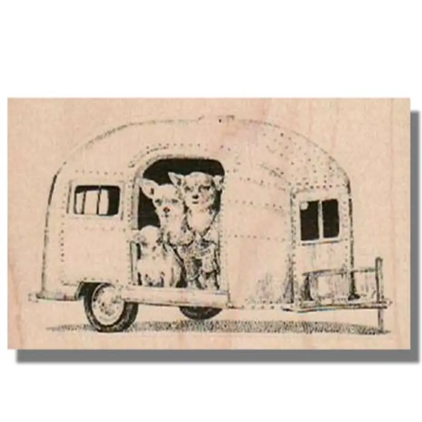Dog Family In Airstream Trailer Rubber Stamp Wood Mounted Size: 3-1/4 x 2 inches Red rubber Brand new/unused • Great for crafts, junk journals, mixed media projects, collage, card making and tags. • First purchase on District? Use this code for $5 off a $10 min purchase. ALOHAG34