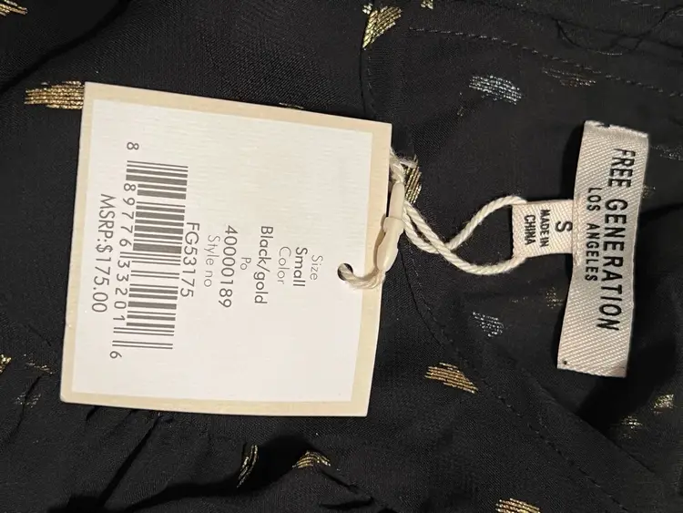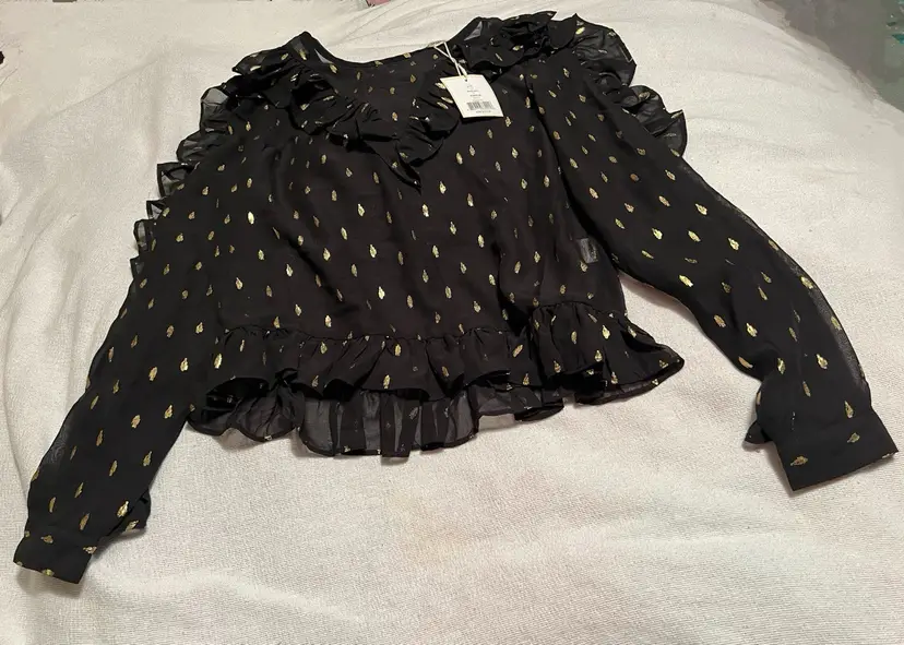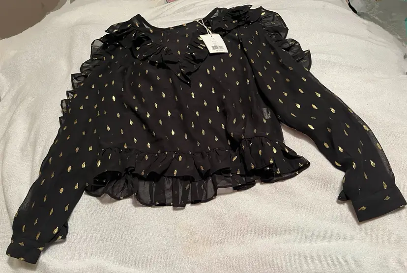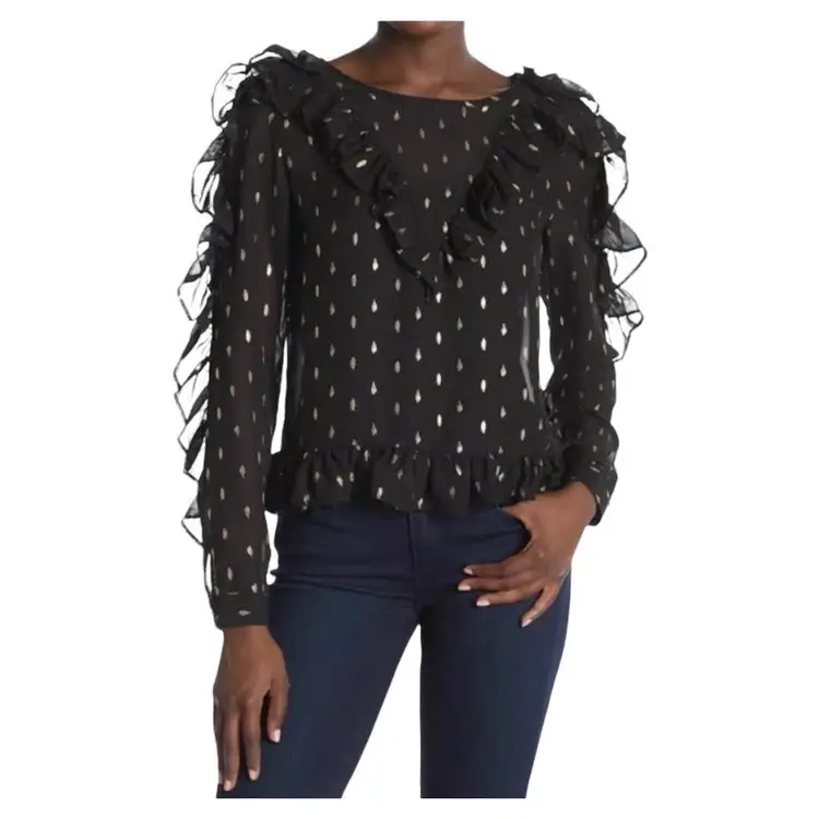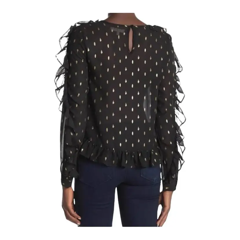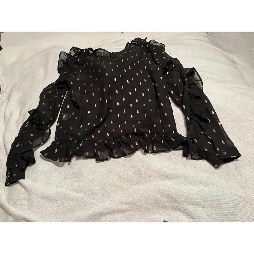 Free Generation LA NWT Size Small Black & Gold Sheer Blouse Foil Dot Blouse w/ Ruffle Details Free Generation Size Small NWT Sheer Ruffle Detail Crew neck Chiffon