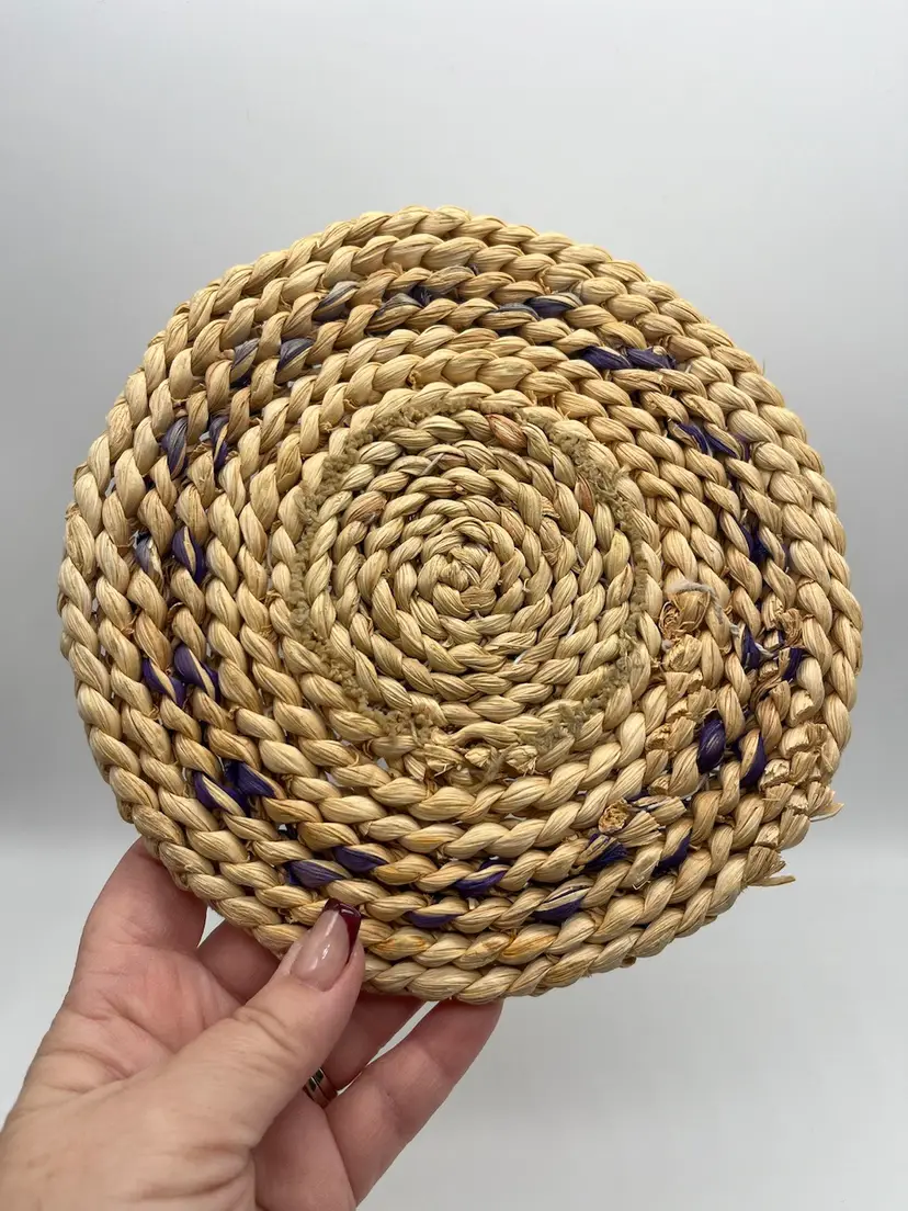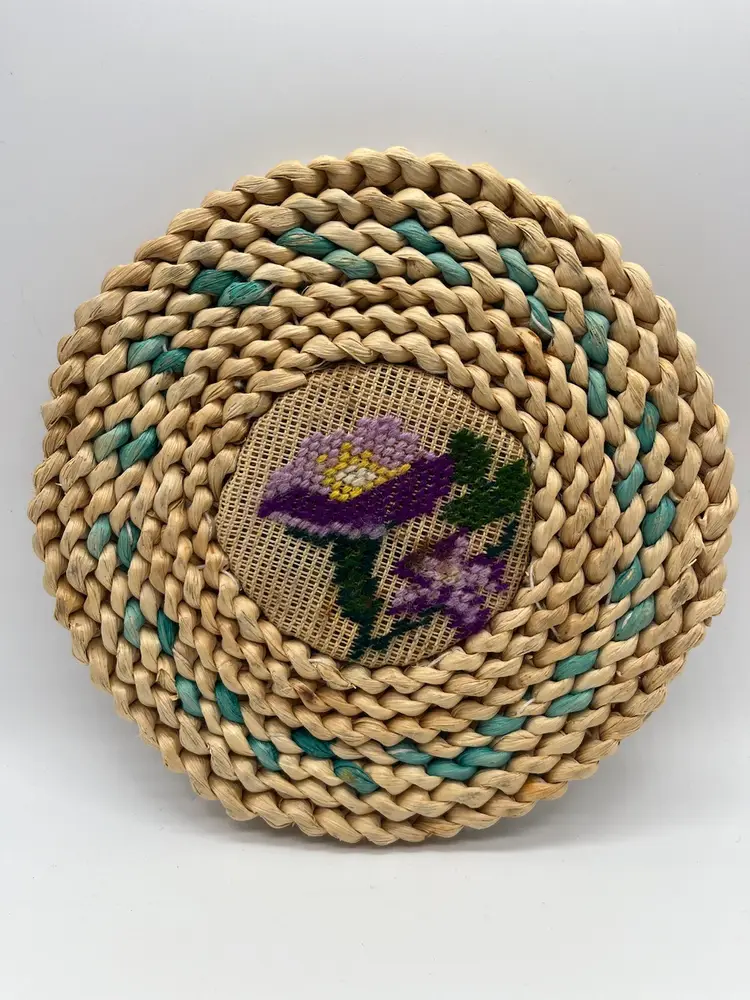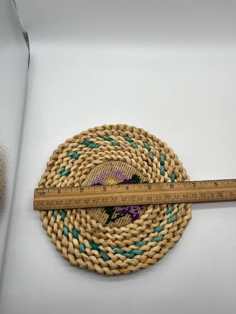 One trivet w/ purple flowers & teal, other w/ yellow flowers w/ purple. Both show some wear. Approx. 7” d