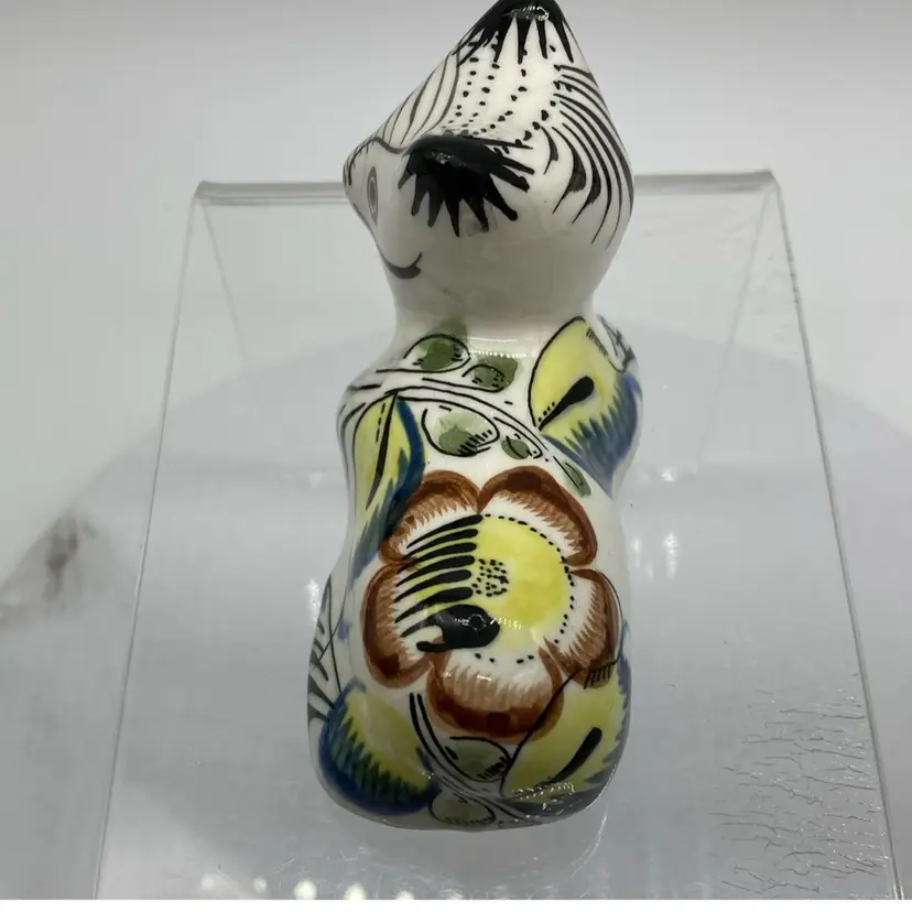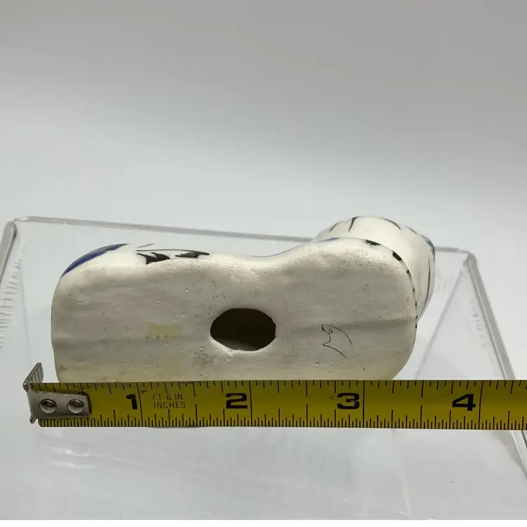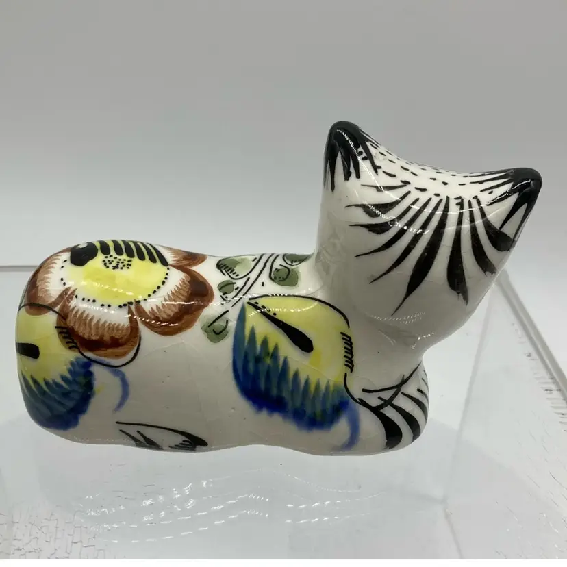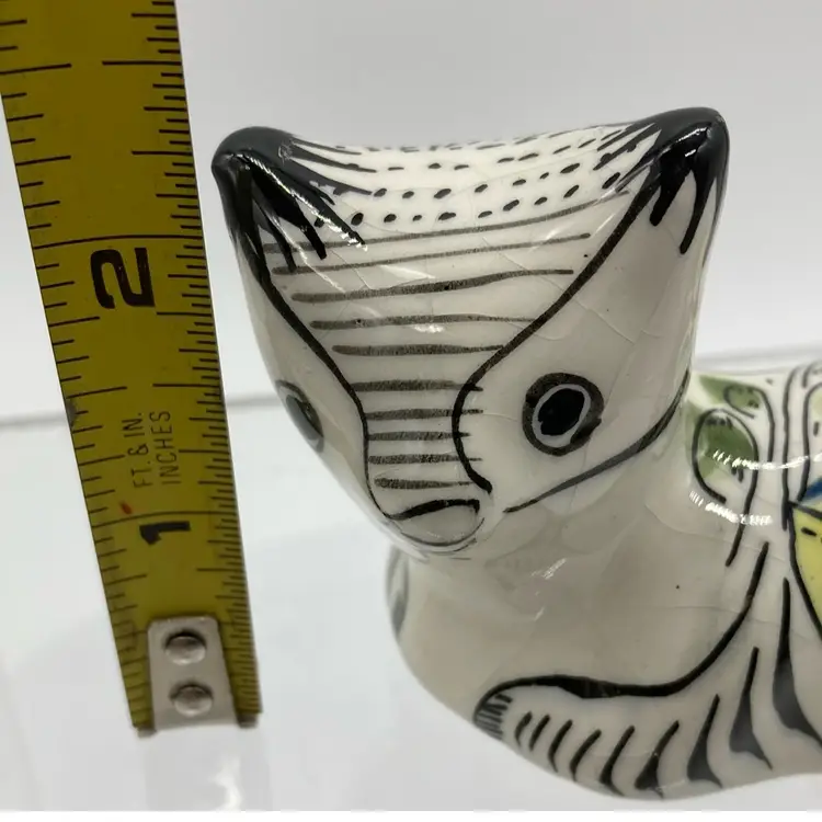 This kitty is colorful AND crazed. Points of his ears have some glaze loss. Not sure of his origin. Italy, Portugal or Mexico? 3.5”L x 1.75”Wx 2.5”H