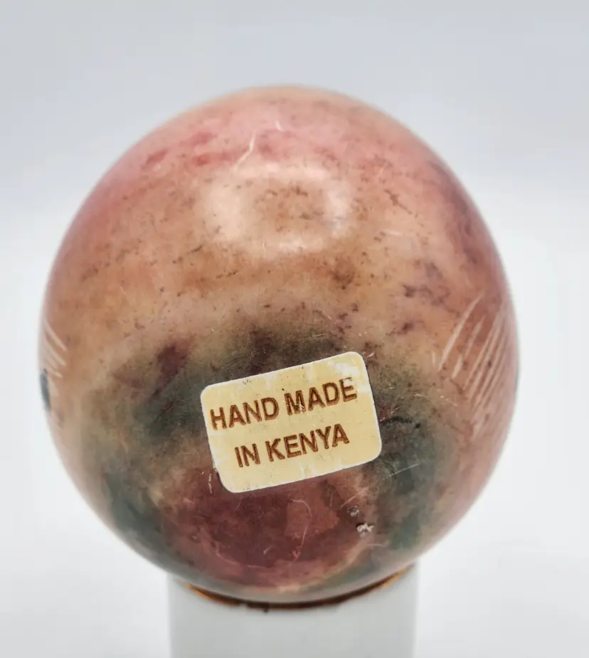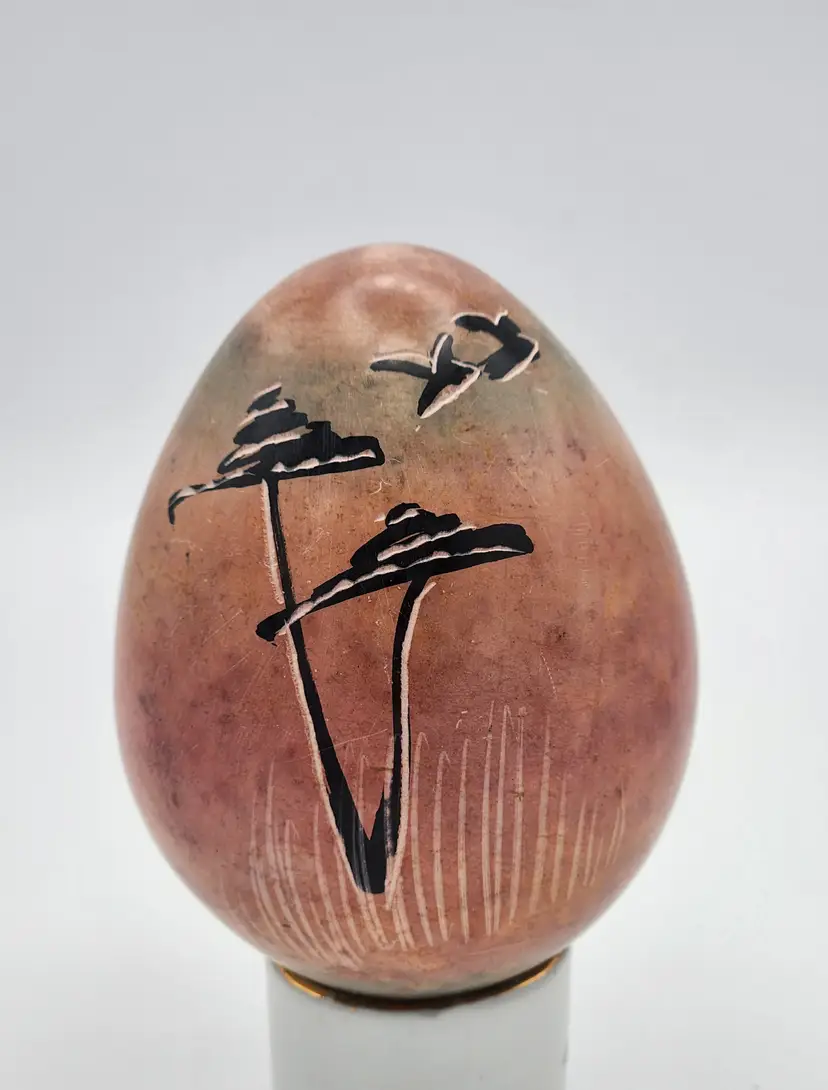Hand-carved and painted soapstone decorative egg featuring a giraffe design. Made in Kenya. Approximately 2"x3" Minor scratches. Chip on elephant tusk - see photo.