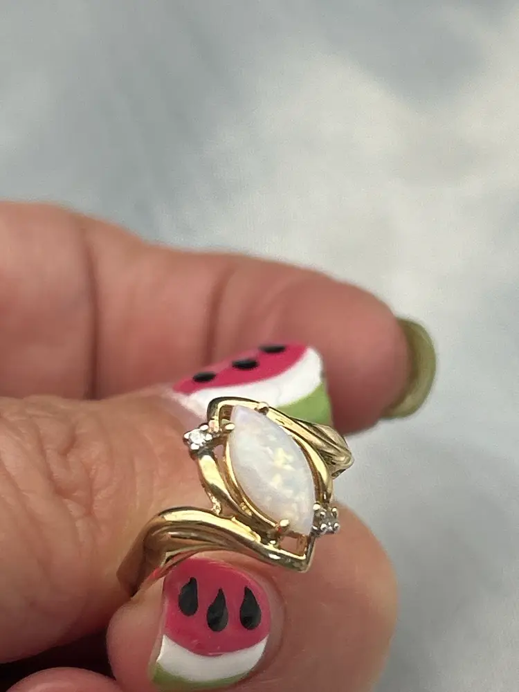 A timeless and romantic design, this vintage ring is crafted in solid 10K yellow gold and showcases a marquise-shaped opal with dreamy flashes of green, pink, and blue. The opal is set in an elegant bypass-style band with twinkling diamond accents at each end, offering just the right touch of sparkle. This delicate ring is a perfect October birthstone gift or a stunning addition to any vintage fine jewelry collection. Marked 10K, size 5, excellent vintage condition.