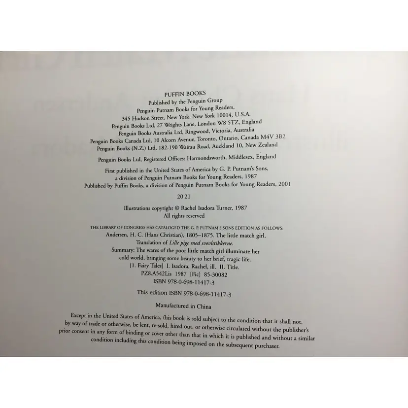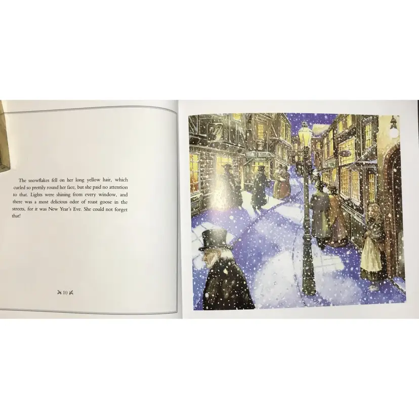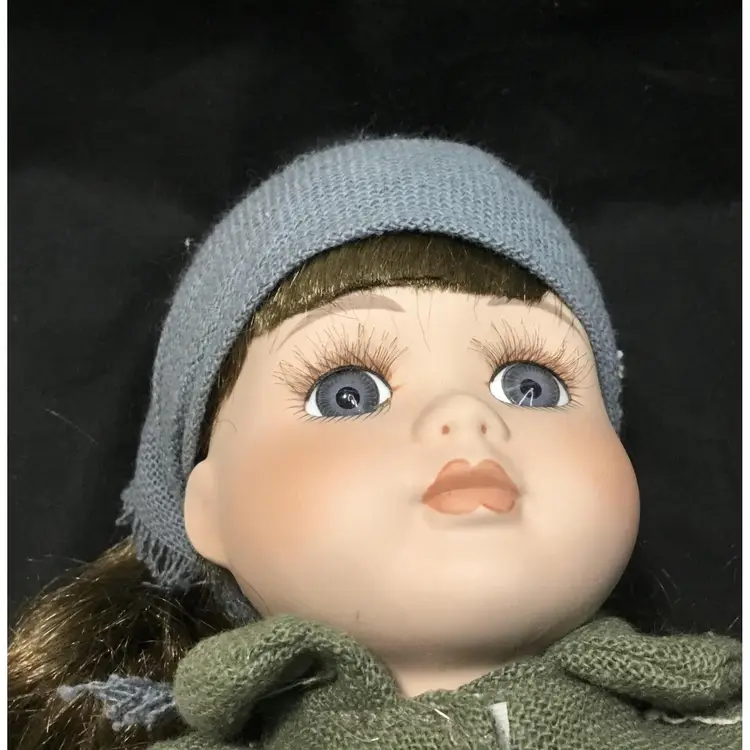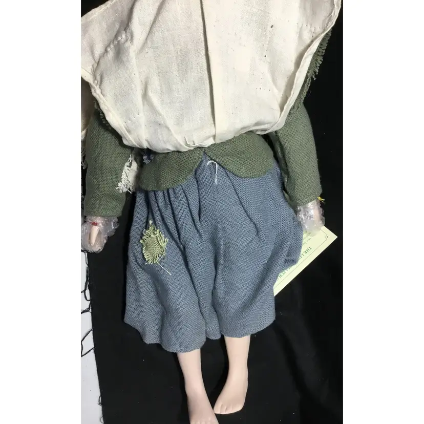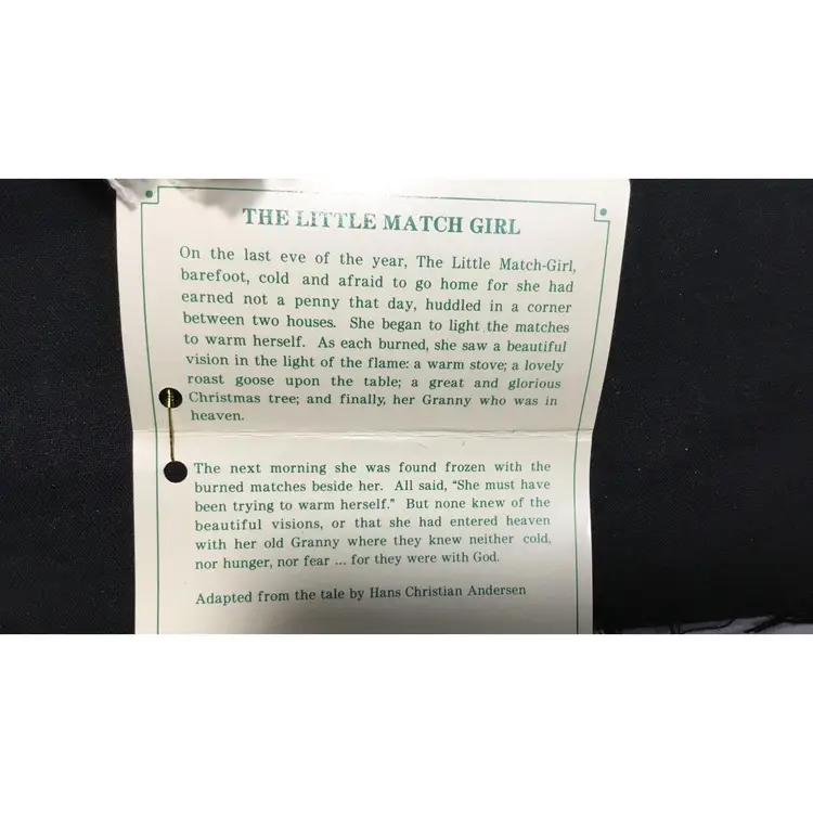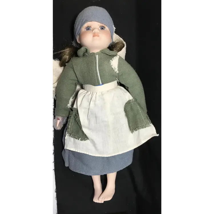 16 inch doll with porcelain head, forearms and hands, lower legs. Stuffed cloth body. Doll wears scarf, shawl, jacket, apron, skirt, bloomers. All clothes are removable and able to put back on. Book is new with nice illustrations. Doll is missing her tray and match books to sell.