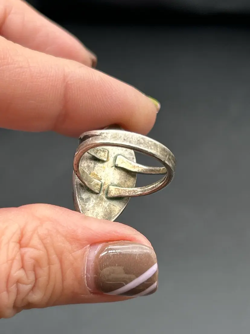 Beautiful vintage handcrafted sterling silver inlay ring featuring classic Zuni-style geometric design. The elongated marquise face is inlaid with turquoise, coral, jet, and shell, forming a bold sunburst pattern. The split shank design offers comfort and balance, while the silver has developed a natural aged patina. Unmarked but tested sterling silver (.925). Likely Zuni or Navajo artisan made, mid-20th century Southwest craftsmanship.