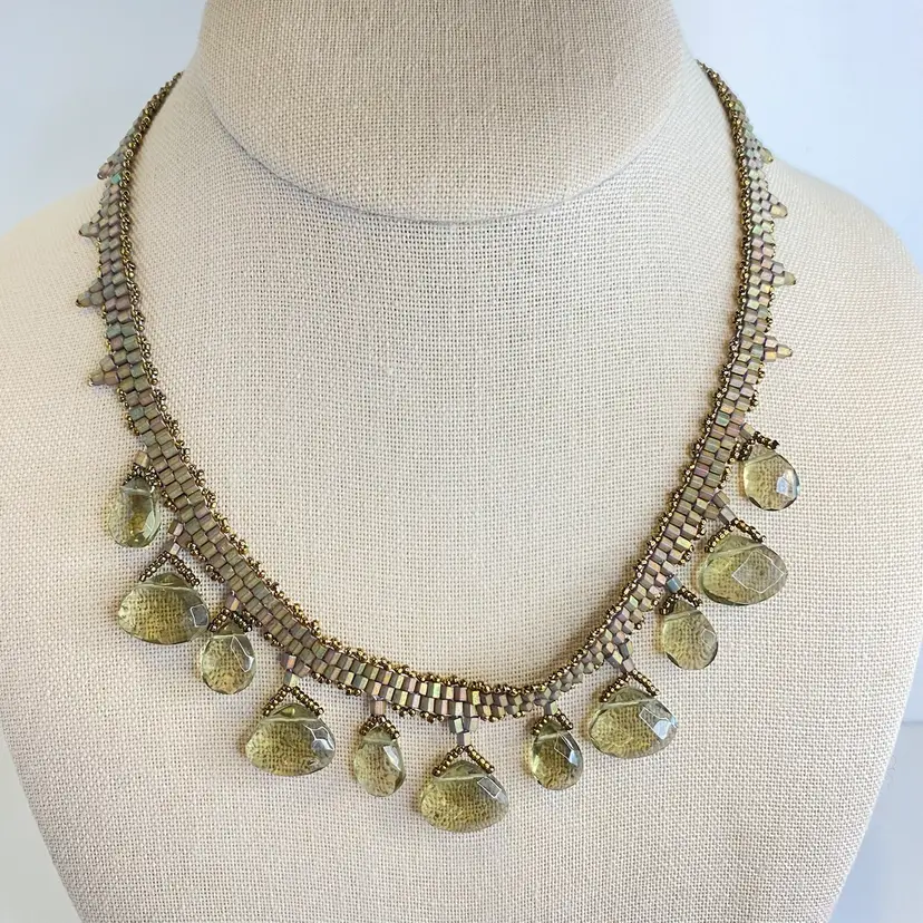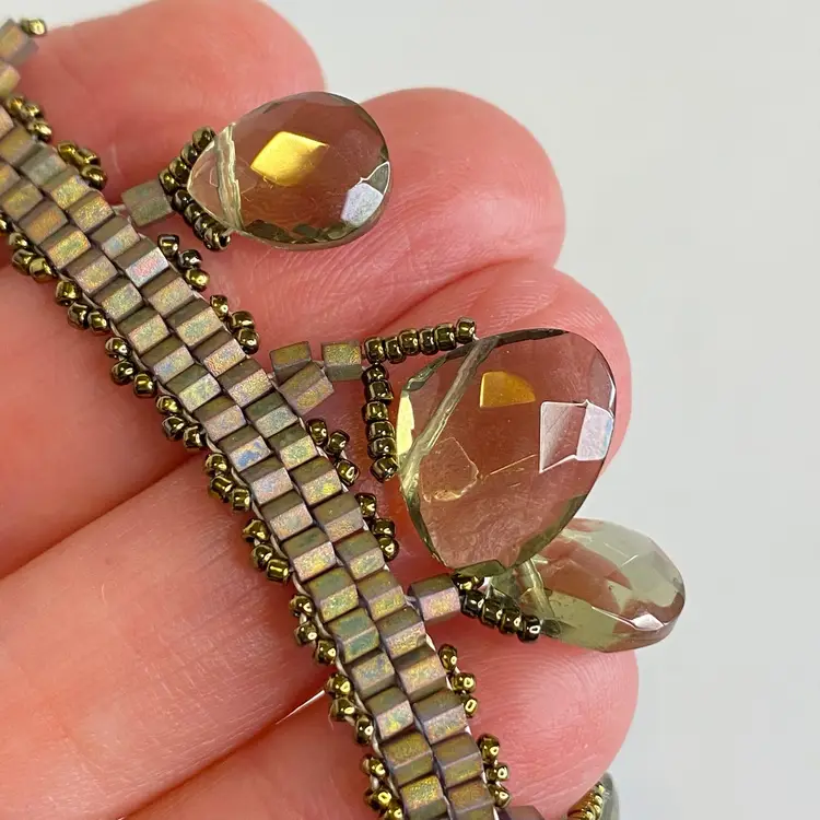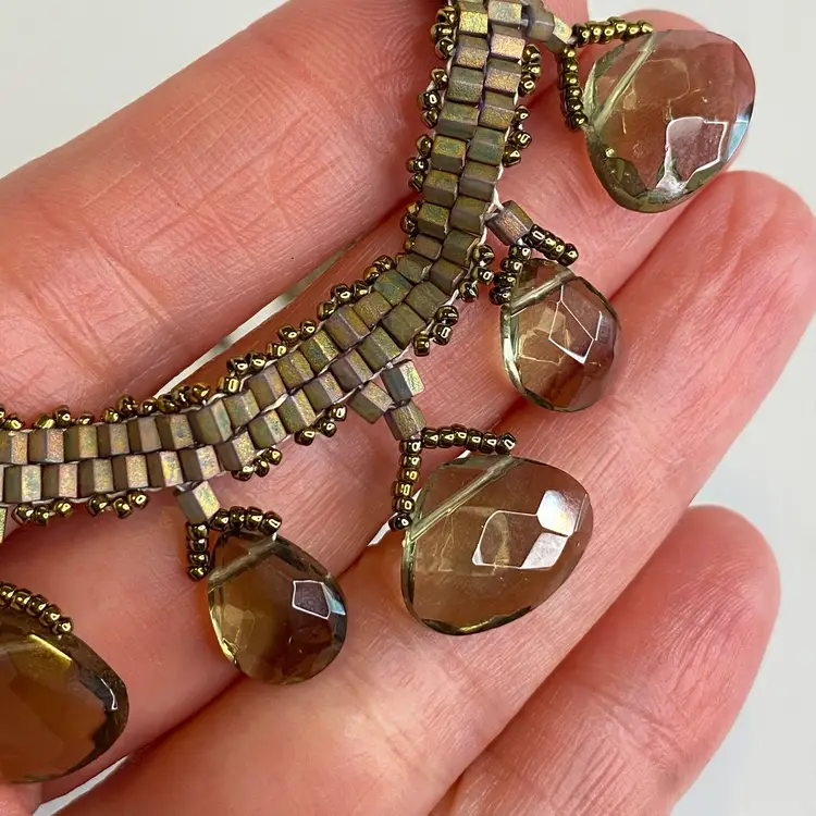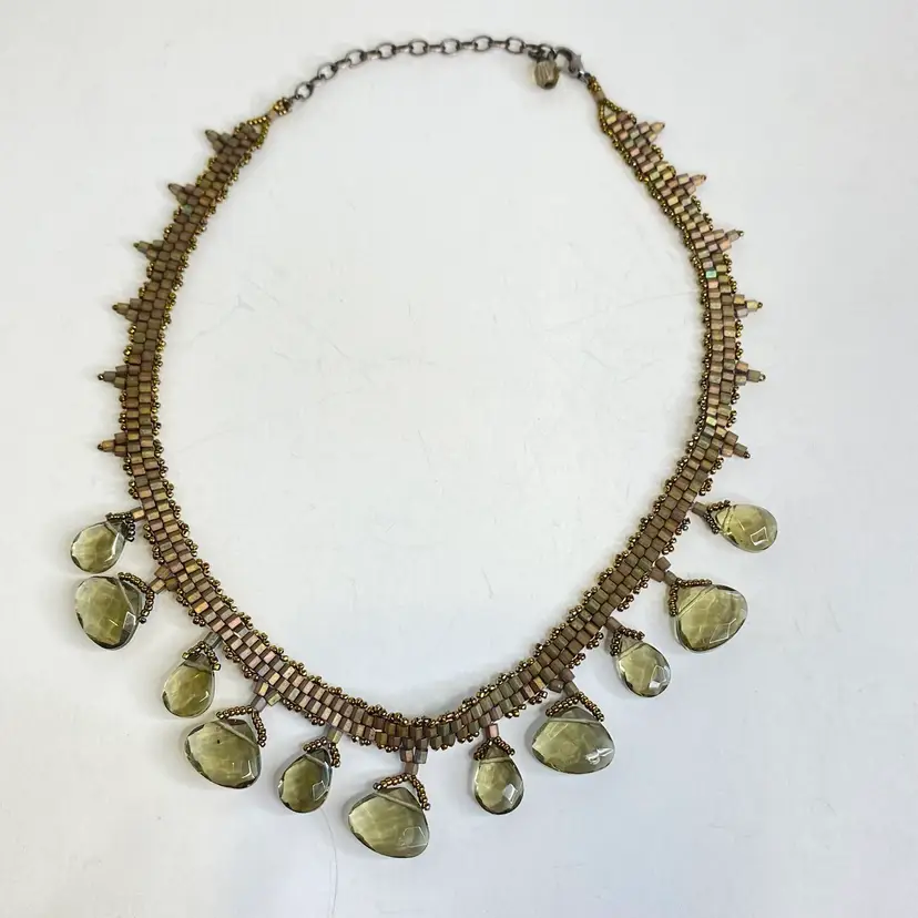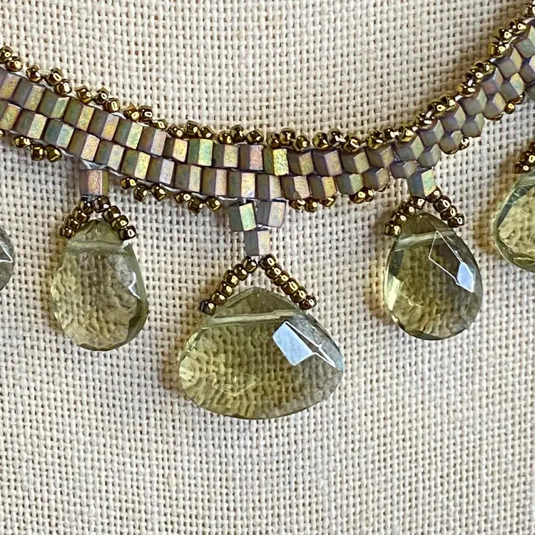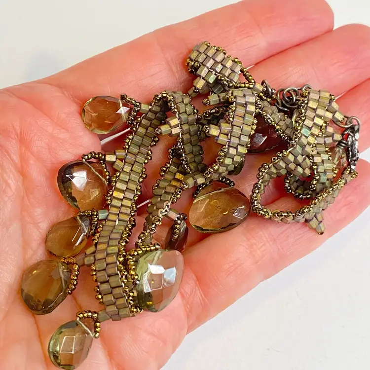 Artisan Beaded Statement Necklace Iridescent Cube Seed Beads Glass Briolettes. This stunning handcrafted necklace features an intricate woven band of iridescent cube and metallic seed beads, forming a rich, textured collar. Suspended along the length are faceted teardrop and oval glass briolettes in a subtle olive-yellow tone, delicately framed by seed bead caps. The necklace closes with a lobster clasp and extender chain, allowing for an adjustable fit. Likely created using a peyote stitch or similar bead weaving technique, this piece is unsigned but beautifully constructed. Perfect for collectors of artisan jewelry or lovers of unique statement pieces. Good condition. Please see pictures for details. SMOKE FREE/PET FREE HOME