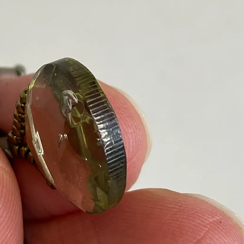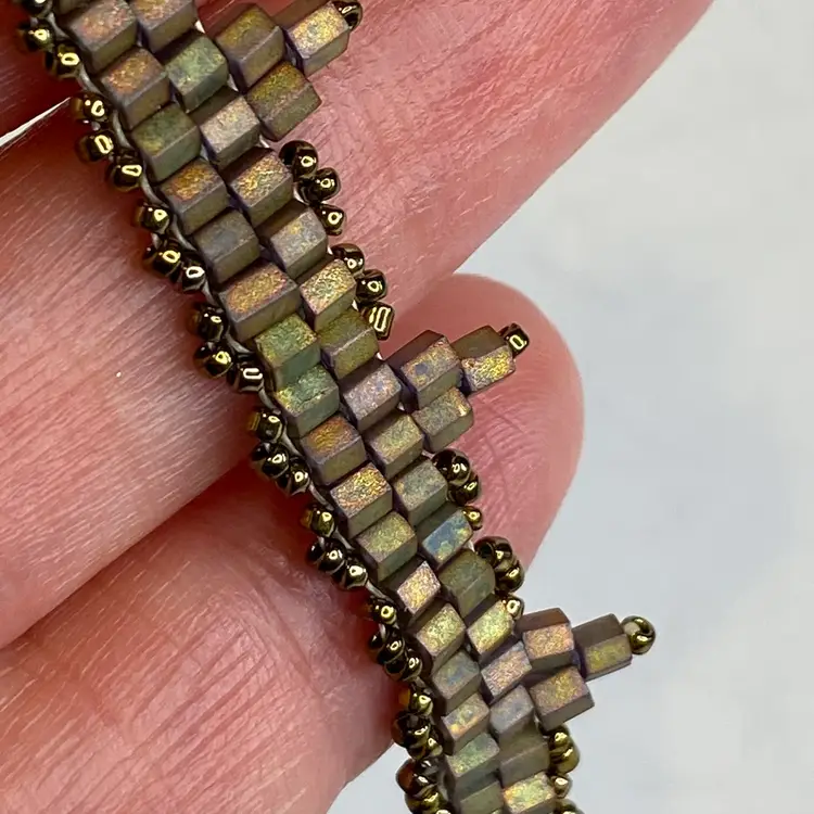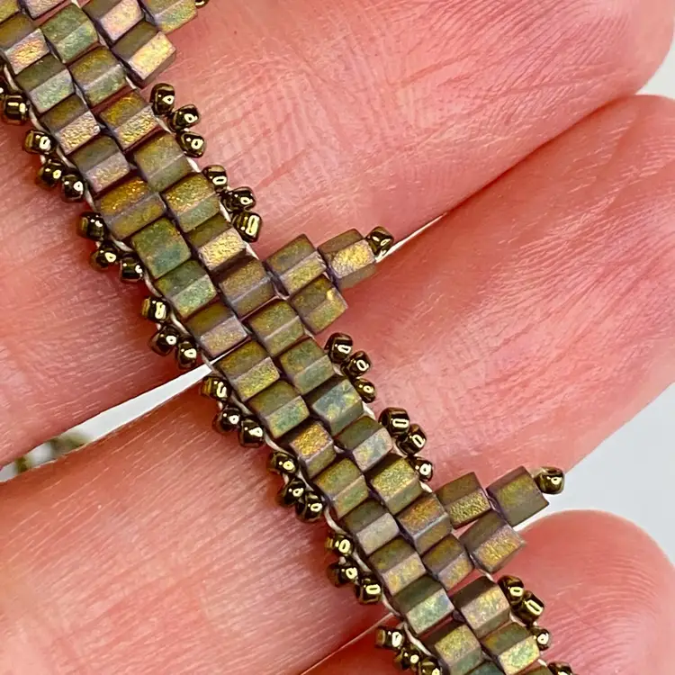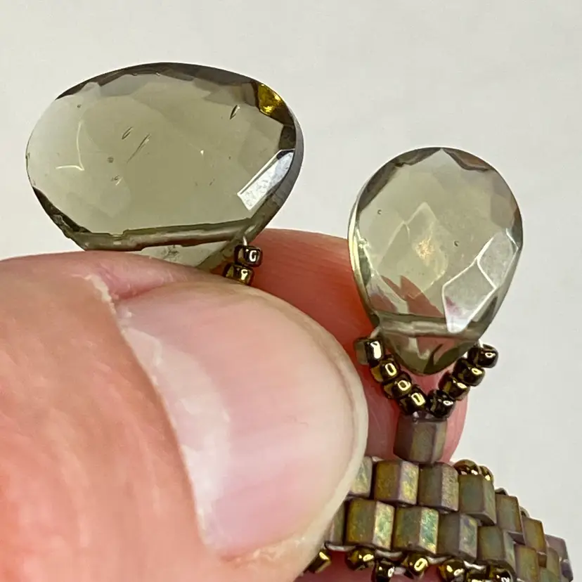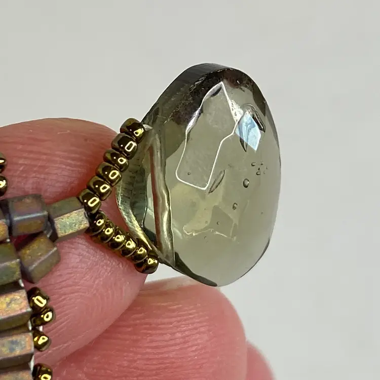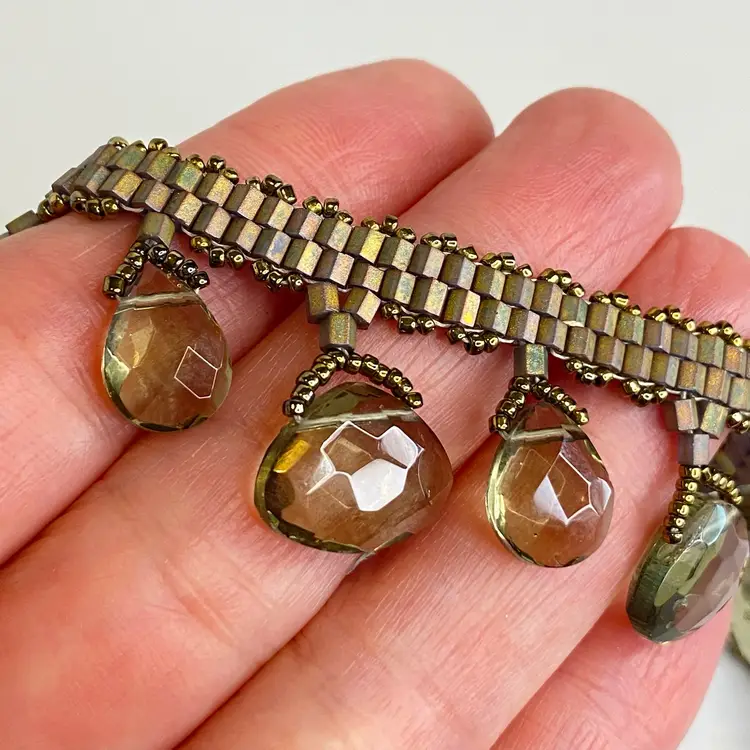 Artisan Beaded Statement Necklace Iridescent Cube Seed Beads Glass Briolettes. This stunning handcrafted necklace features an intricate woven band of iridescent cube and metallic seed beads, forming a rich, textured collar. Suspended along the length are faceted teardrop and oval glass briolettes in a subtle olive-yellow tone, delicately framed by seed bead caps. The necklace closes with a lobster clasp and extender chain, allowing for an adjustable fit. Likely created using a peyote stitch or similar bead weaving technique, this piece is unsigned but beautifully constructed. Perfect for collectors of artisan jewelry or lovers of unique statement pieces. Good condition. Please see pictures for details. SMOKE FREE/PET FREE HOME