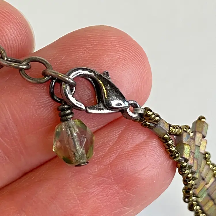 Tags: #artisanjewelry #handbeadednecklace #statementnecklace #bohojewelry #glassbeads #vintagestyle #beadedjewelry #iridescentbeads #briolette #miyukibeads #adjustablenecklace #craftfairjewelry #uniquejewelry