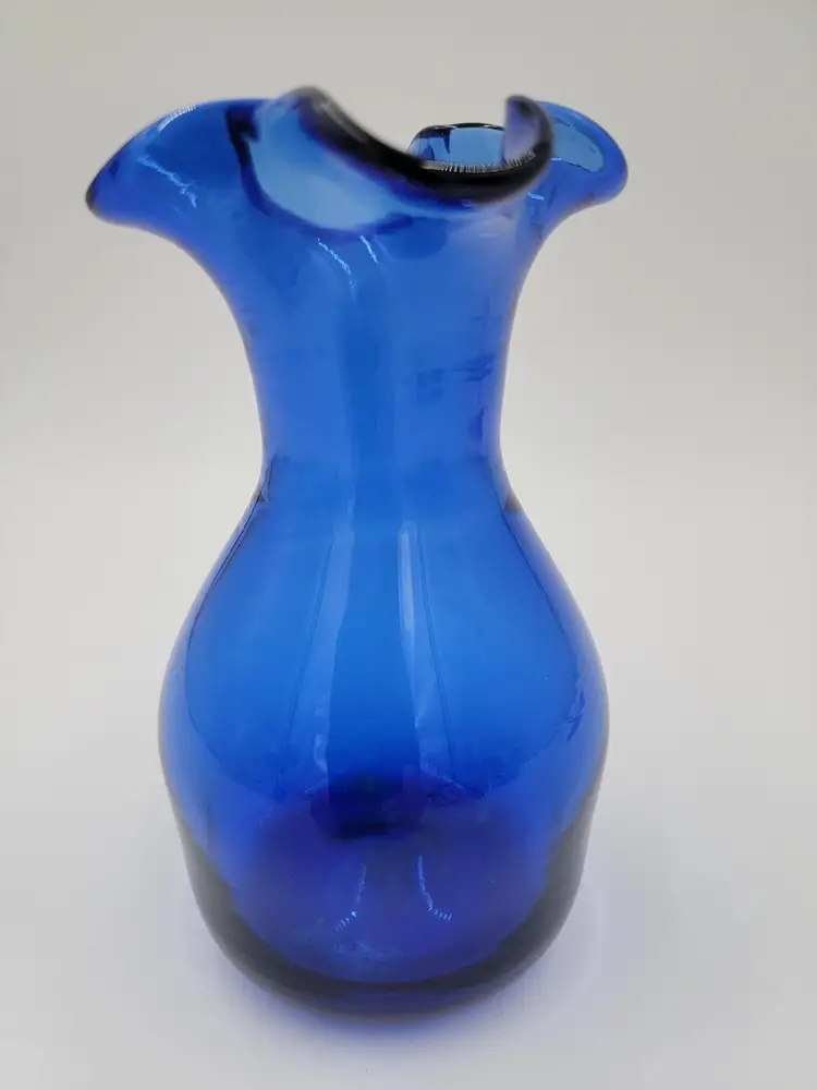 This vibrant cobalt blue vase features a unique handblown design with a charming ruffled edge, adding a pop of color and elegance to any space.51/2”T 3”W