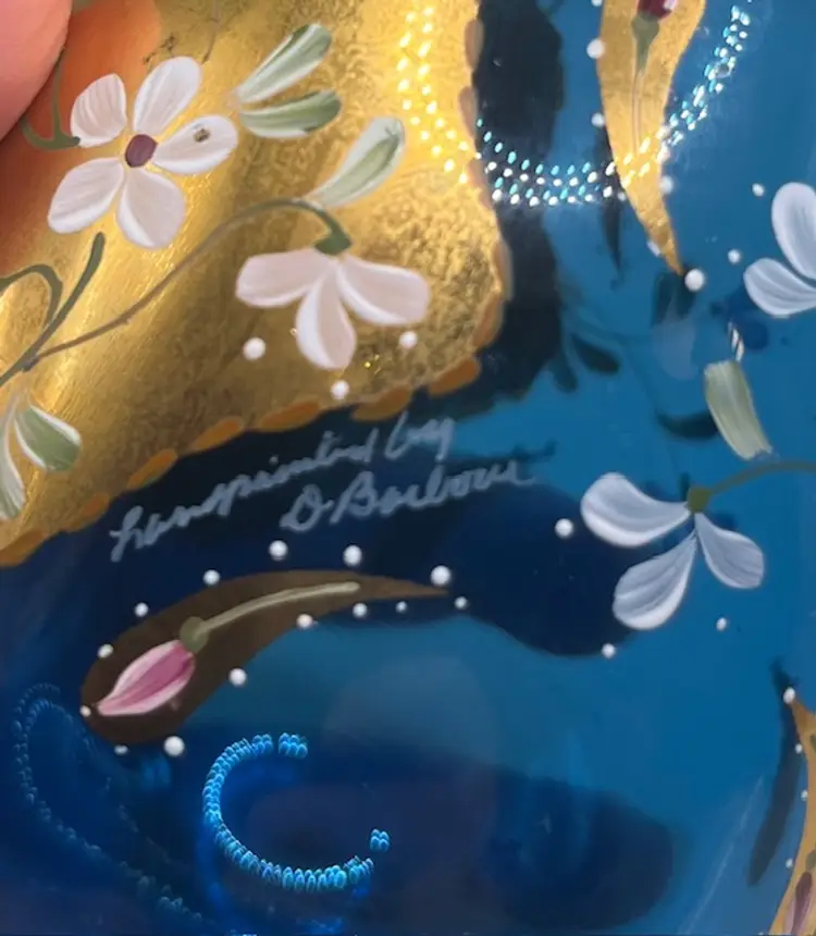 This gorgeous piece is a perfect addition to your Fenton or art glass collection. It's in excellent condition; no chipping, cracking or crazing. Hand painted and signed by D. Barbour (Diana Barbour). 5.25 inches tall