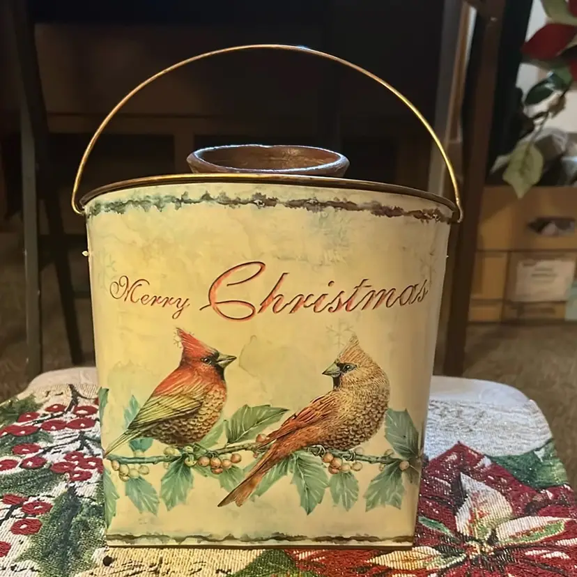 #02 - Metal Planter W/Handle, Wall Pocket, Red Bird Design 6.25x7"H