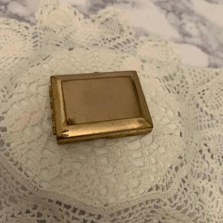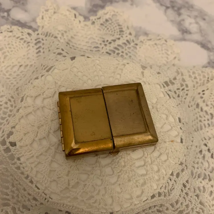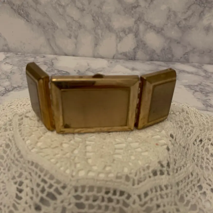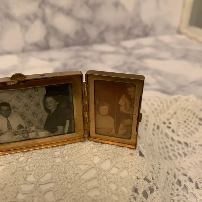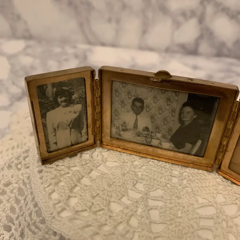Mini tri-fold picture frame. Gold tone finish. Folds up and snaps closed. Vintage pictures included. Measures 2” x 1.75” closed. 4.25” open.
