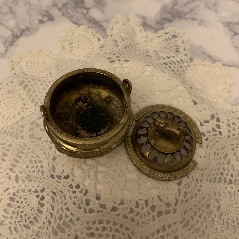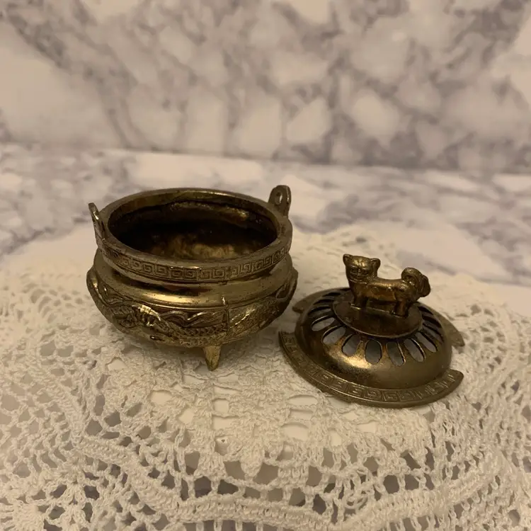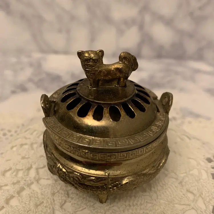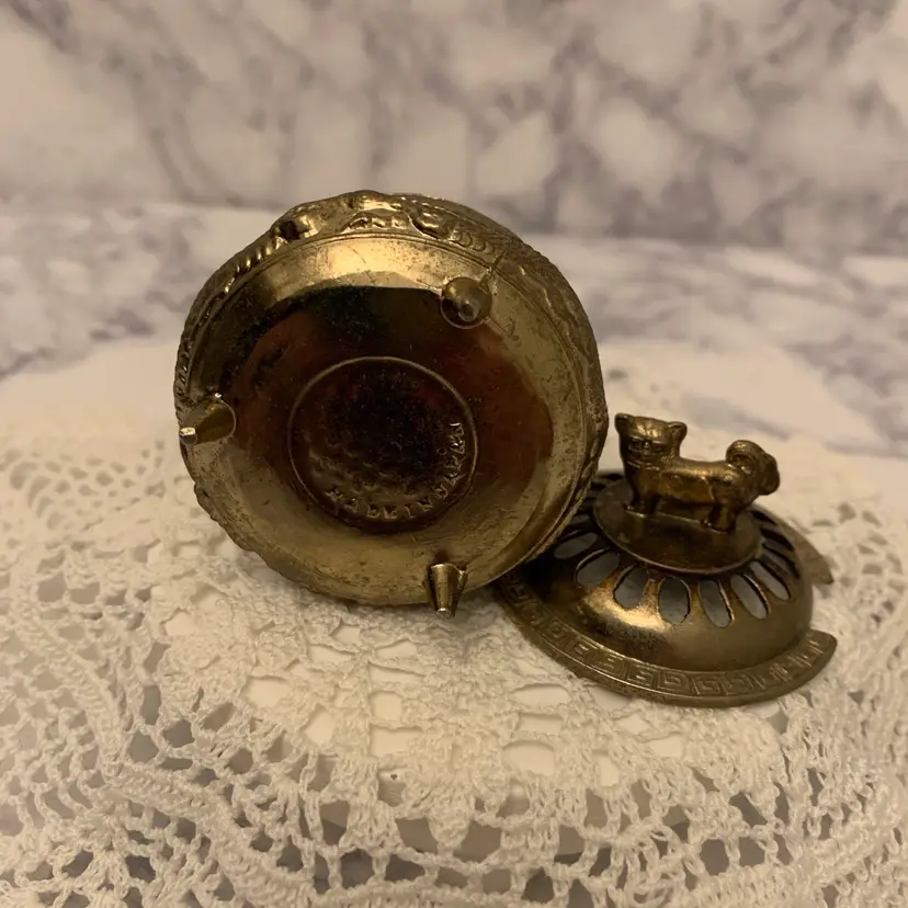 Mini ornate brass incense holder with dog as the handle. Approx 2.5” x 2”.