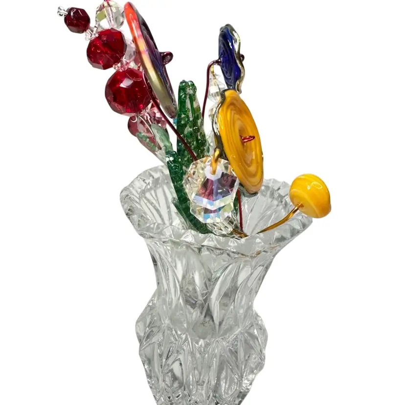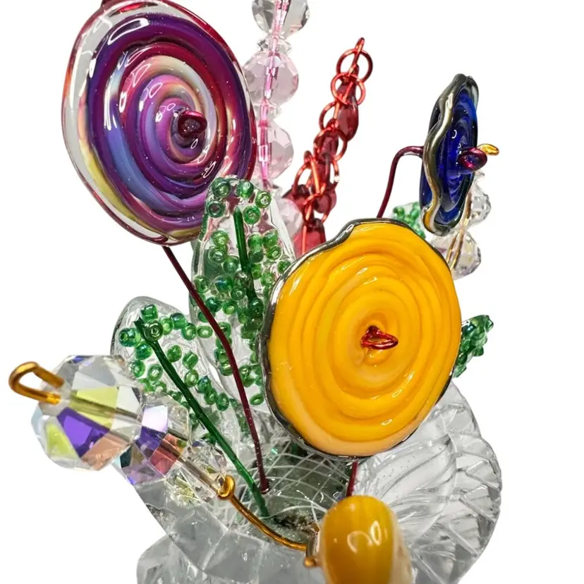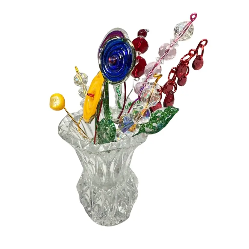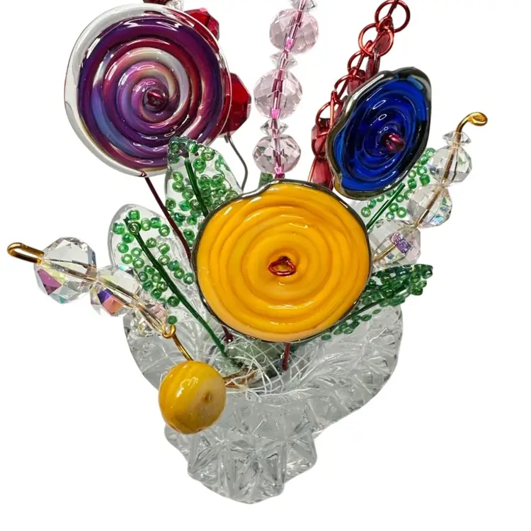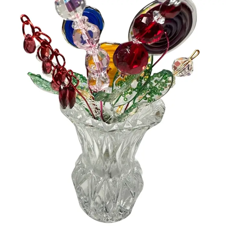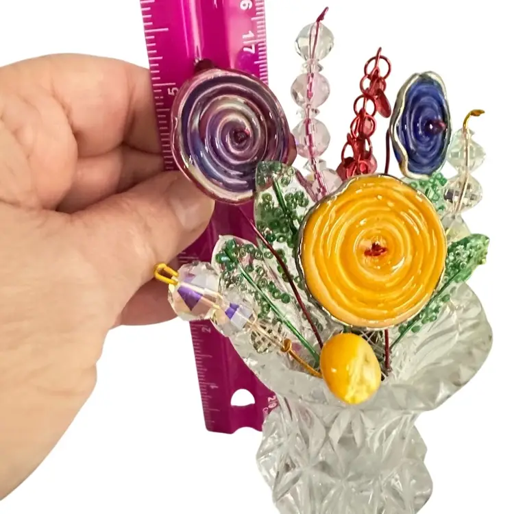 I took hand made round lamp work beads and made them into flower. Took other beads and made additional flowers and plants. The leaves are resin with seed beads added. The vase is a pressed glass tooth pick holder. All items are glued in with resin so that they will not move around.