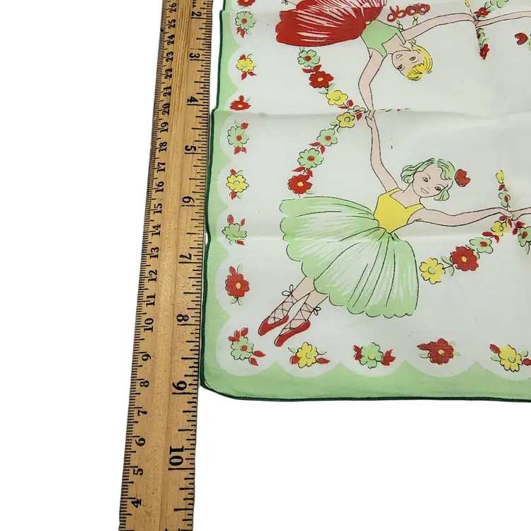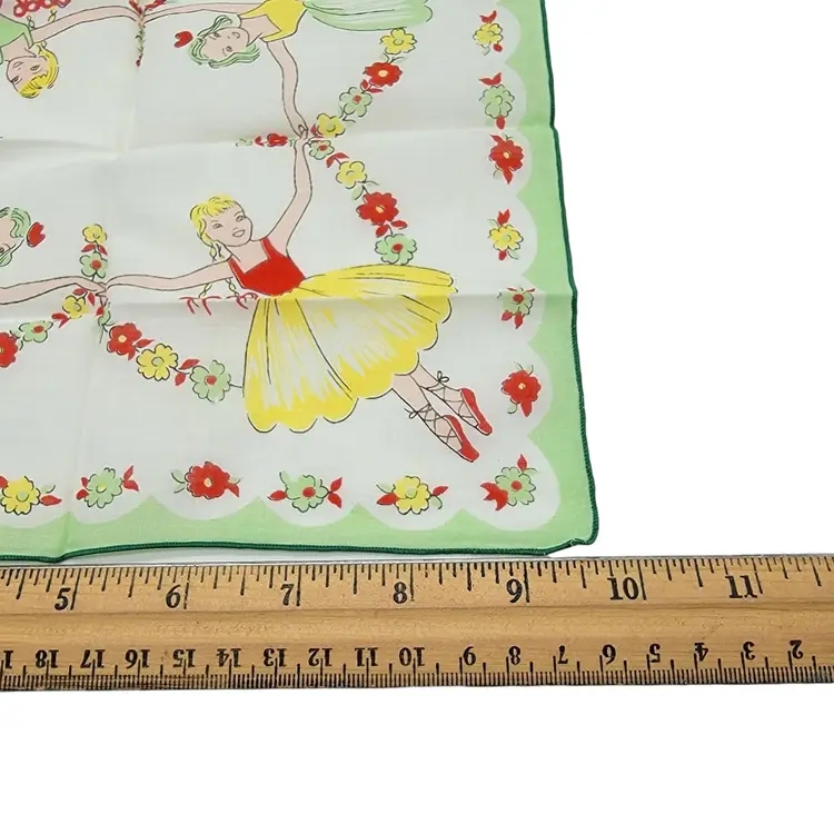 This charming handkerchief whisks one away to a world of elegance and grace. Illustrated with whimsical dancers encircled by blooming florals, it's a delightful piece of nostalgia. Crafted in cotton, it recalls an era where accessories were treasured tokens, each telling its own delicate story.