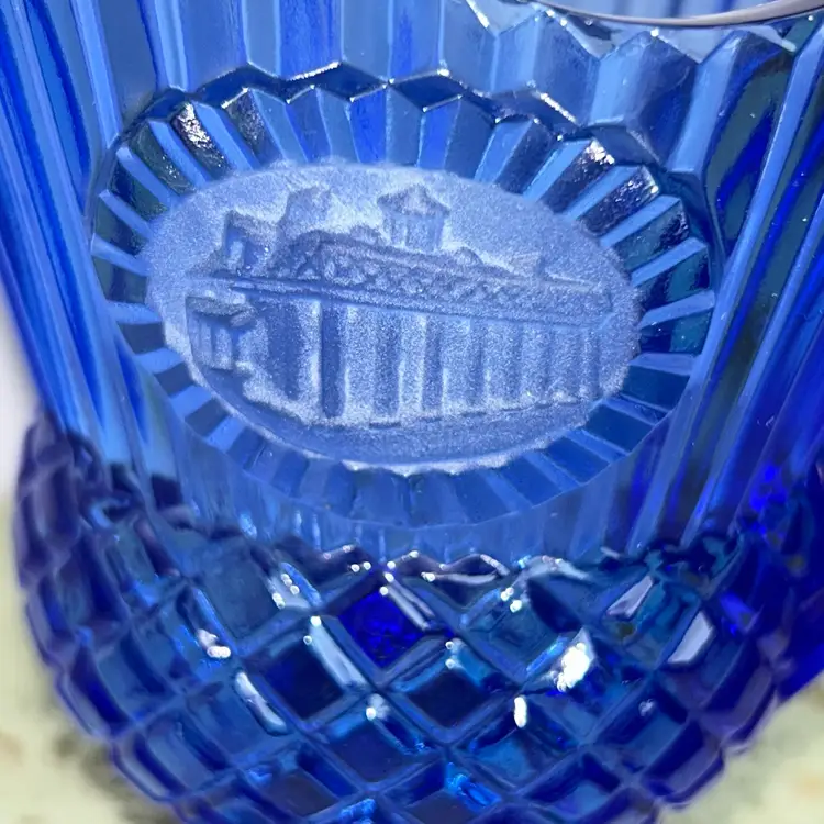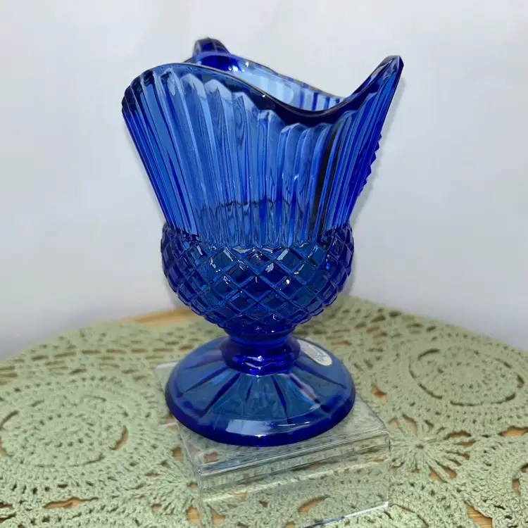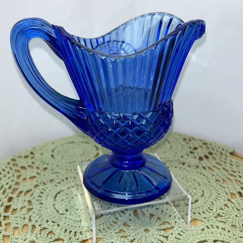 Pitcher is 5.5” tall at handle and tall scallop, 5.5” wide from outside edge of spout through outside edge of handle, opening is 3 1/8” x 4”, base is 3 1/8” in diameter. Excellent condition. No chips or cracks. Original label present. Perfect for celebrating 250 years of America.