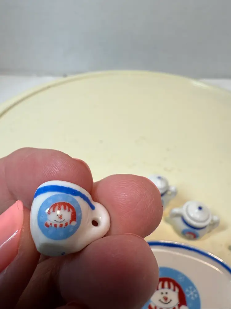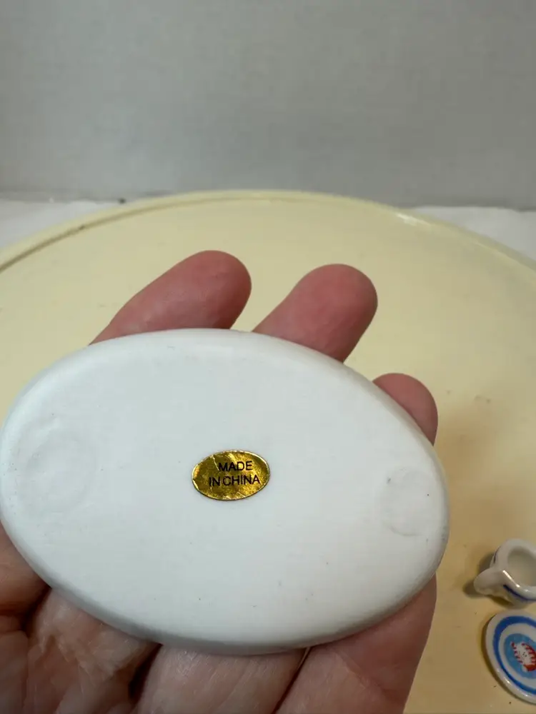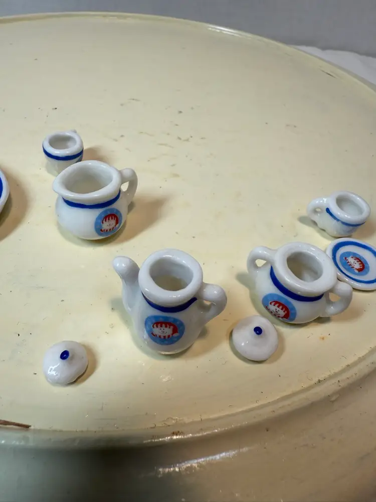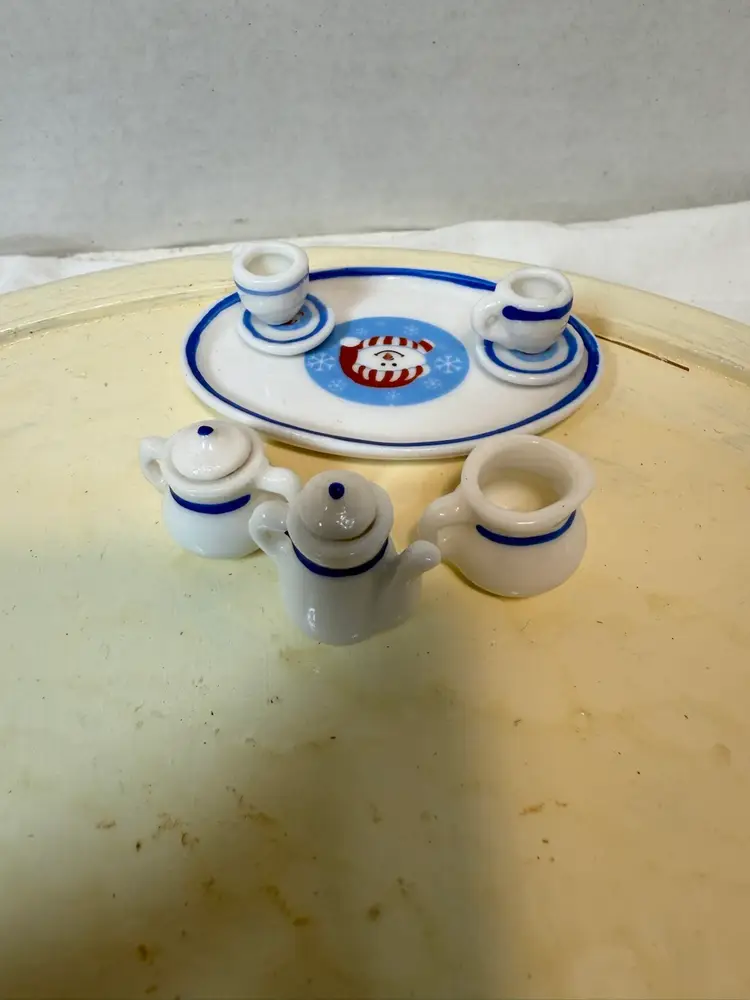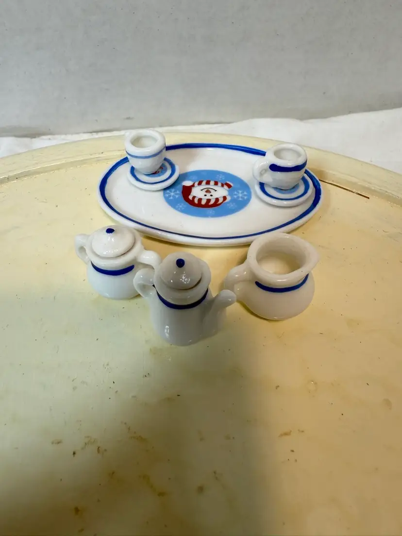 All pieces are in great condition stored in curio cabinet always. Made in China late 1980’s. Measurements are tray- 3” long, 2” wide, cups- 1/2” wide, 1/2” tall, teapot- 1” tall. Very cute breaking up my teapot collection.