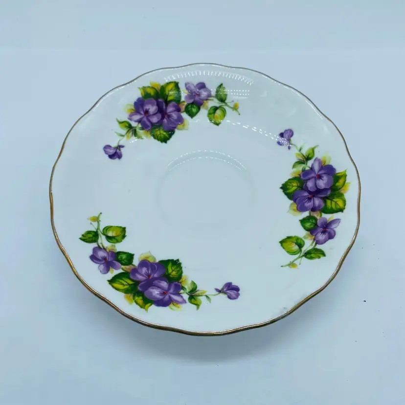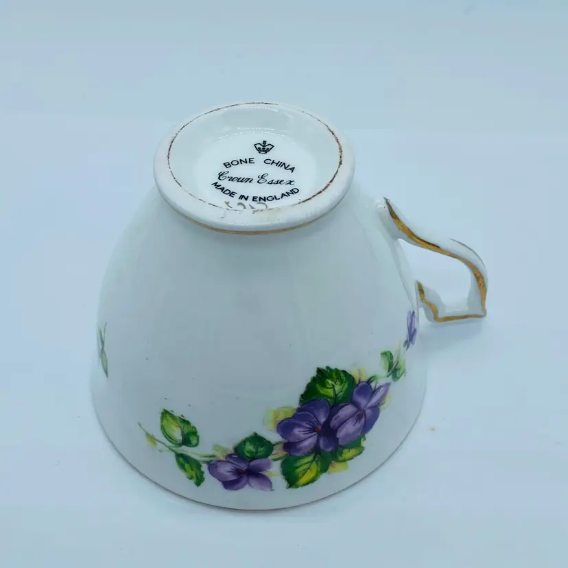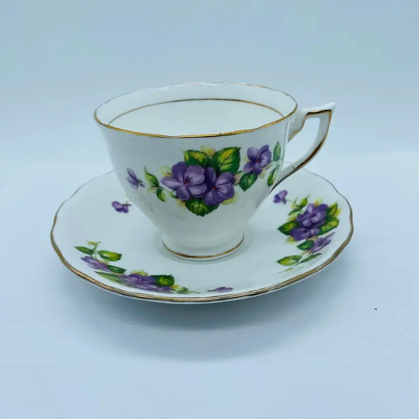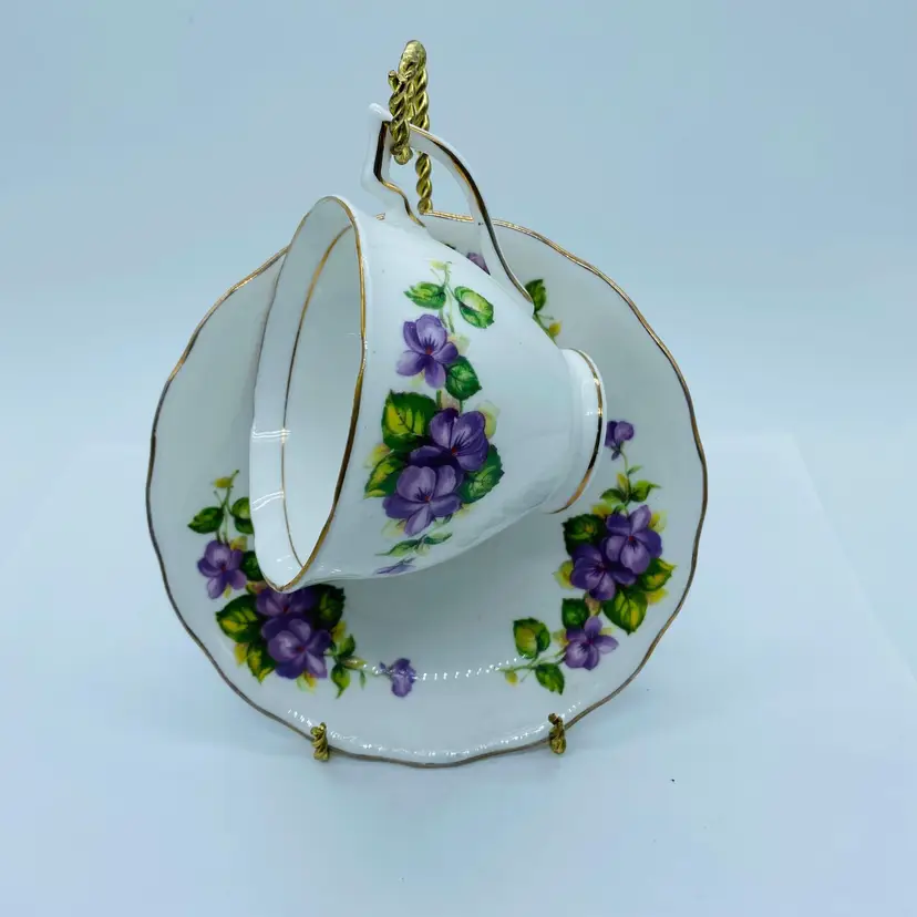 It features Purple Violets decorating the cup and the saucer as well as gold highlights on rim and handle.
