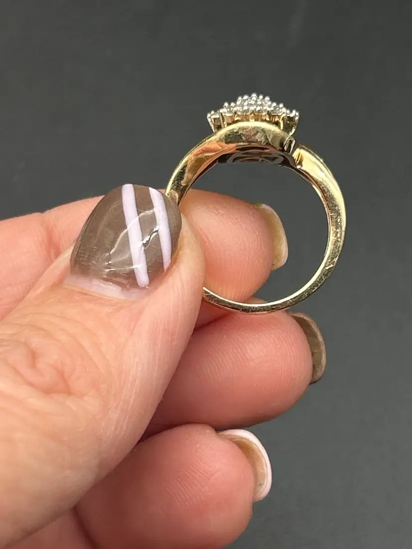 A timeless and sparkling beauty, this 10 karat yellow gold diamond cluster ring features a dazzling pavé-style cluster of round brilliant-cut diamonds set in a graceful swirl bypass design. The flowing curves of gold accentuate the center cluster, creating the look of movement and brilliance from every angle. • Metal: 10K Yellow Gold (tested and/or hallmarked) • Gemstones: Round brilliant-cut diamonds, approximately 0.25–0.35 carat total weight (estimated) • Ring Size: 5½ • Style: Swirl / Bypass Cluster • Setting: Prong and pavé set • Condition: Excellent; bright, clean diamonds and polished band