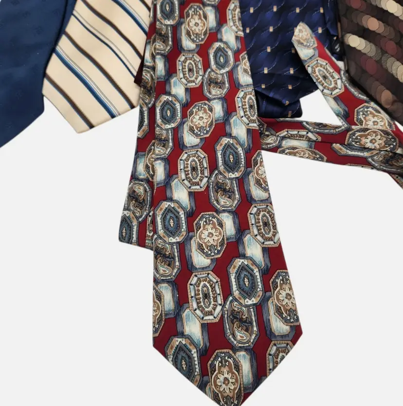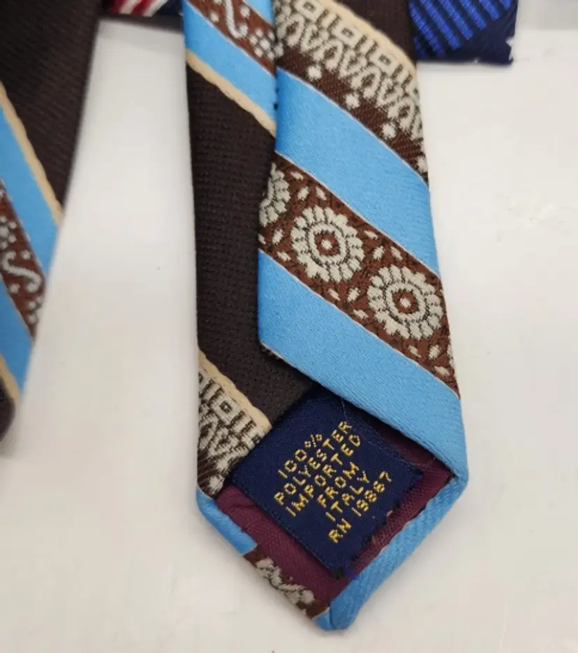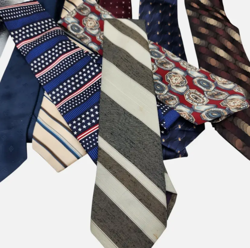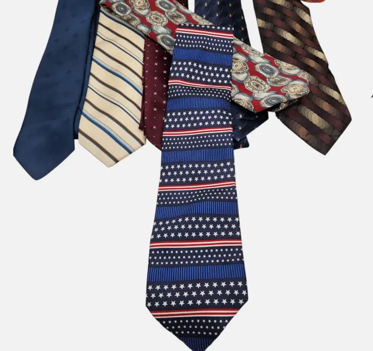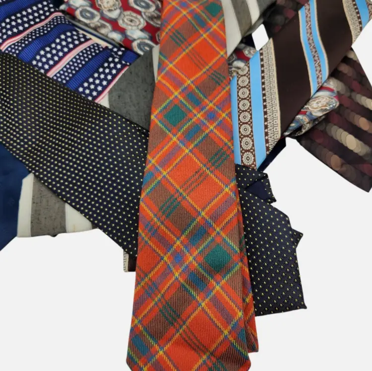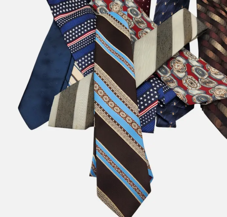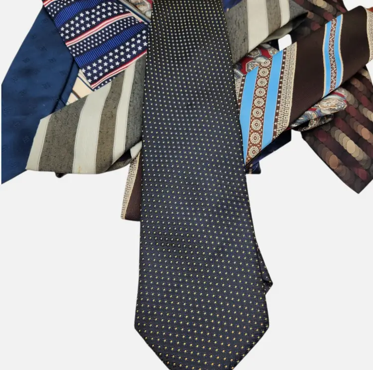 This 12 preowned men's neck tie bundle includes a variety of brands such as YSL, JC.Penny, and Towne Squares, offering a mix of patterns, colors, and themes. Made from mixed materials, these vintage ties cater to different tastes and preferences with their multicolor designs and classic styles. Some have stains damage.