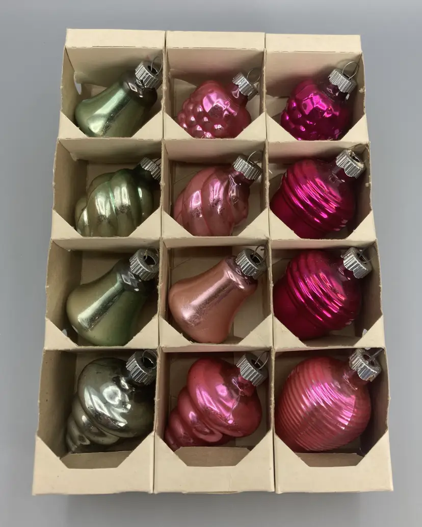 These ornaments are in good condition. They measure approximately 2 1/2" tall to 3" tall (including the hook) x 1 1/4" across to 1 3/4" across.