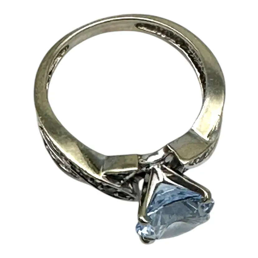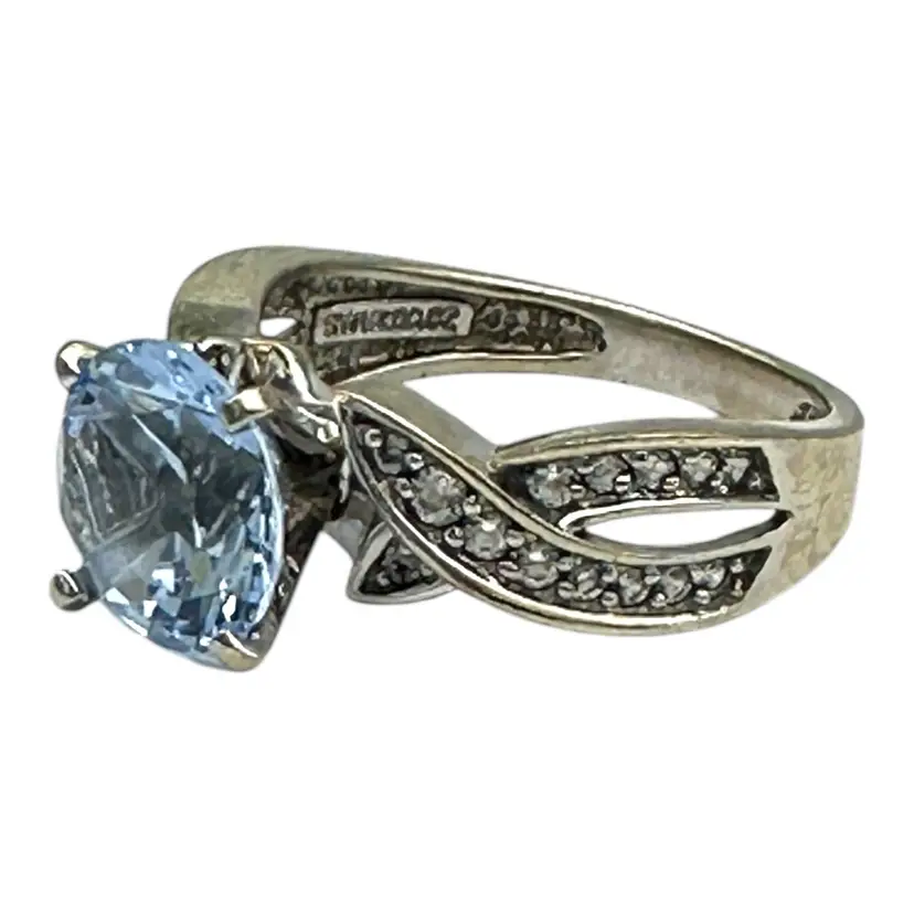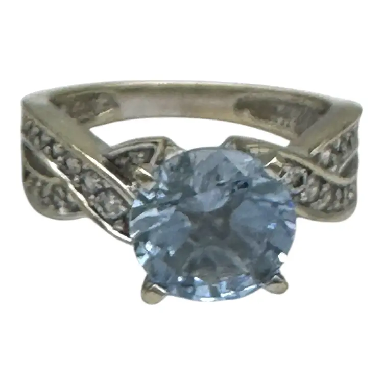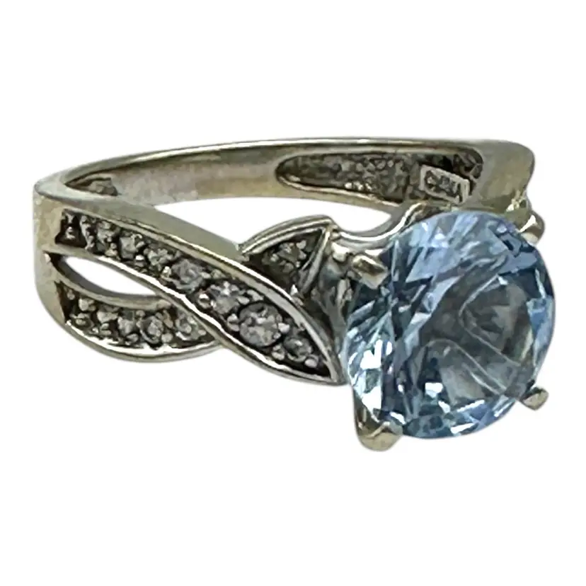 The ring has a twisted-style shank that is 6 1/2 mm wide Ring size 7 and consists of a 2.50 carat round brilliant blue topaz Centerstone The ring weighs 4.40 grams!