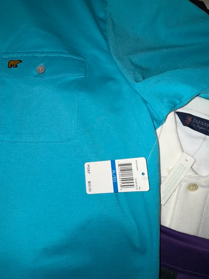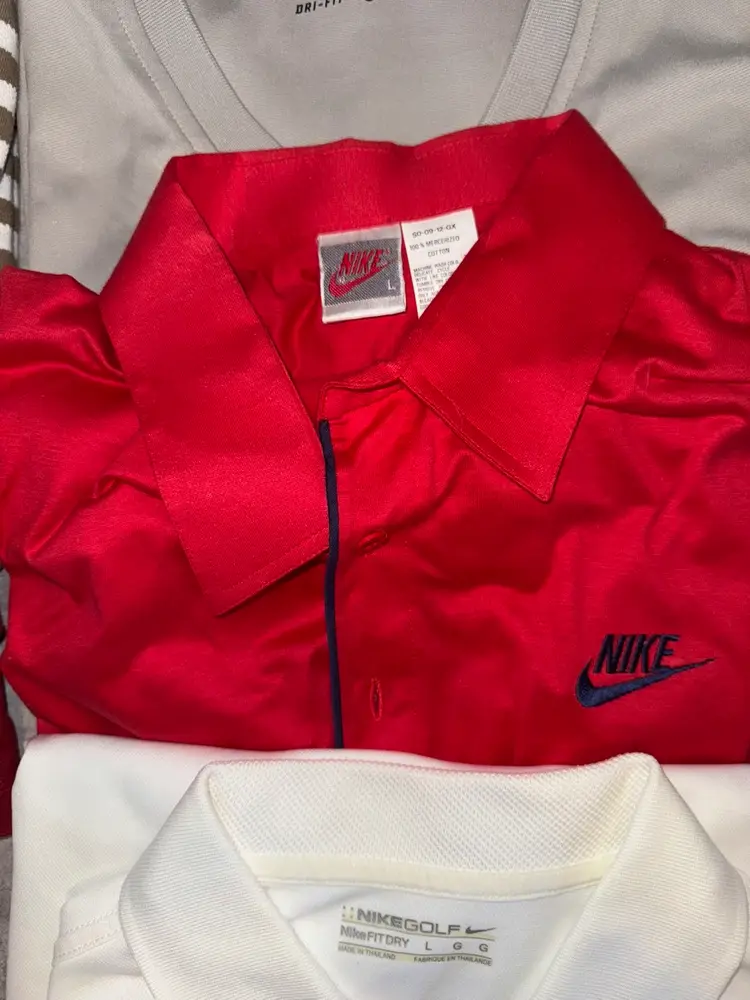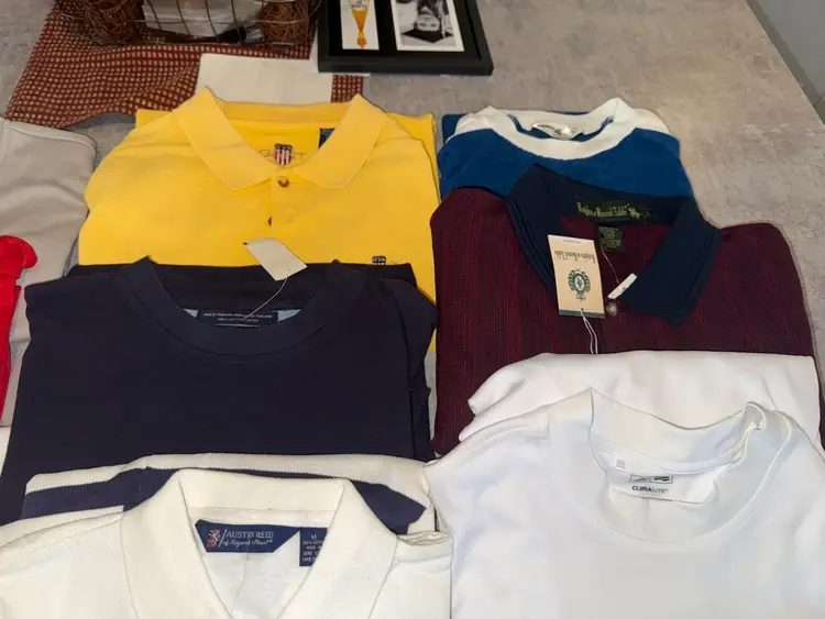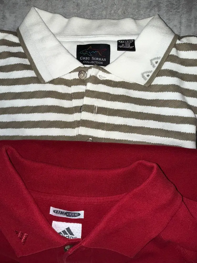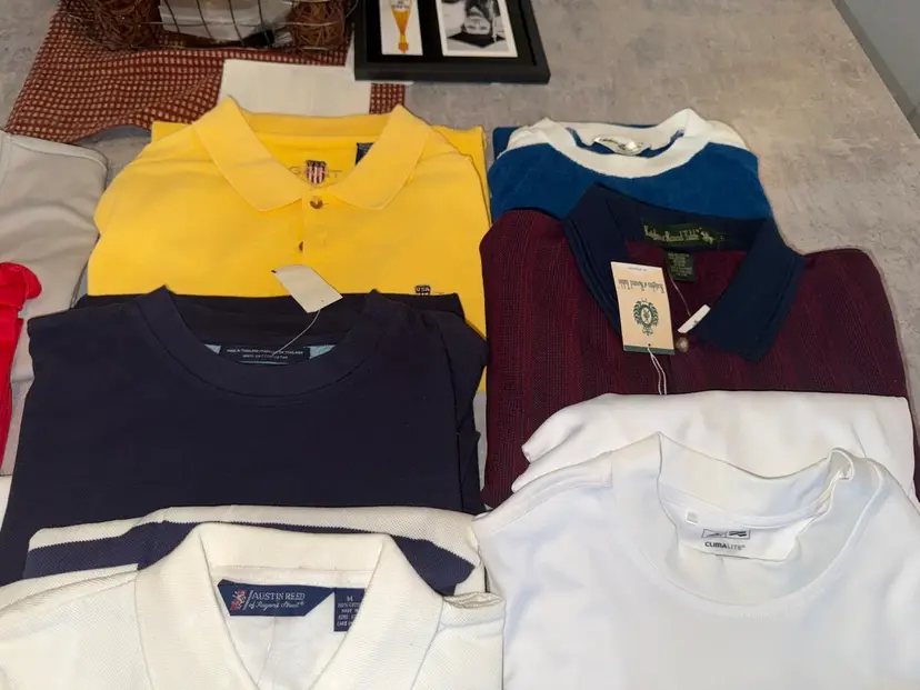 Vintage lot golf shirts several still have the tags Jack Nicholas ,Nike, Adidas, Greg Norman, USA Gant, Austin Reed medium still with the original tag, bobby Jones There was one or two mediums then everything it was large, extra large and a couple two XL Non-smoking environment These are vintage like new condition . And they’re very expensive shirts The grey Nike vest has been sold $14.99. There are still 14 shirts available. The purple Bobby Jones just sold for $14.99 plus shipping These shirts bring 15 bucks apiece
