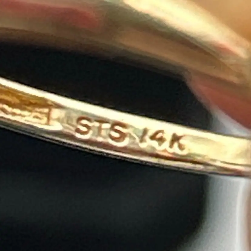 Elegant vintage-inspired ring crafted in solid 14K yellow gold, signed STS. The centerpiece is a brilliant oval-cut red stone set in a four-prong mounting, flanked on each side by sparkling baguette diamond accents. The openwork shoulders and polished gold band add extra sophistication to the setting. • Marked: STS 14K • Metal: 14K yellow gold • Stone: Oval red stone (exact type unknown) • Accents: Baguette diamond accents • Setting: Classic 3-stone inspired design with side detailing