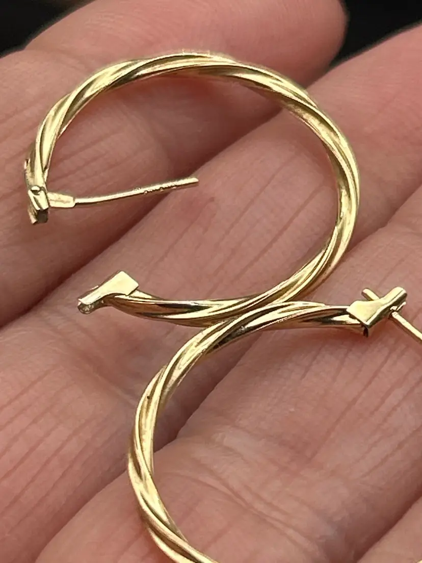 Elegant and timeless, these 14 karat yellow gold hoop earrings feature a beautifully twisted design that adds dimension and shine from every angle. Crafted in warm, polished gold, they offer a versatile look that transitions effortlessly from casual wear to evening elegance. • Metal: 14K Yellow Gold (tested and/or hallmarked) • Design: Twisted hoop • Diameter: Approximately 1 inch (estimate based on scale) • Closure: Hinged latch back • Style: Lightweight and comfortable for daily wear • Condition: Excellent vintage condition; bright polish and secure closures