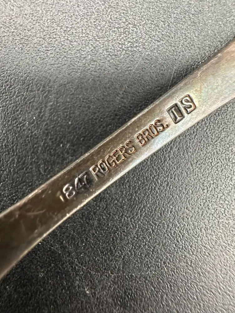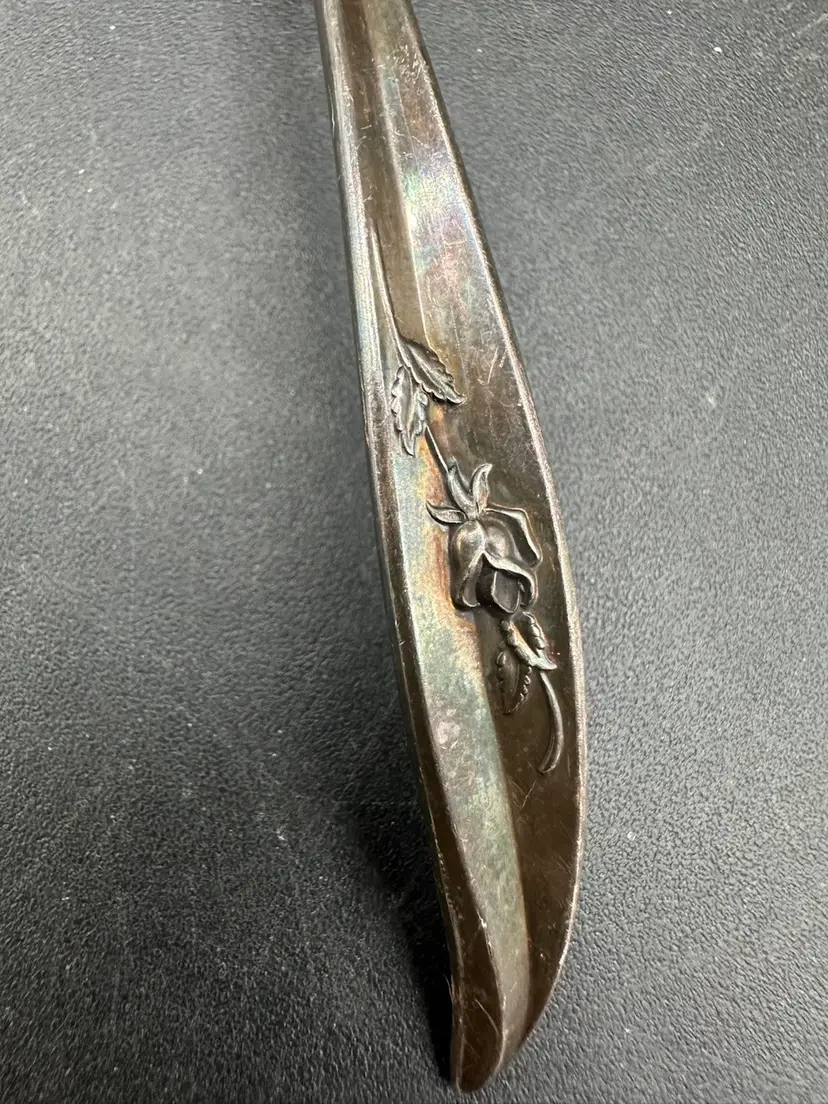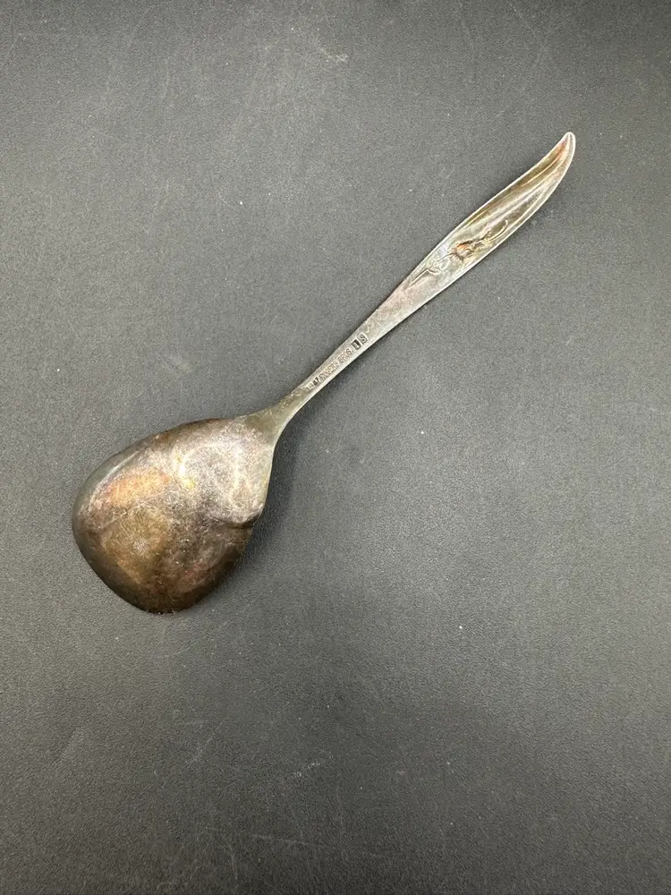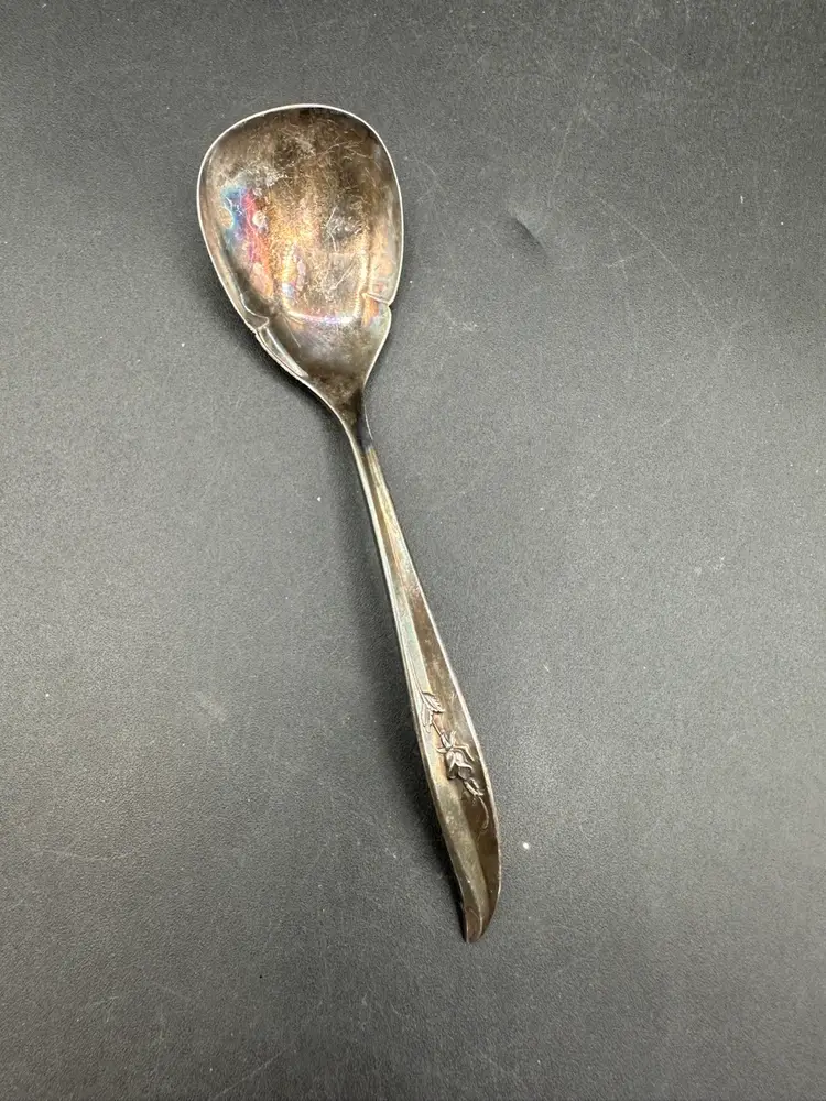 Gorgeous oil slick patina, Silvertone base. Great flourish and whimsy with this spoon for your treasure trove!
