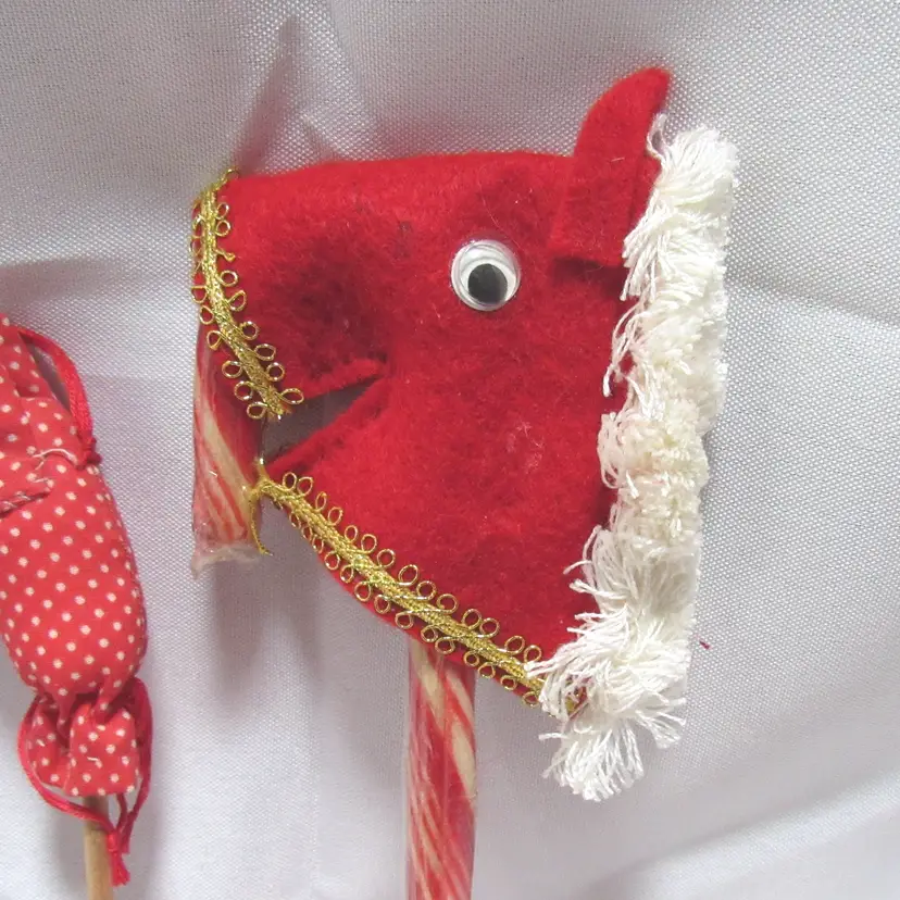 19 Candy Canes and Stick Horses Christmas Ornaments All have been used for many years on our tree. Most can be hung, but I just laid them on the end of the branches. 10 - 6.5" 5 - 4" 1 - 3" 1 - 6.75" Theses are all plastic w/red ribbon wrapped around them 1 handmade felt stick horse w/ uneatable possibly broken candy cane ( 15 yrs old) 8" long 1 cloth stick horse w/wooden stick 6.5" long