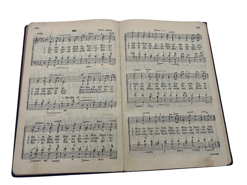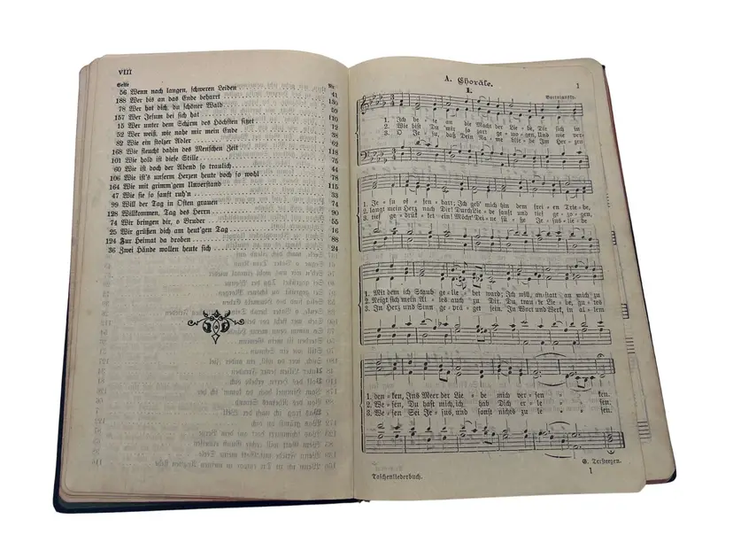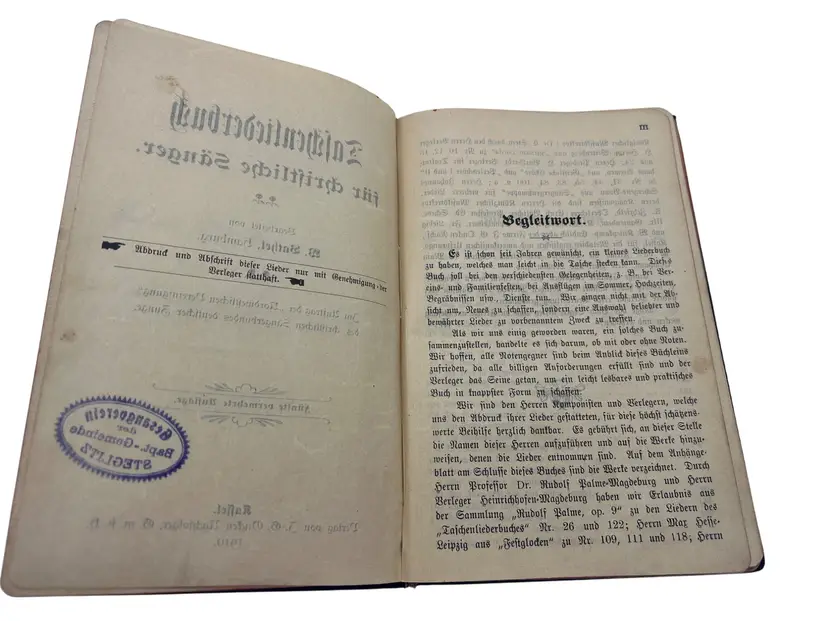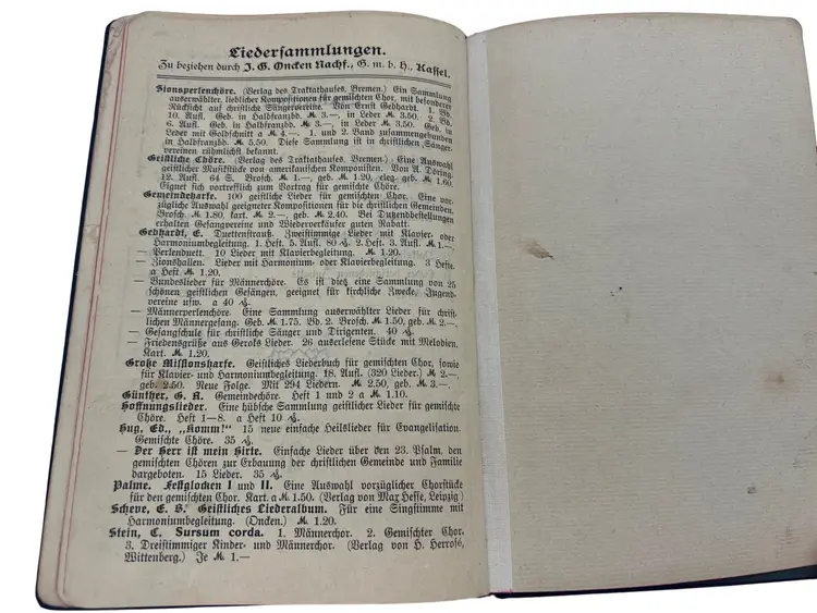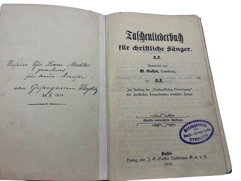 Compact early-20th-century 1910 German Baptist choir hymnal with full musical notation, produced by the noted evangelical publisher Oncken. Fifth, enlarged edition; portable format for mixed choir use. Nice artifact of German free-church music culture with provenance to the Steglitz Baptist choral society. Church stamp from Gesangverein der Bapt.-Gemeinde Steglitz and a dated 1911 gift inscription. Issued for the Nordwestliche Vereinigung of the Christlicher Sängerbund deutscher Zunge.