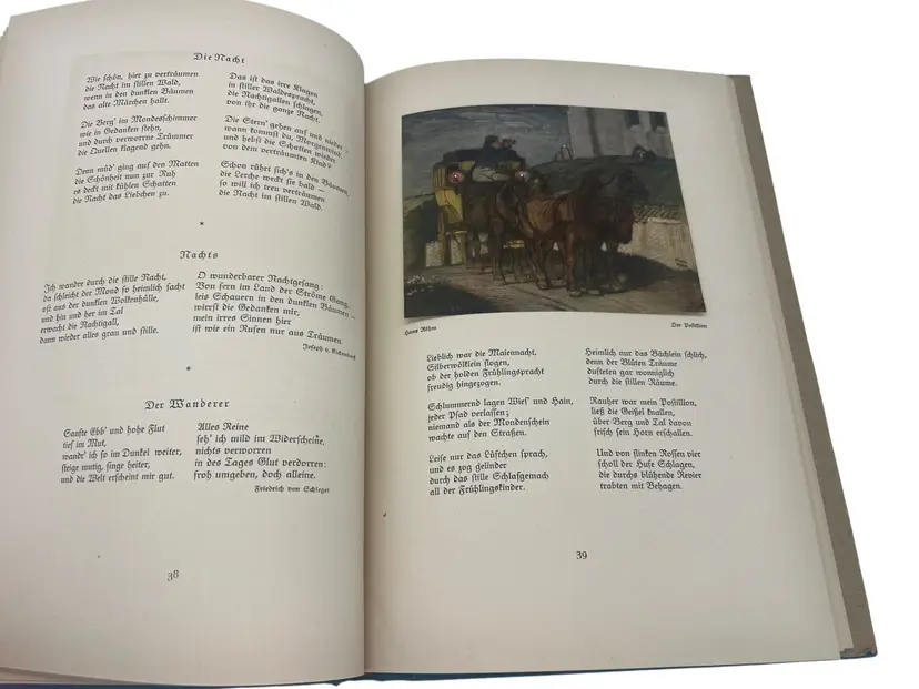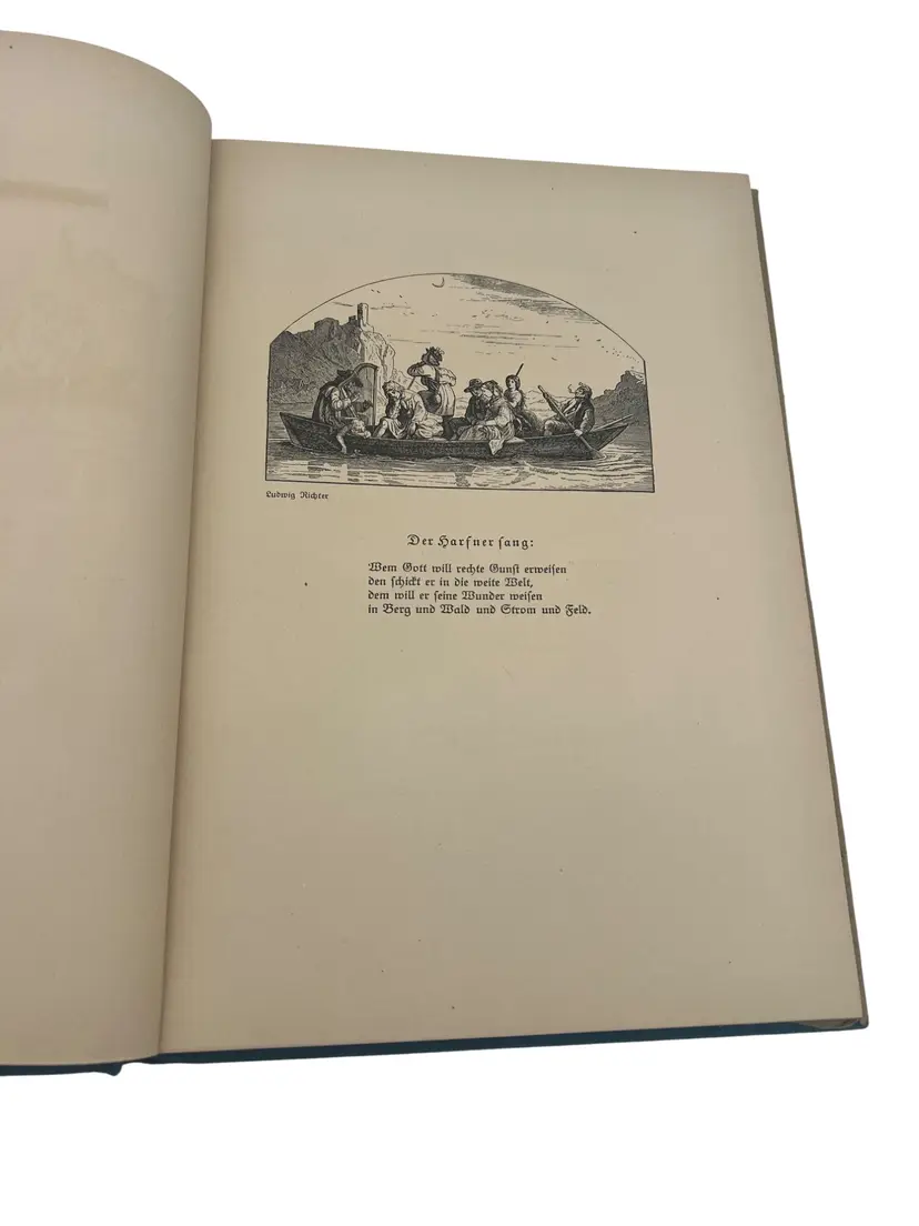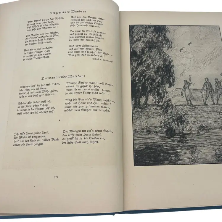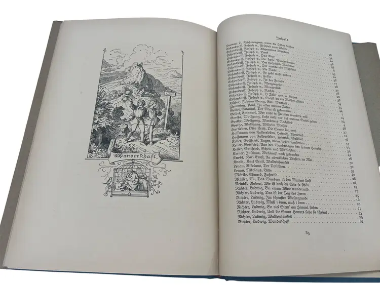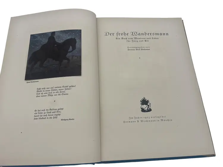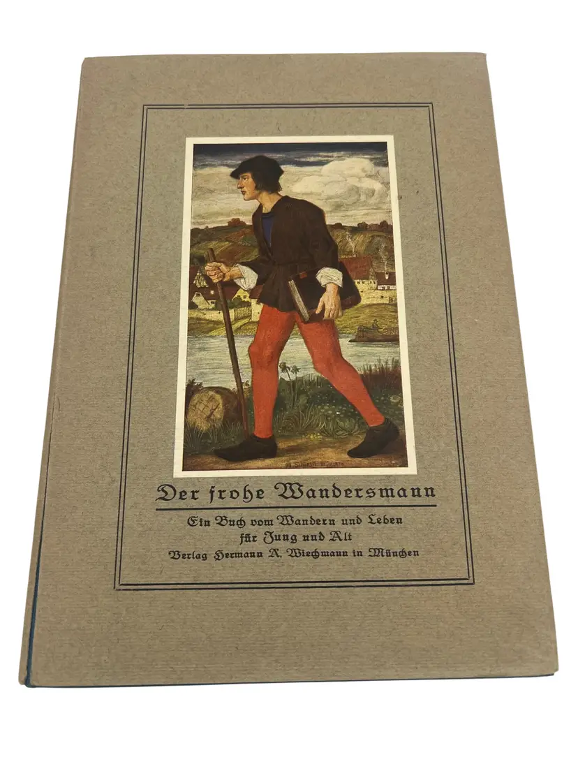 Classic 1925 Munich edition of Der frohe Wandersmann—an illustrated German anthology about hiking and outdoor life for young and old. Edited by Hermann Adolf Wiechmann; texts by Goethe, Eichendorff, Uhland, Keller and others. Features engravings after Ludwig Richter and several tipped-in color plates (incl. Hans Thoma). Hardcover 10" x 7", 95 pp. Complete with original dust jacket and publisher’s slipcase. A handsome example of interwar German “Wandern” culture.