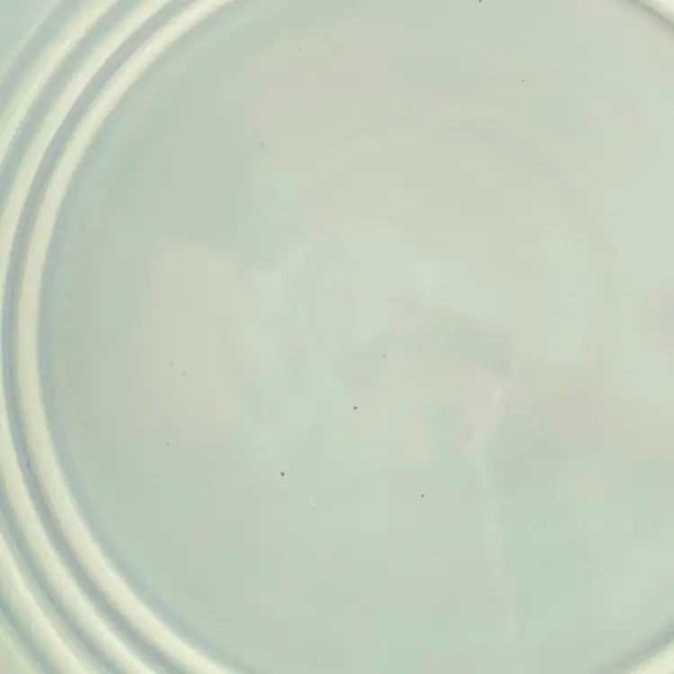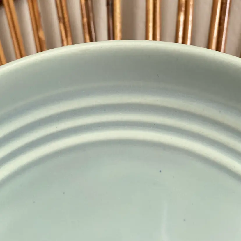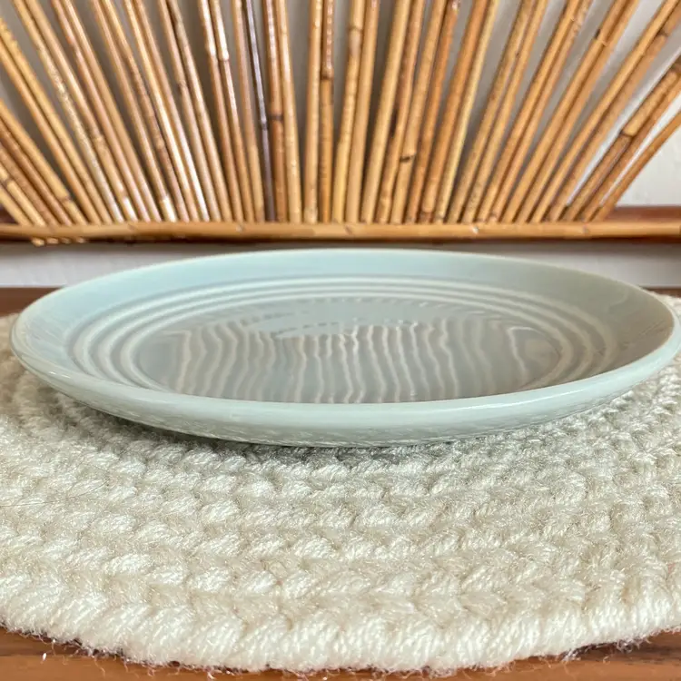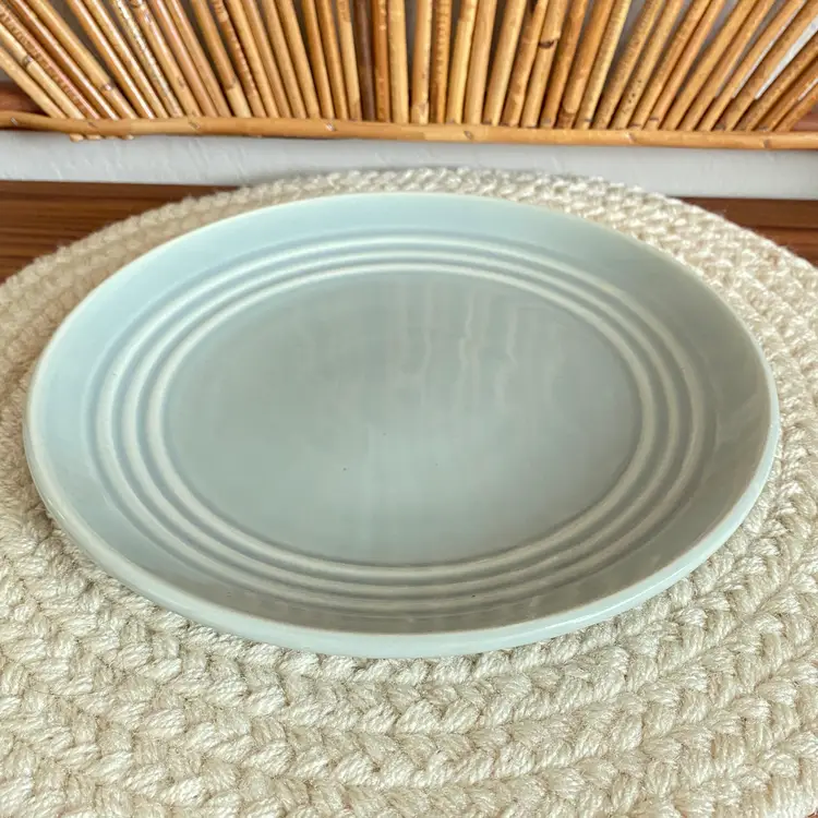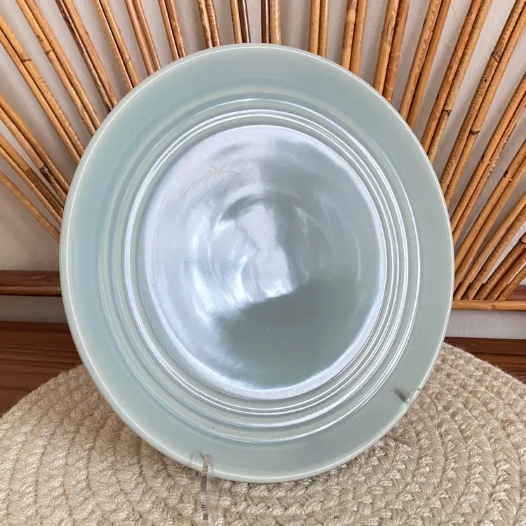 Vintage mid-century Bauer pottery salad plate from the California Ring line in their gray glaze which has a lot of aqua to it. It has ridged rings around the rim and a glossy finish. 9-3/4" diameter. Backstamp reads Bauer Made in USA Los Angeles. In very good condition, no chips or scratches.