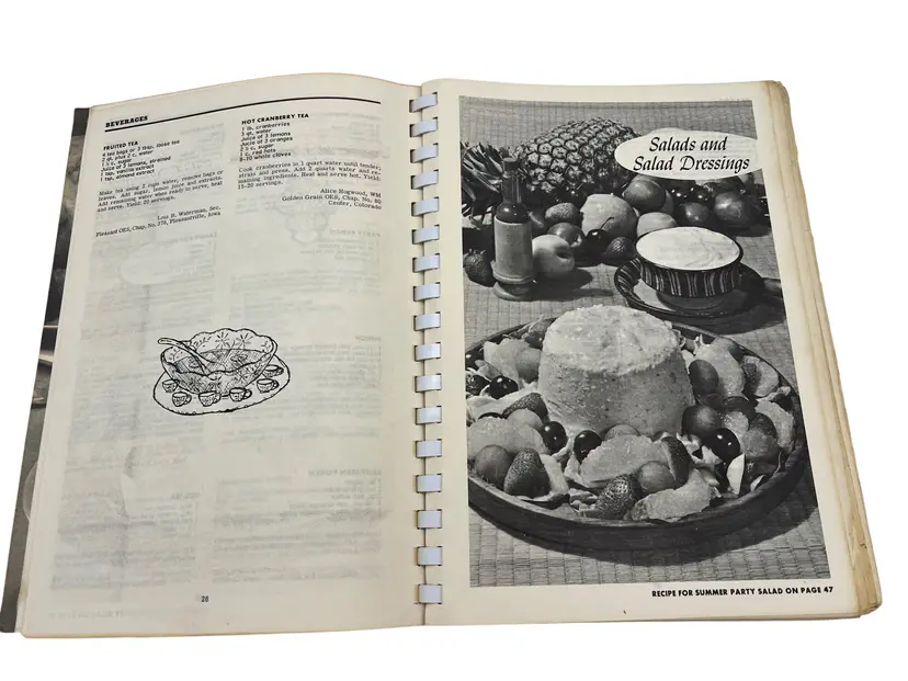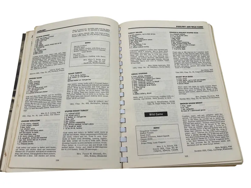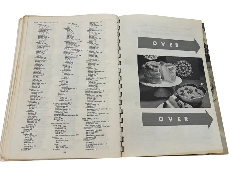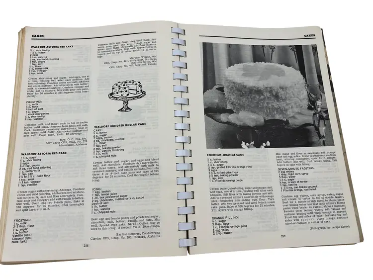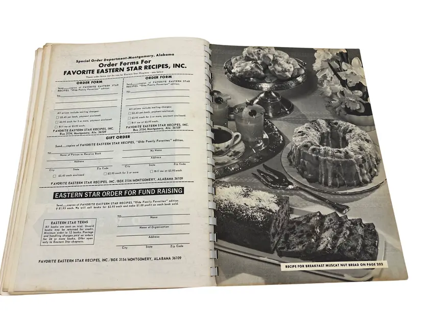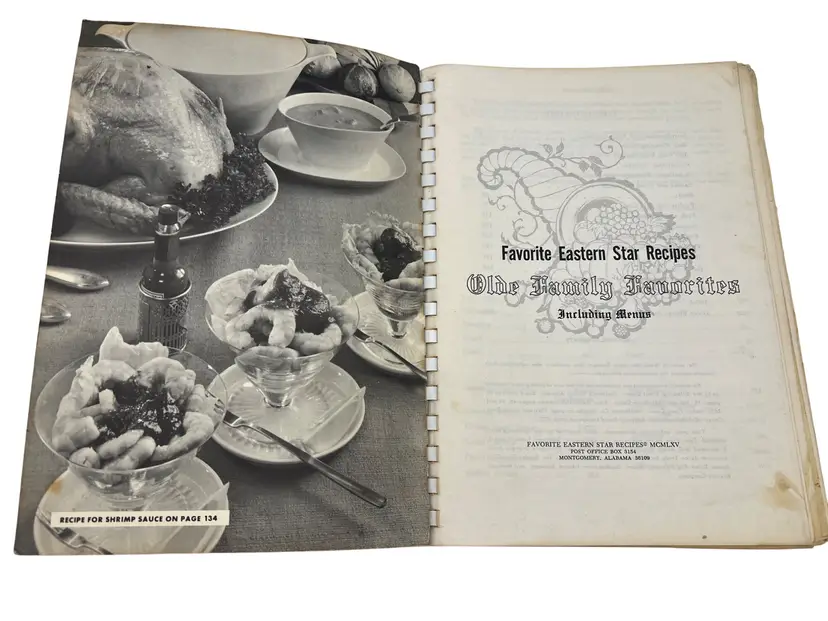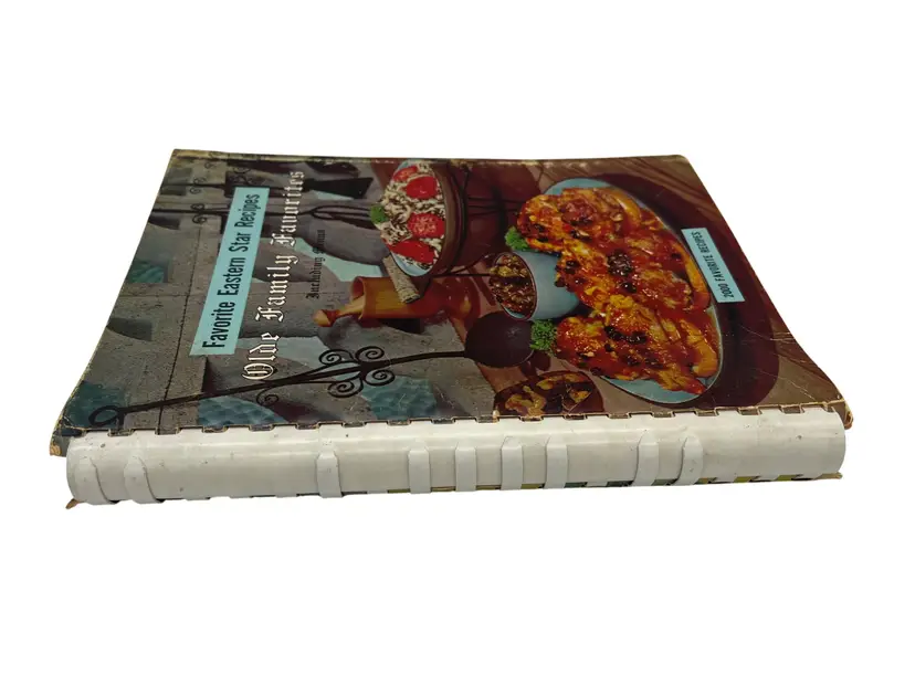 Classic 1965 O.E.S. community cookbook from Montgomery, Alabama—Olde Family Favorites (Including Menus). Plastic-comb bound, 382 pp., “2000 Favorite Recipes” covering appetizers to desserts, breads, casseroles, wild game, plus menu-planning pages and a full index. A solid mid-century church/social-club cookbook with great period dishes and b/w photo inserts. Measures about 10" x 7".