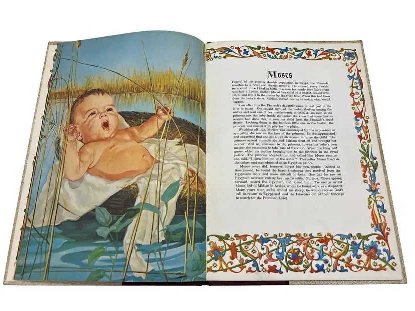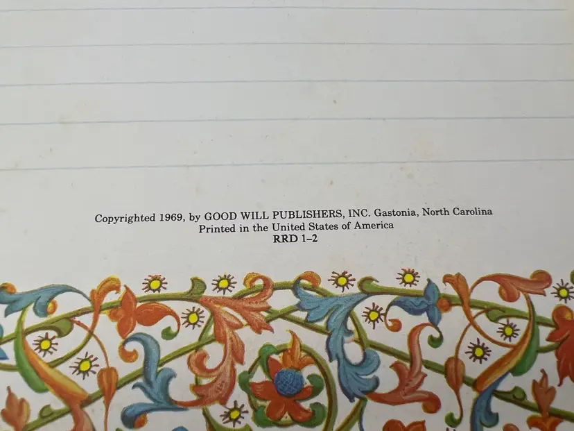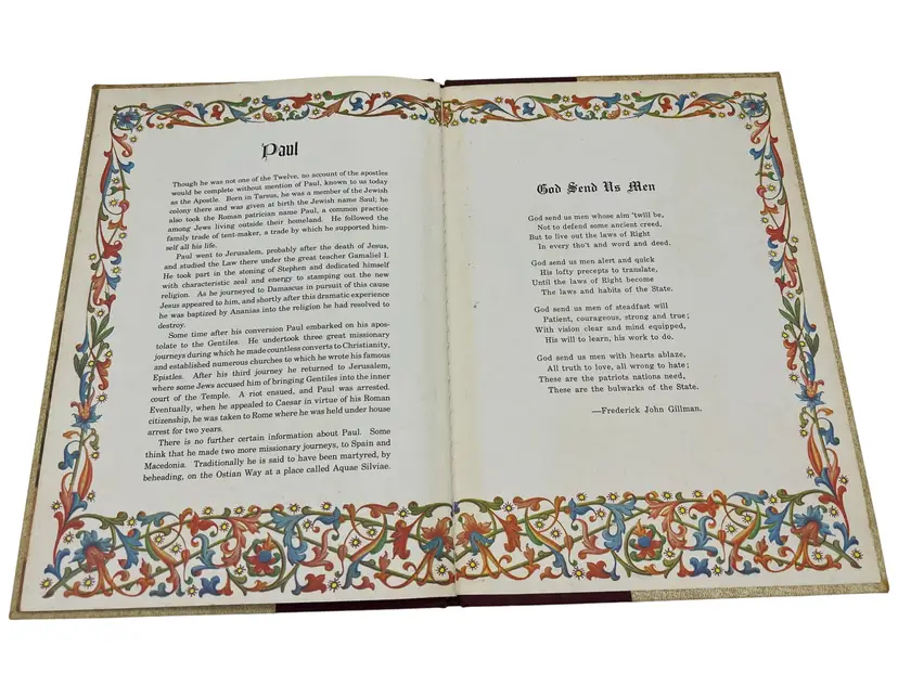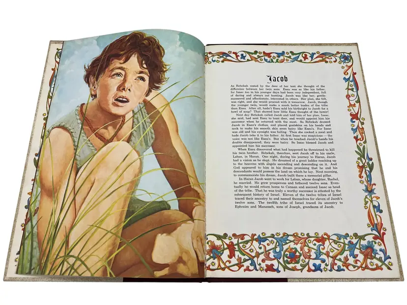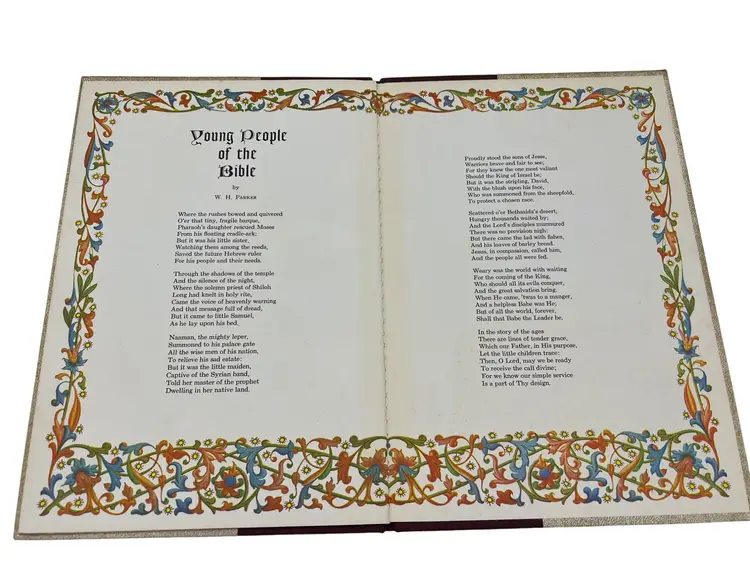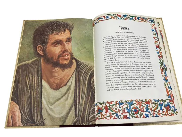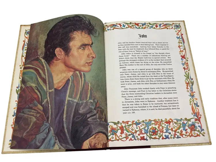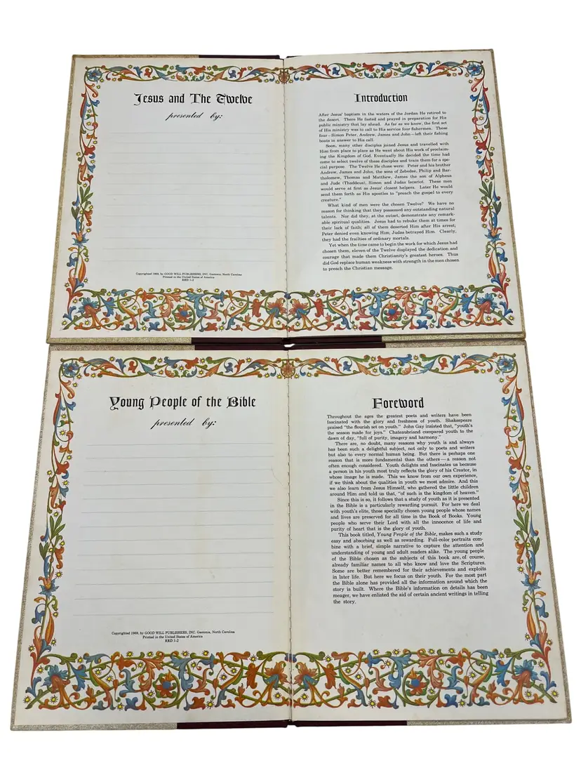 Pair of vintage 1969 Good Will Publishers hardcovers: Jesus and the Twelve and Young People of the Bible. Uniform maroon/cream faux-leather boards with gilt emblem, illuminated borders, large full-page color portraits with facing biographical text, plus presentation pages. Each measures approximately 10.25" x 7". Great for devotional reading, teaching aids, or vintage shelf decor.