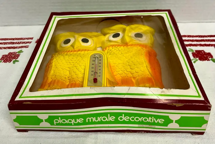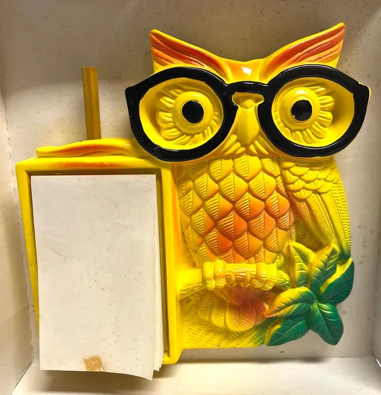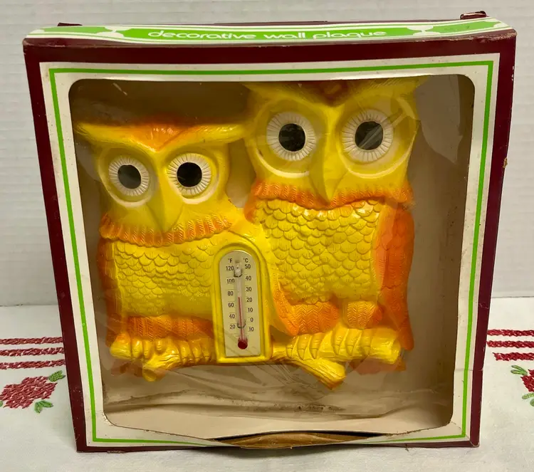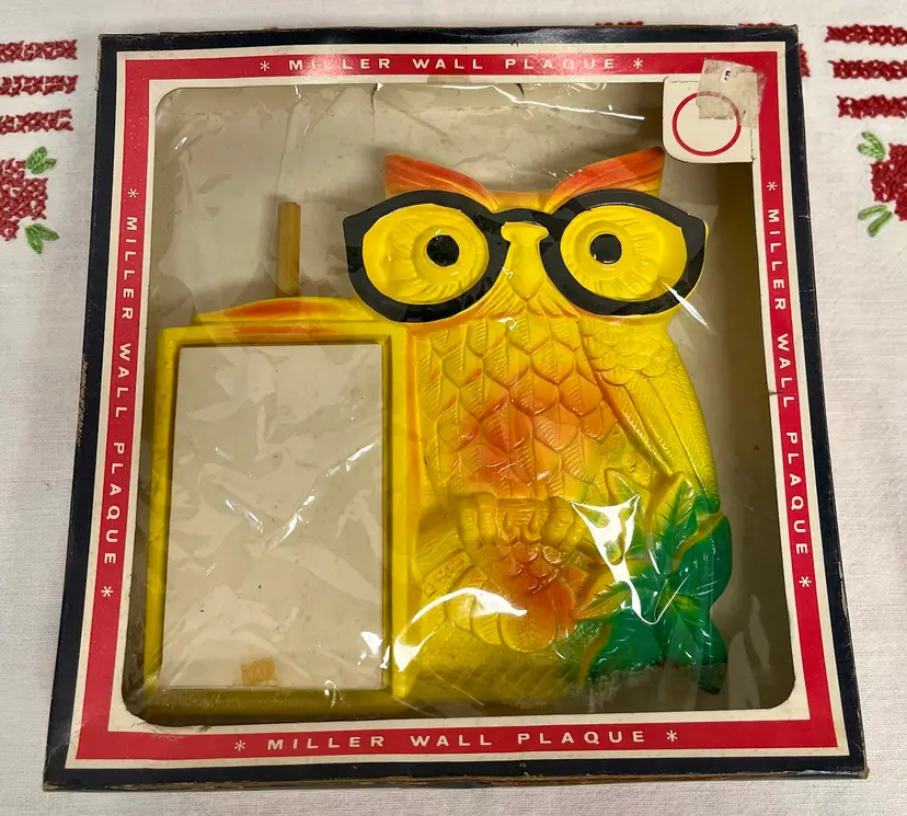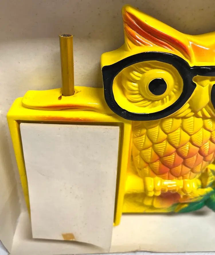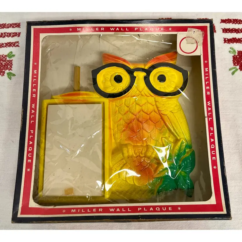 1970’s Miller Studio Yellow Owl Chalkware Decorative Wall Plaques , Notepad Or Thermometer, NOS In Original Box