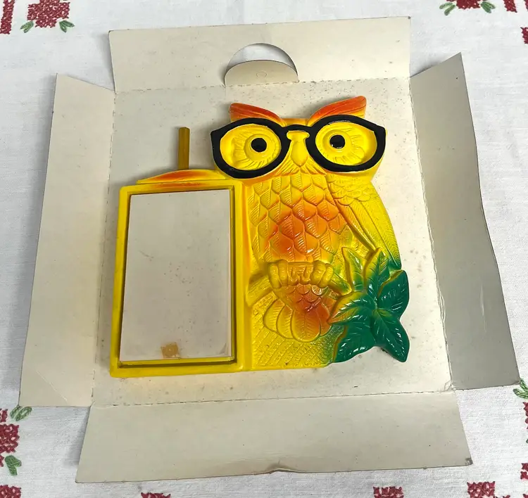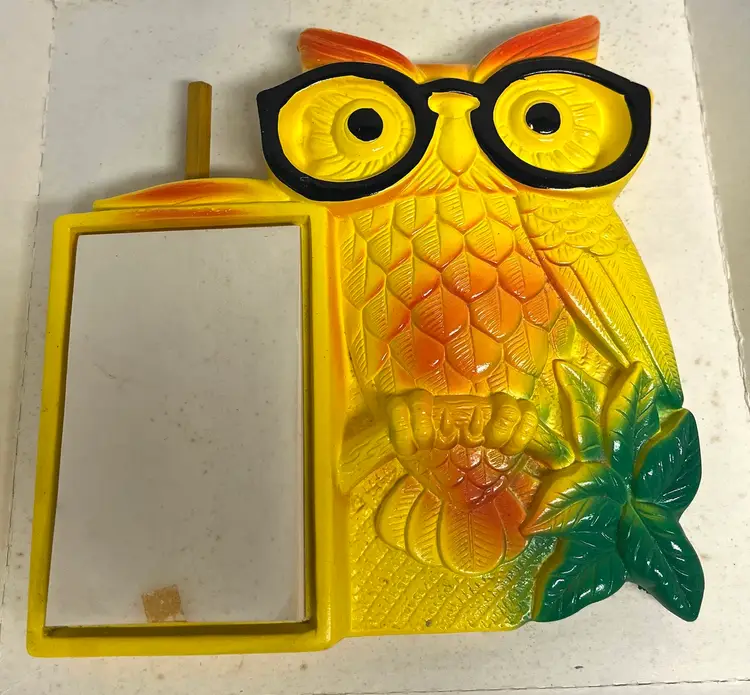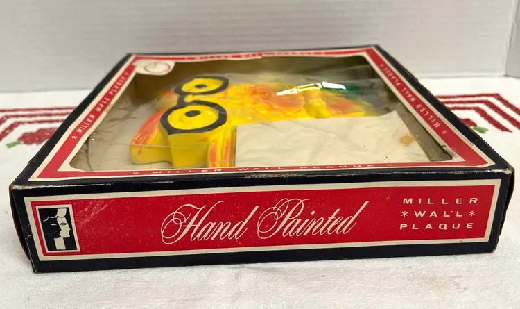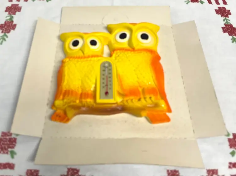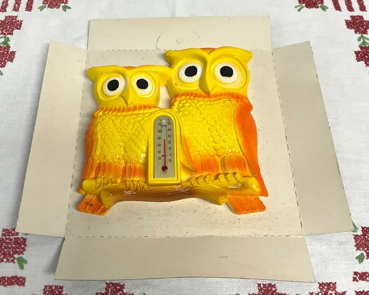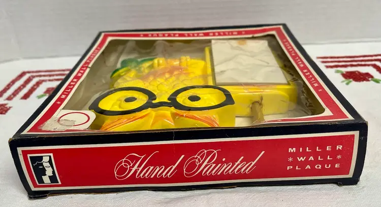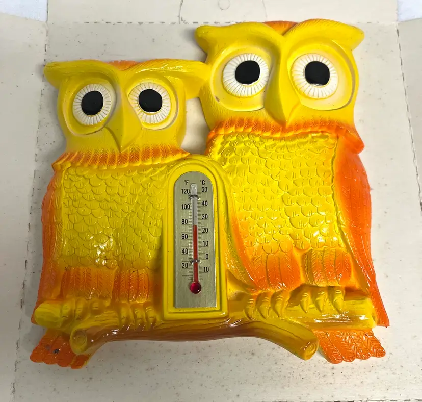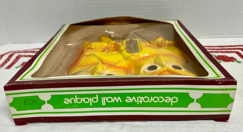 1970’s Miller Studio Yellow Owl Chalkware Decorative Wall Plaques , Notepad Or Thermometer, NOS In Original Box