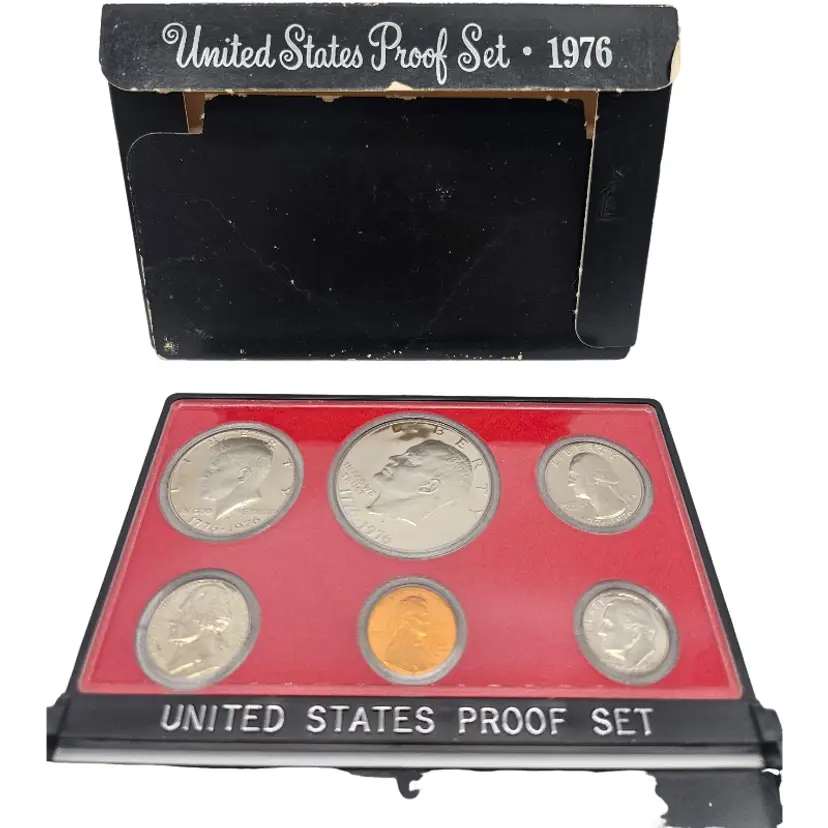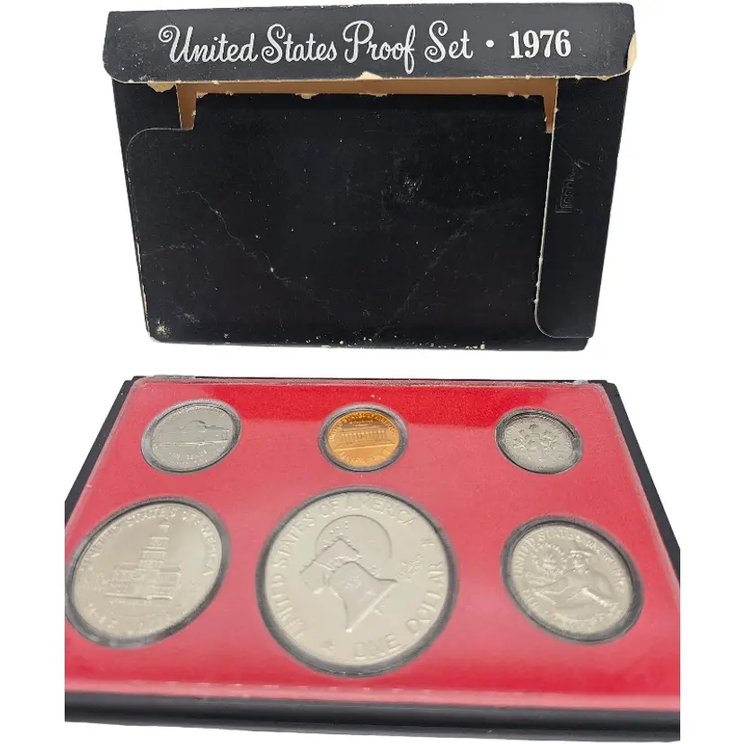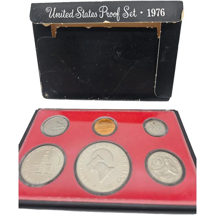 The 1976 Proof Coin Set is an uncirculated collection of coins minted in San Francisco by the U.S. Mint. The set includes a $1 coin struck as proof, making it a desirable addition for collectors interested in US coins from the late 1970s. This set is a valuable piece of history from the United States, encapsulated in pristine proof condition for preservation and display.