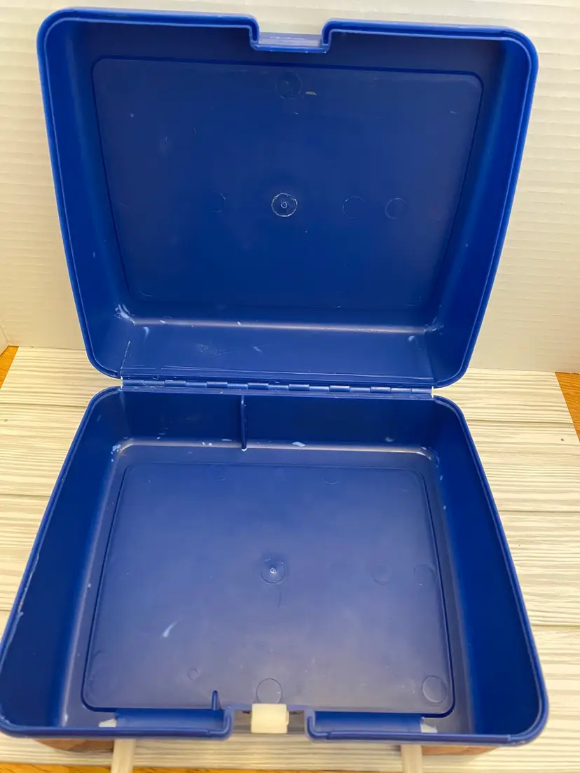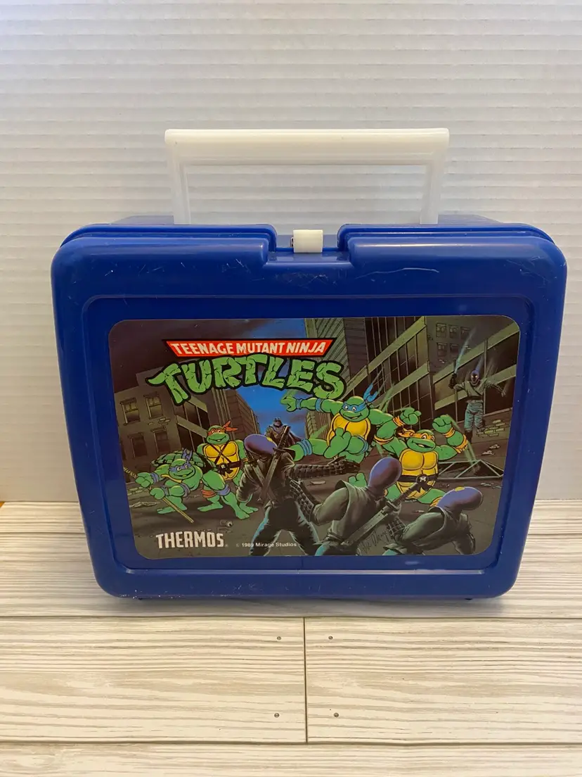 This vintage 1989 lunch box and thermos set is a must-have for any Teenage Mutant Ninja Turtles fan! The bright blue design features all four turtles in action, making it the perfect addition to any collection. The thermos is made of durable plastic, ensuring your drinks stay nice and cold for hours.