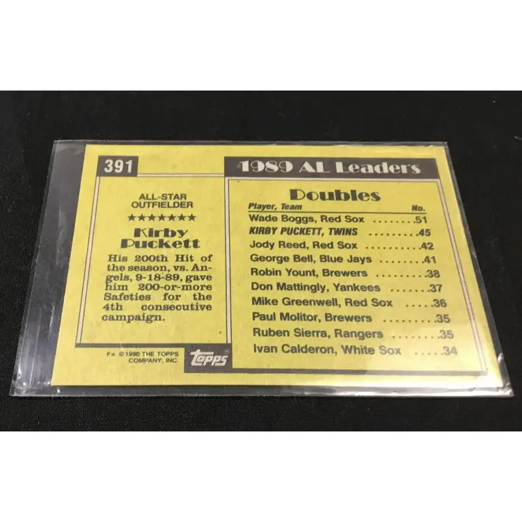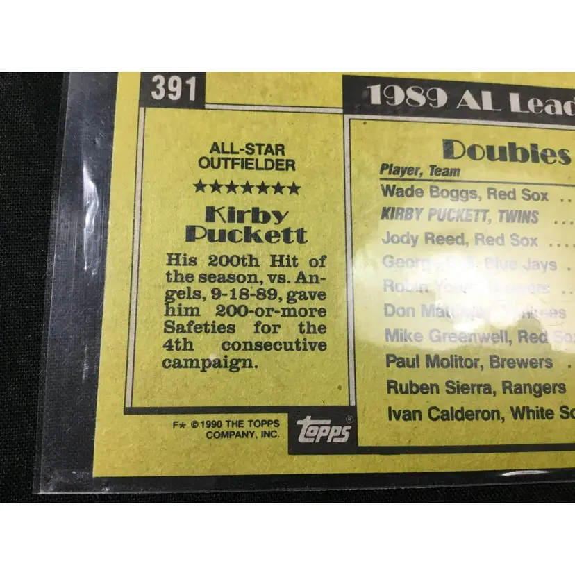 Kirby Puckett Topps collectors card #391, not graded, in plastic sleeve, no visible damage. Will be shipped in plastic sleeve, sandwiched between 2 card board pieces that fit tightly in a zip lock bag, all inside a padded mailer.