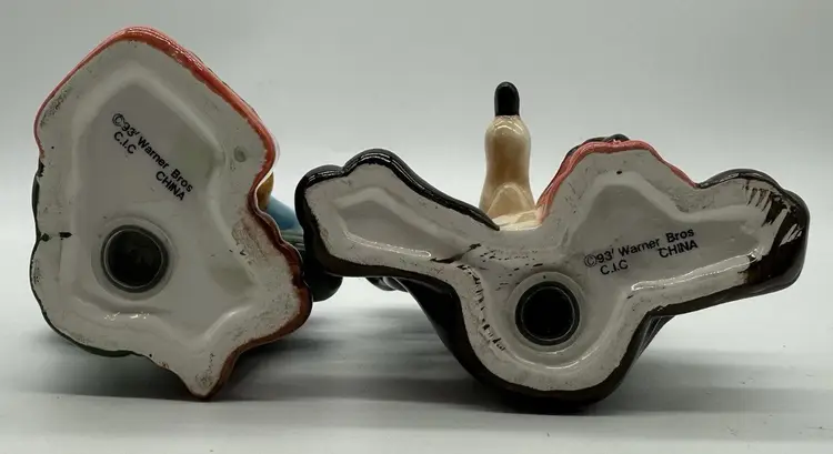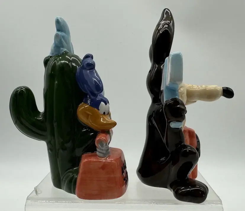 1993 Looney Tunes Wile E Coyote and Roadrunner Salt and Pepper Shakers. Measures approximately 5” tall. No chips or cracks noted.