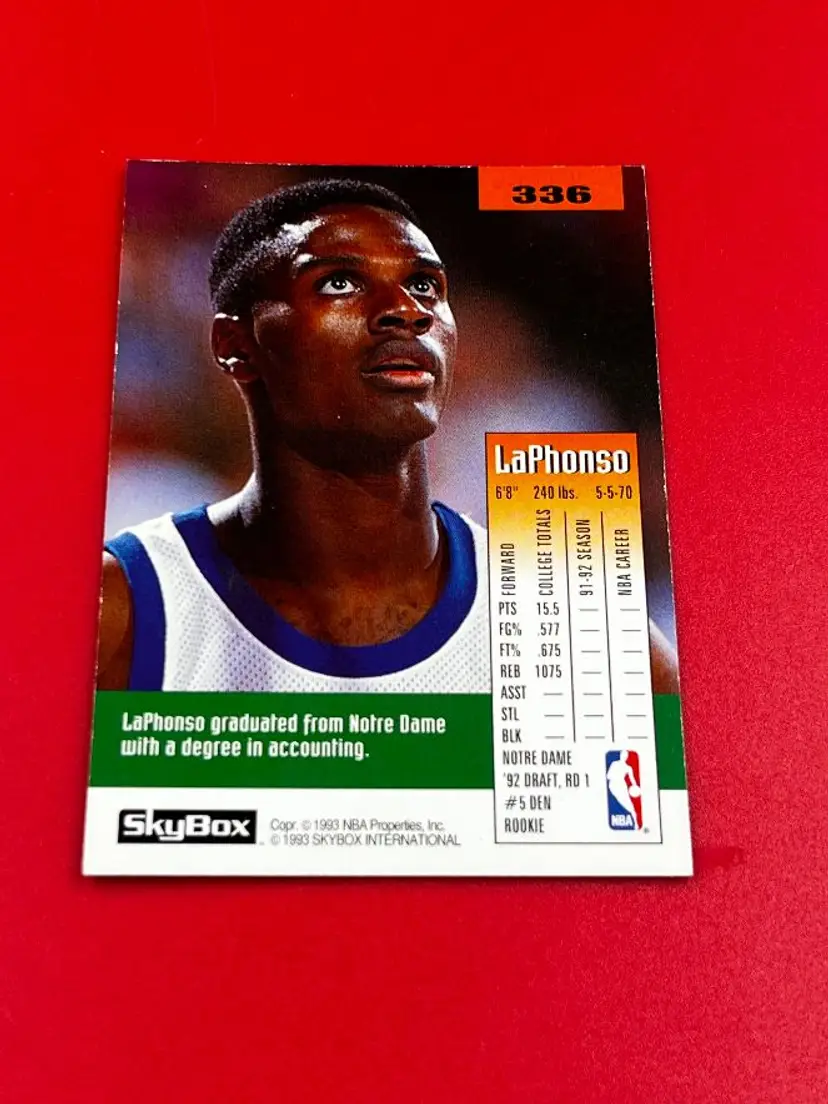Hello, what we have is a Collector Trading Card by: Skybox. Year: 1993. Team: Nuggets. Player: Laphonso Ellis. Number: 336.