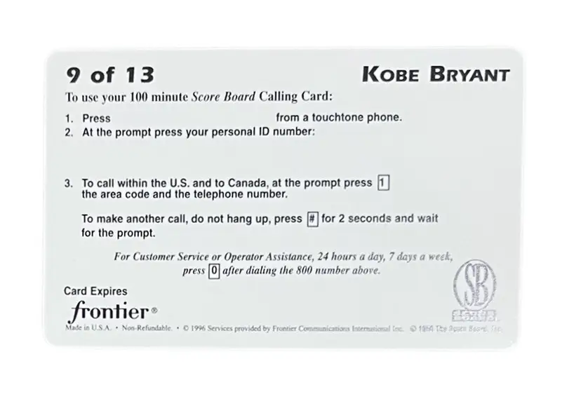 This listing is a 1996 Score Board 100$ Phone Card #9 Kobe Bryant.. It is in very nice condition - See images for condition details.