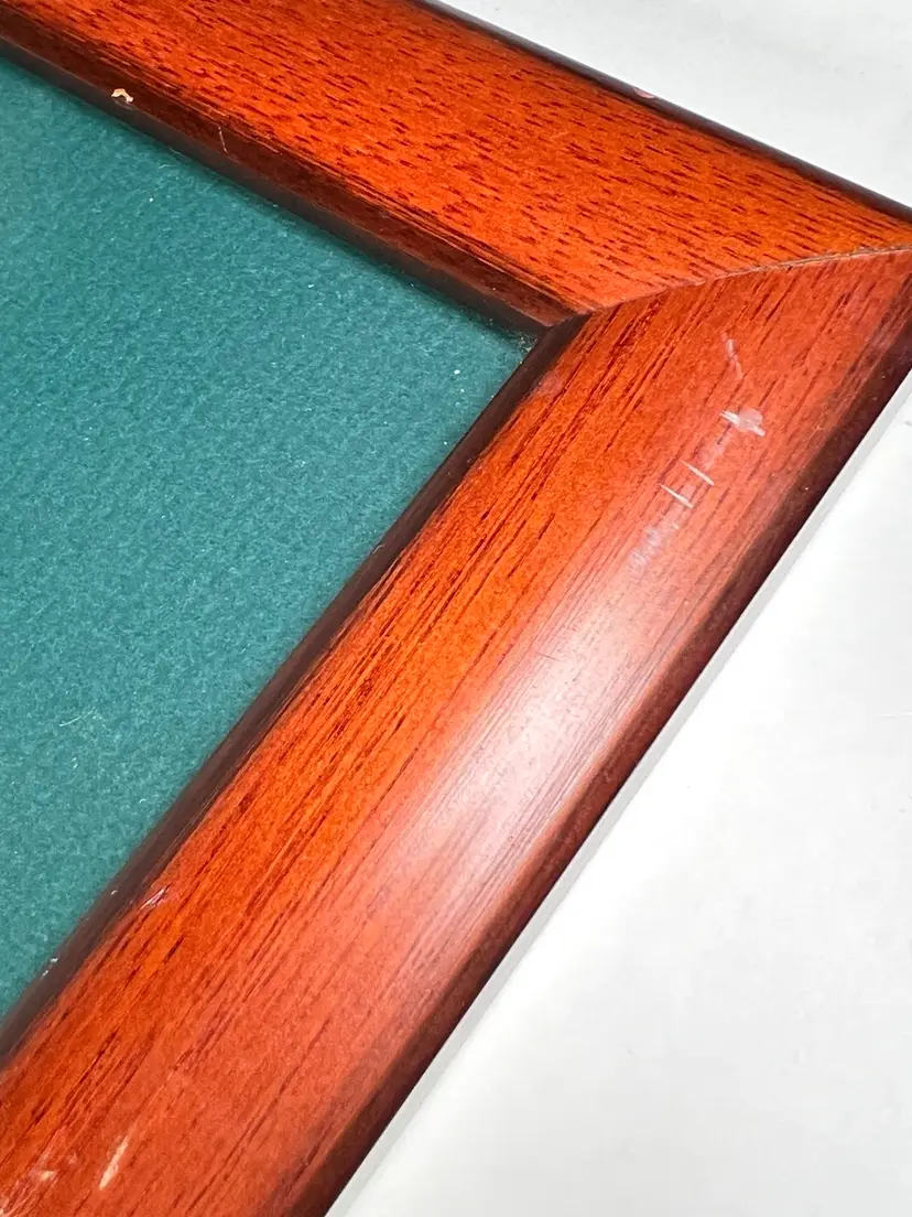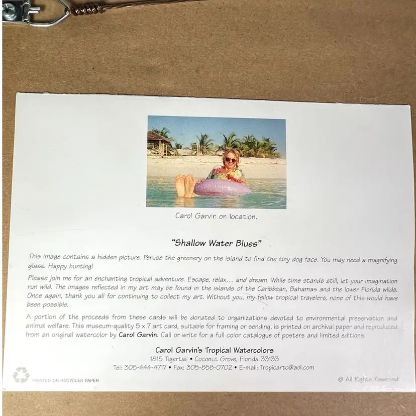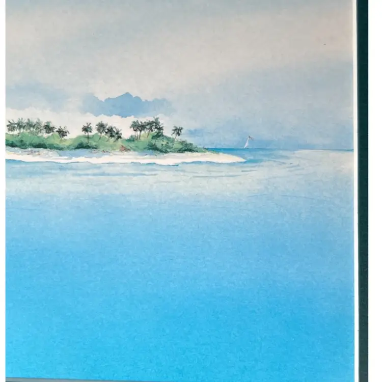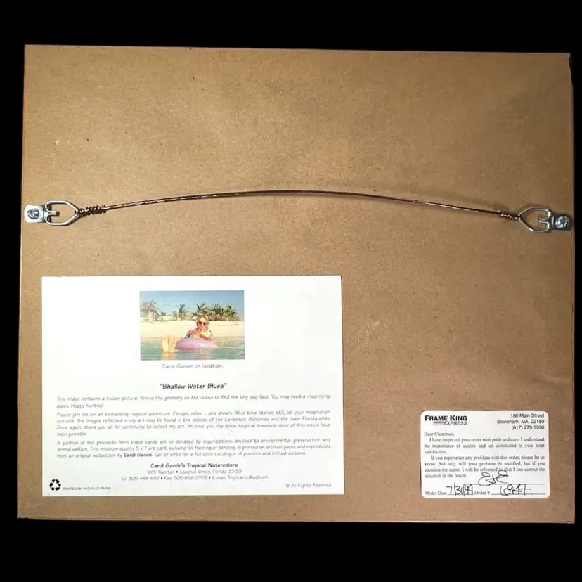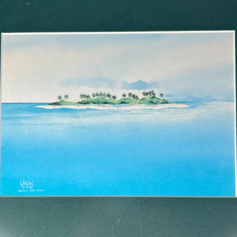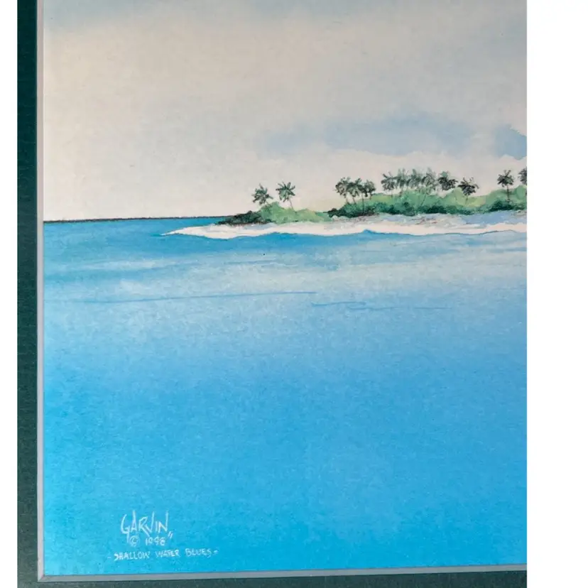 Painting title: Shallow Water Blues 1998 signed watercolor card painting by Carol Garvin. Tropical island surrounded by blue waters and white sand beach with a sailboat ⛵️ in distance. There’s also a hidden image, as described on her artist info card on back. Framed and matted. Reduced glare glass to protect painting. Back has a strong hanging wire & hardware. Artist and framing information cards attached to back. Frame: 13” W x 11” H x 1/2” D Painting: 4-3/4” W x 6-3/4” H Weighs 1 pound 10 ounces Condition: Some scratches around frame and one edge , as shown in photos.