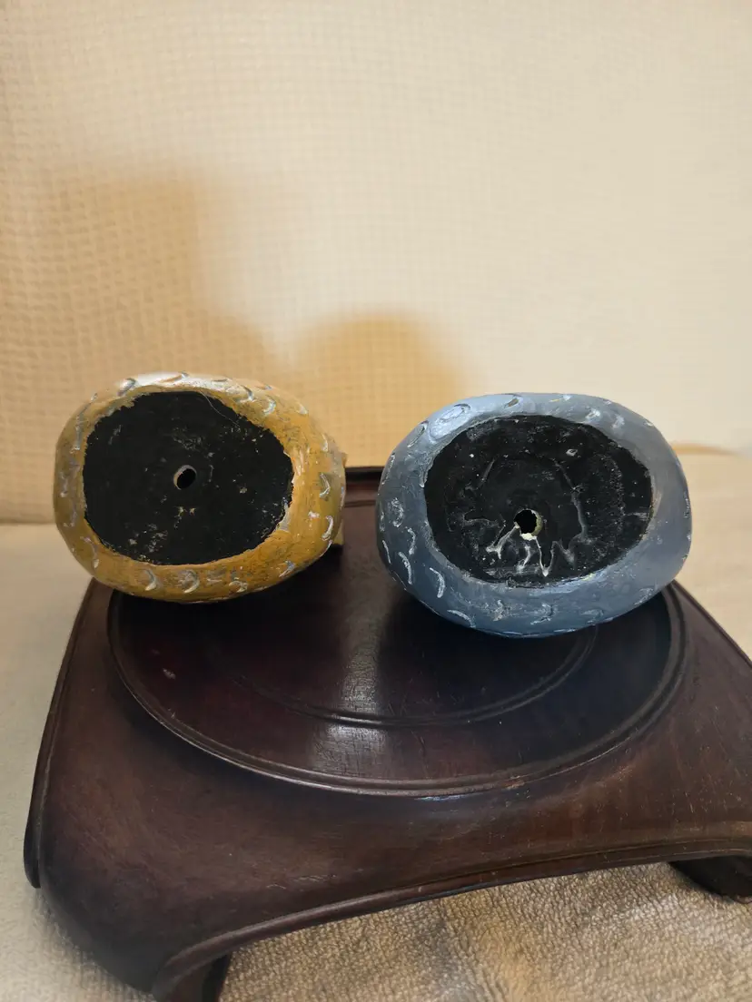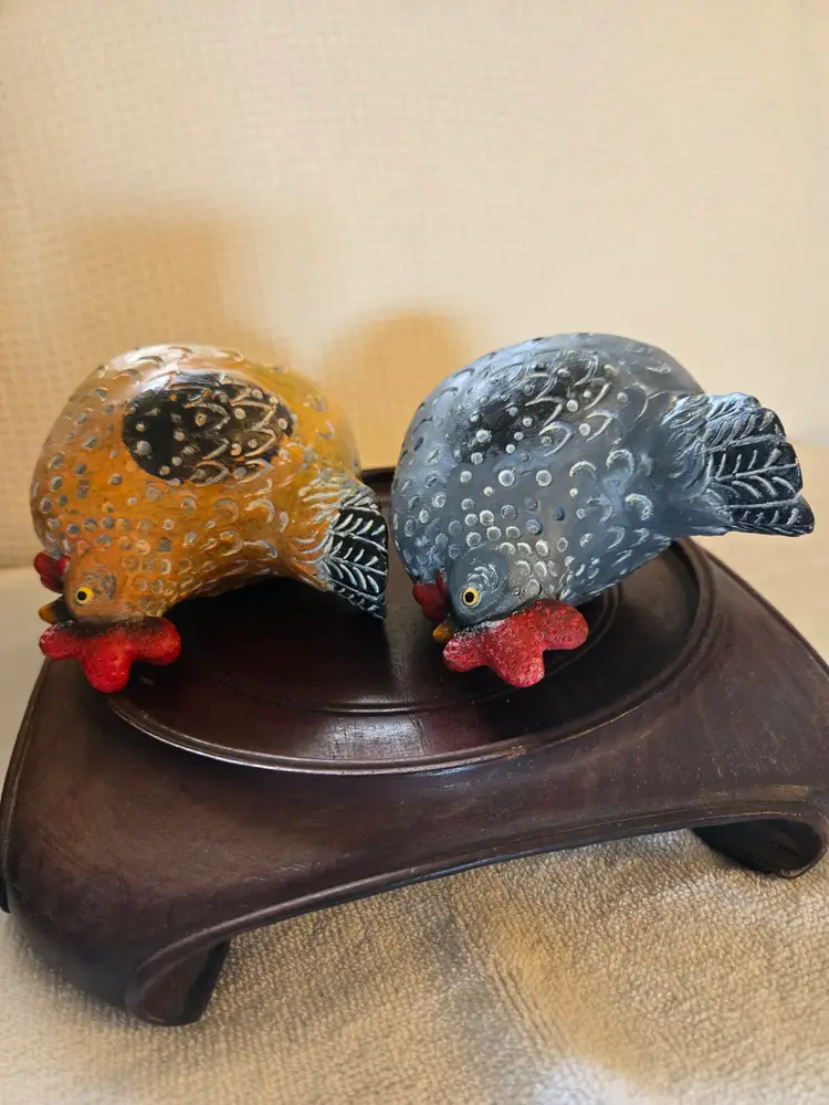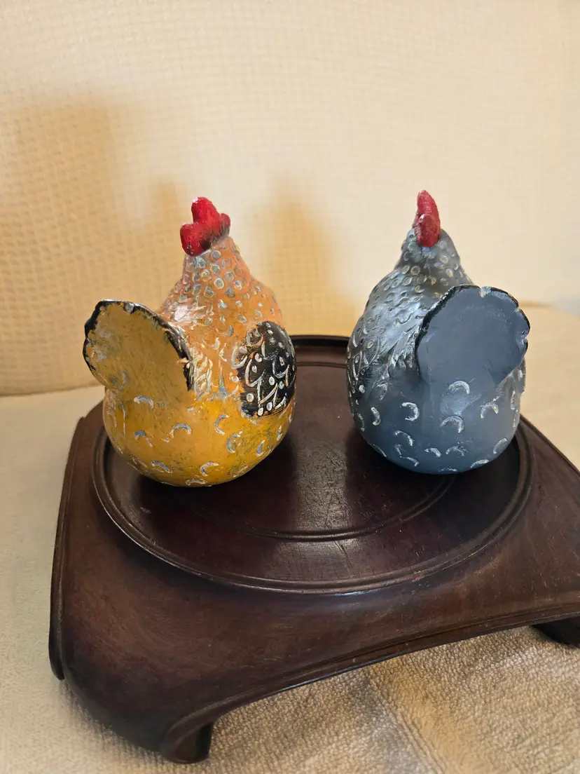 Cute little chickens. 1 is a gray-blue, the other is a yellow-brown. Ceramic material with a speckled design. 4 1/4" tall and 5 1/4" wide. So cute in any decor. No chips cracks, or repairs.